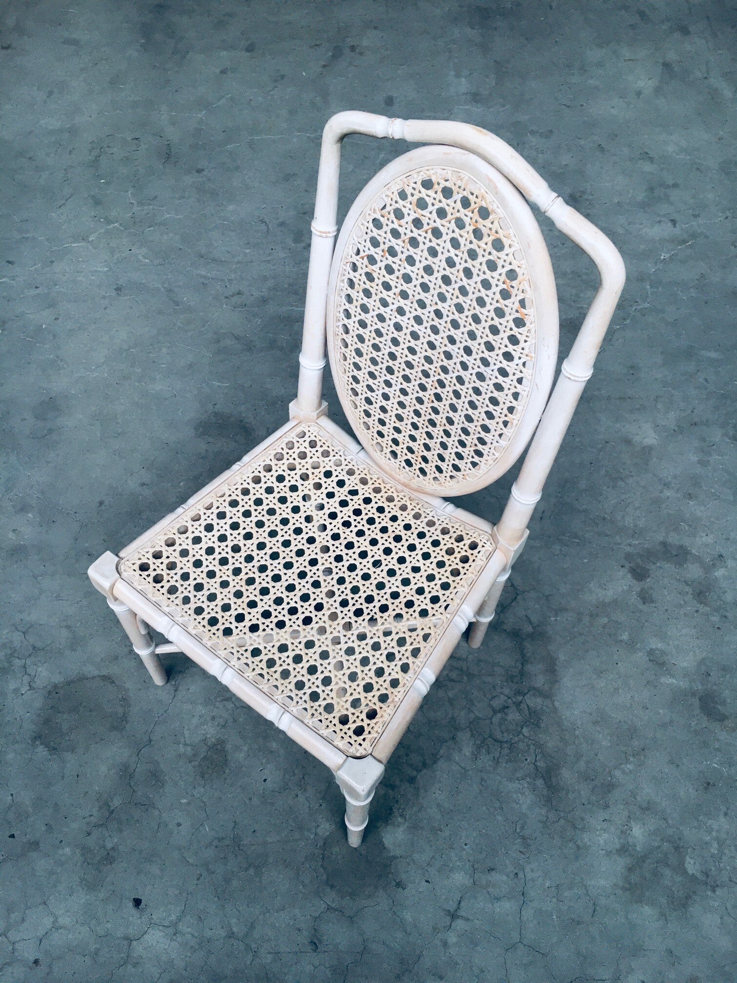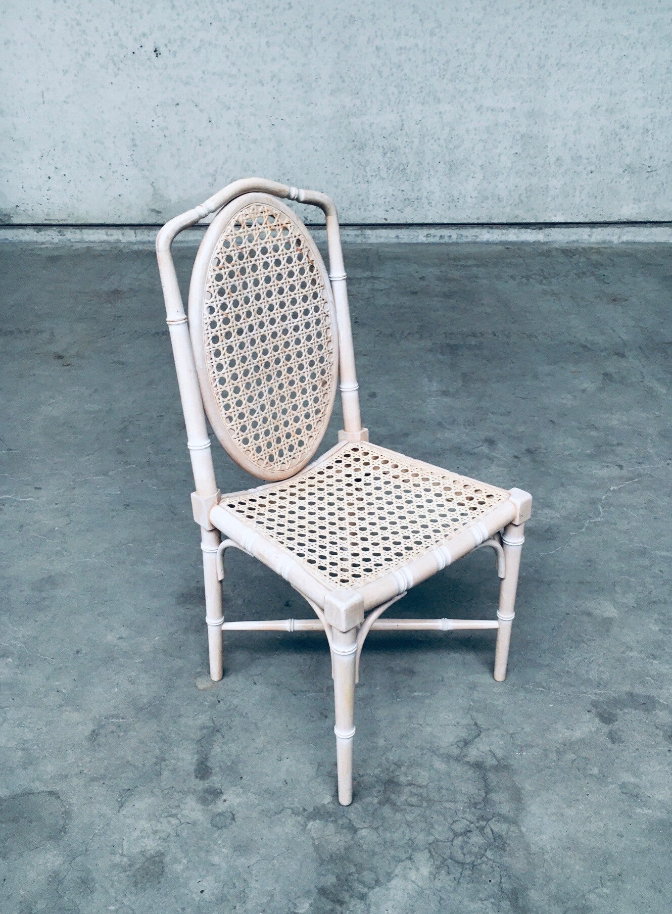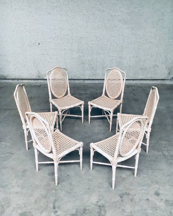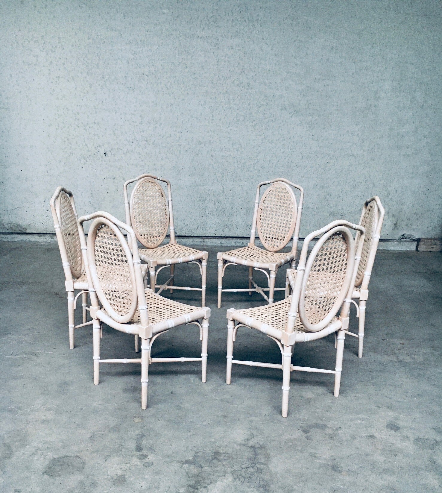 Vintage Chippendale Style Design set of 6 Faux Bamboo Dining Chairs. Made in the 1990's. Light white beige stained wood construction with webbing seat and back. All chairs are in good condition with patina from their age. Each chair measures 49cm x 97cm x 45cm.