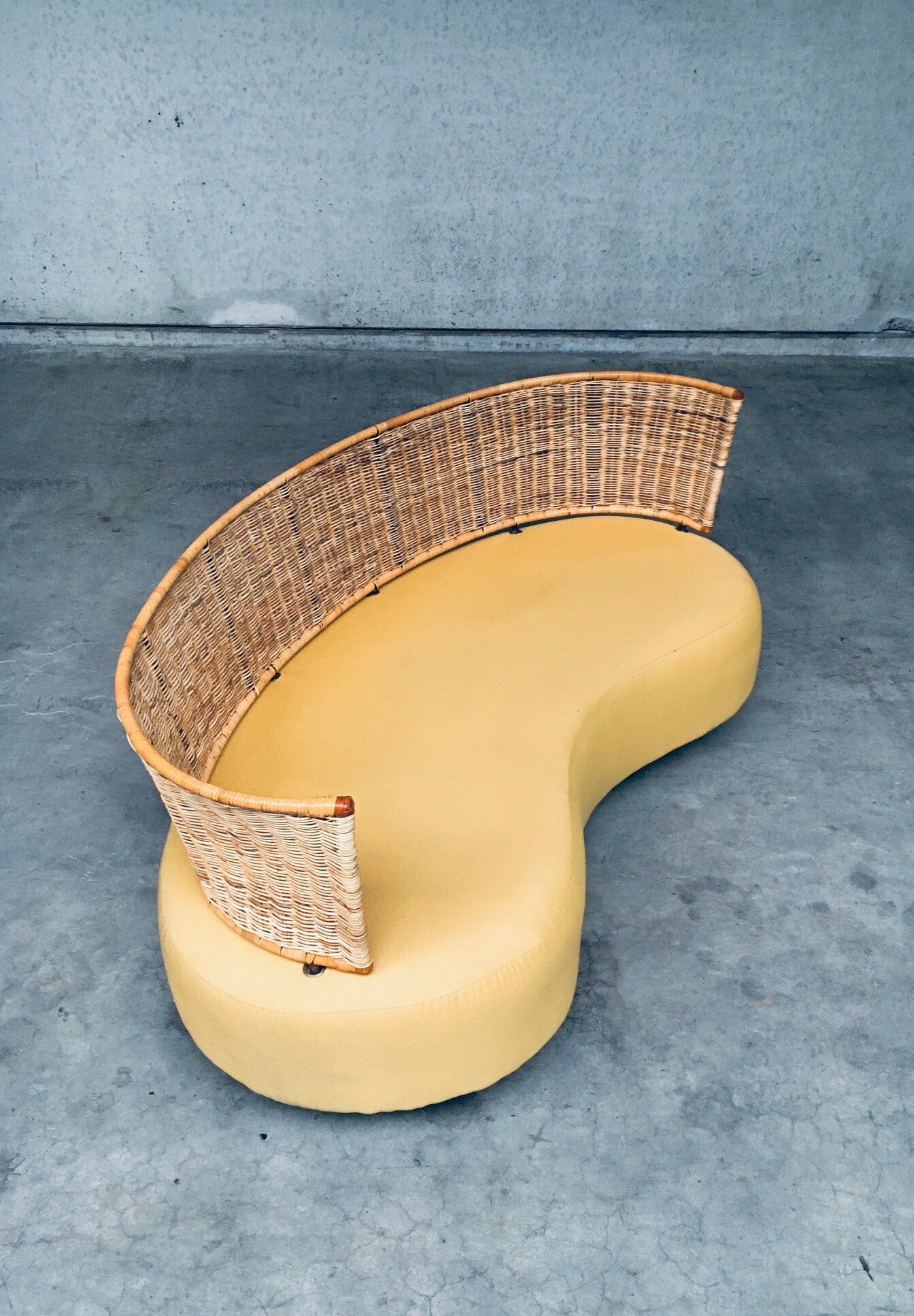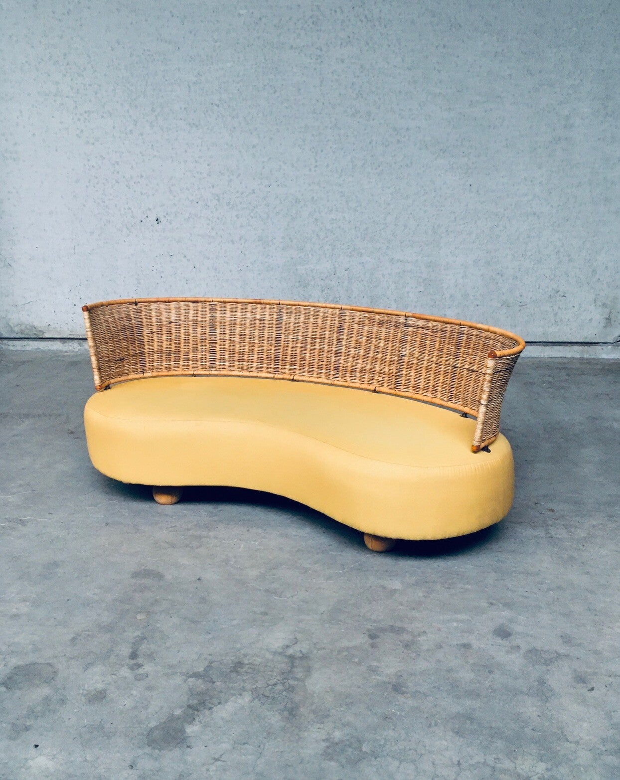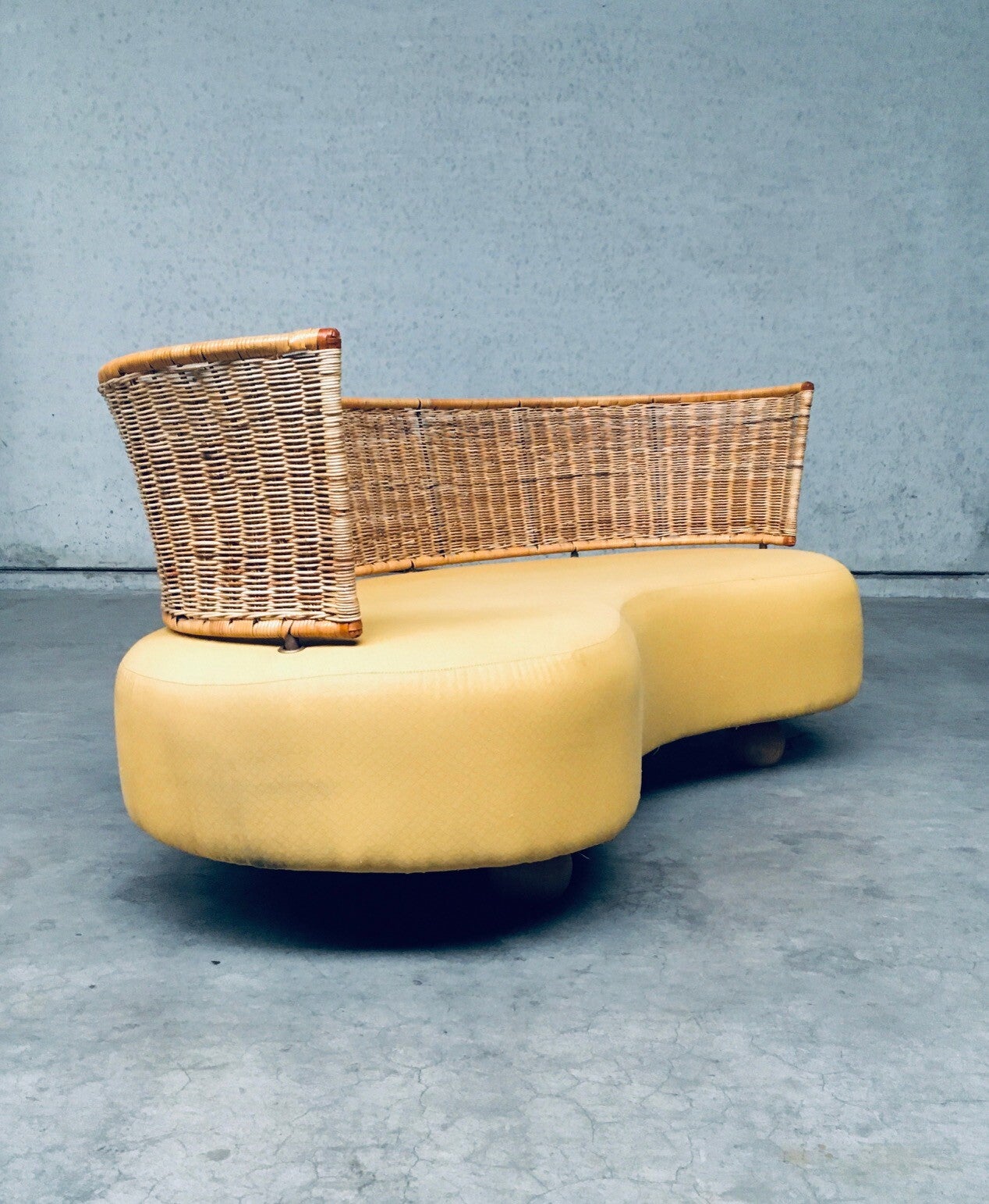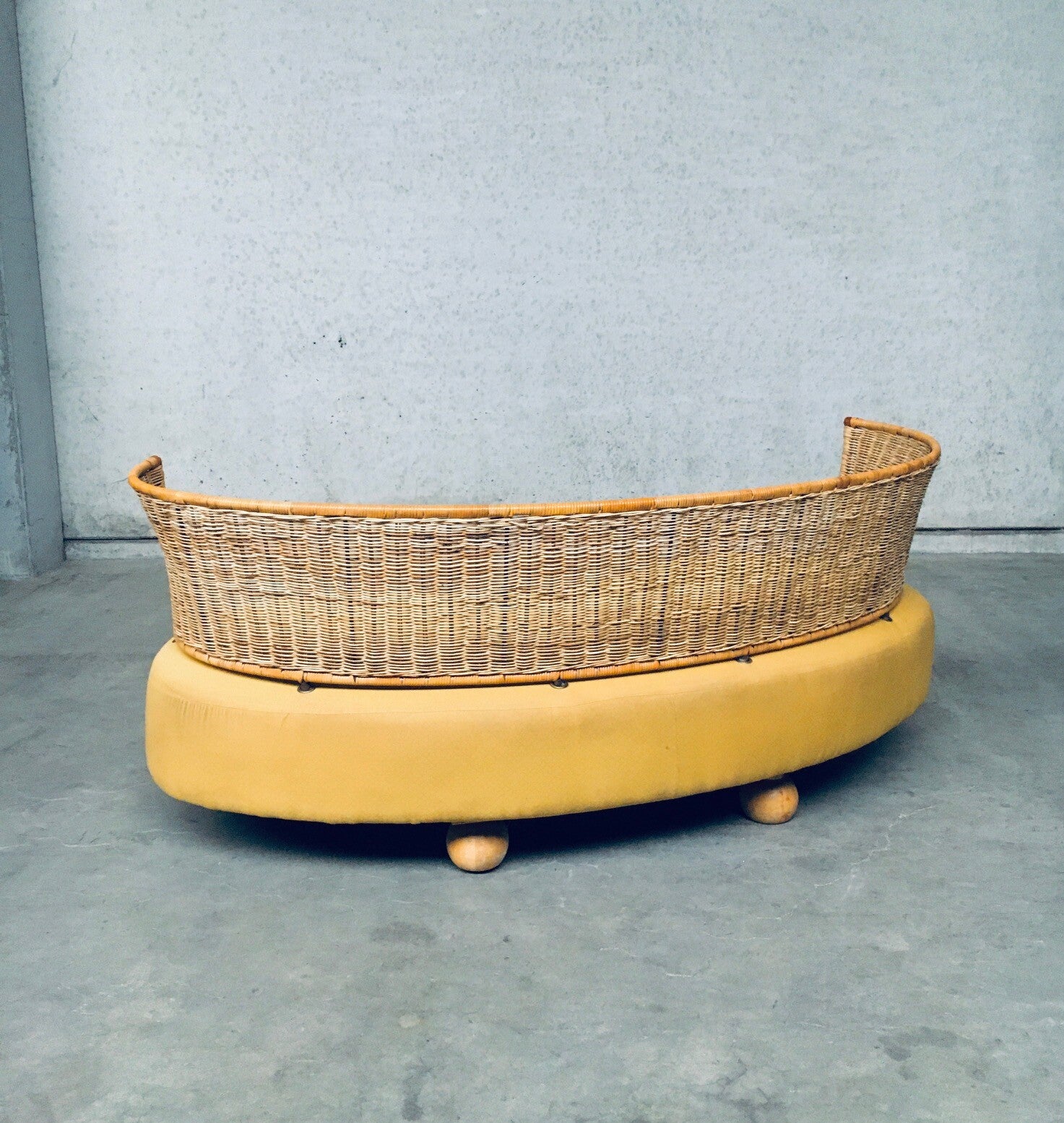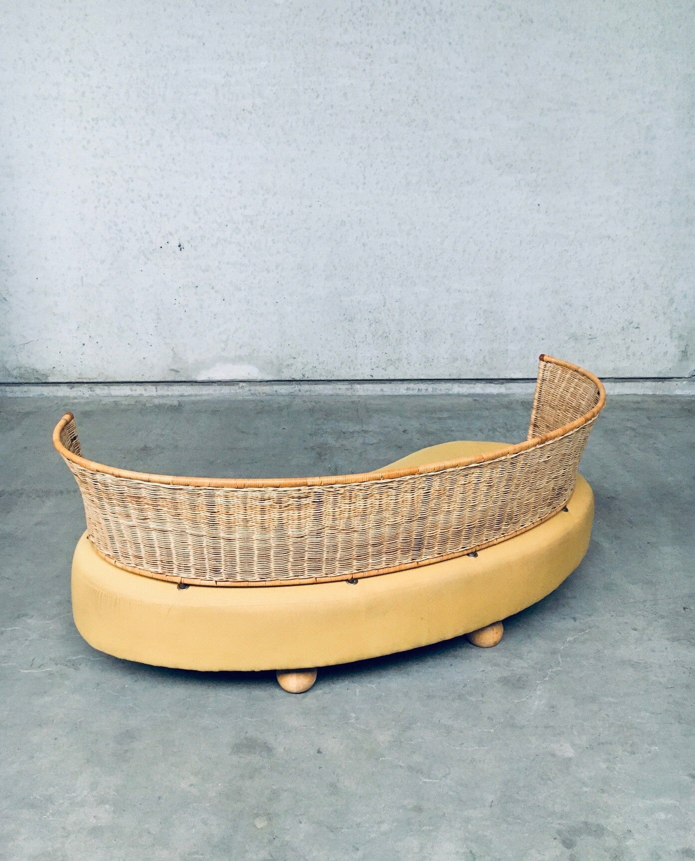 Vintage Postmodern Design Serpentine Sofa with Rattan Back. Made in the 1980's. Banana seat model on wooden ball feet. Rattan wicker back with leather finished ends. The yellow fabric seat has some staining. In overall good condition. Measures 85cm x 190cm x 105cm.