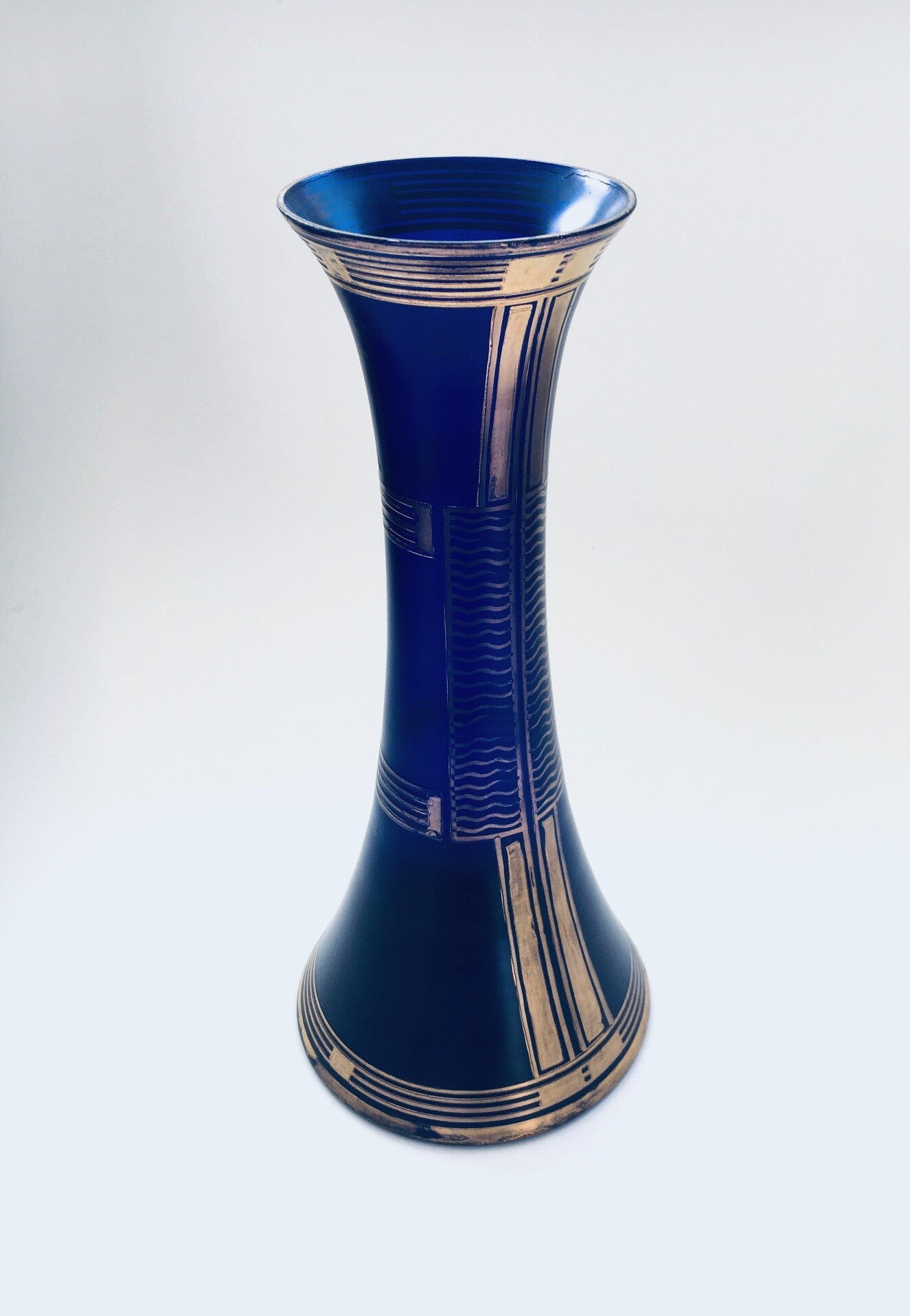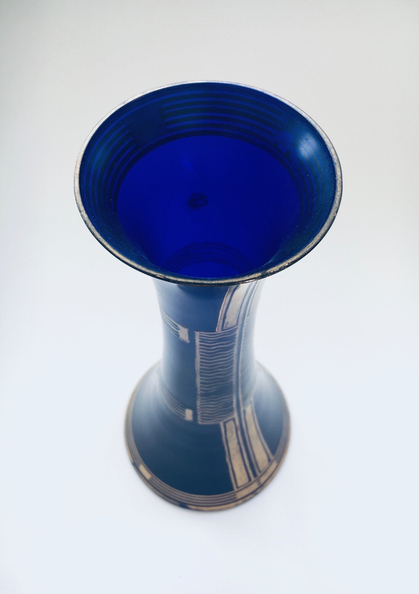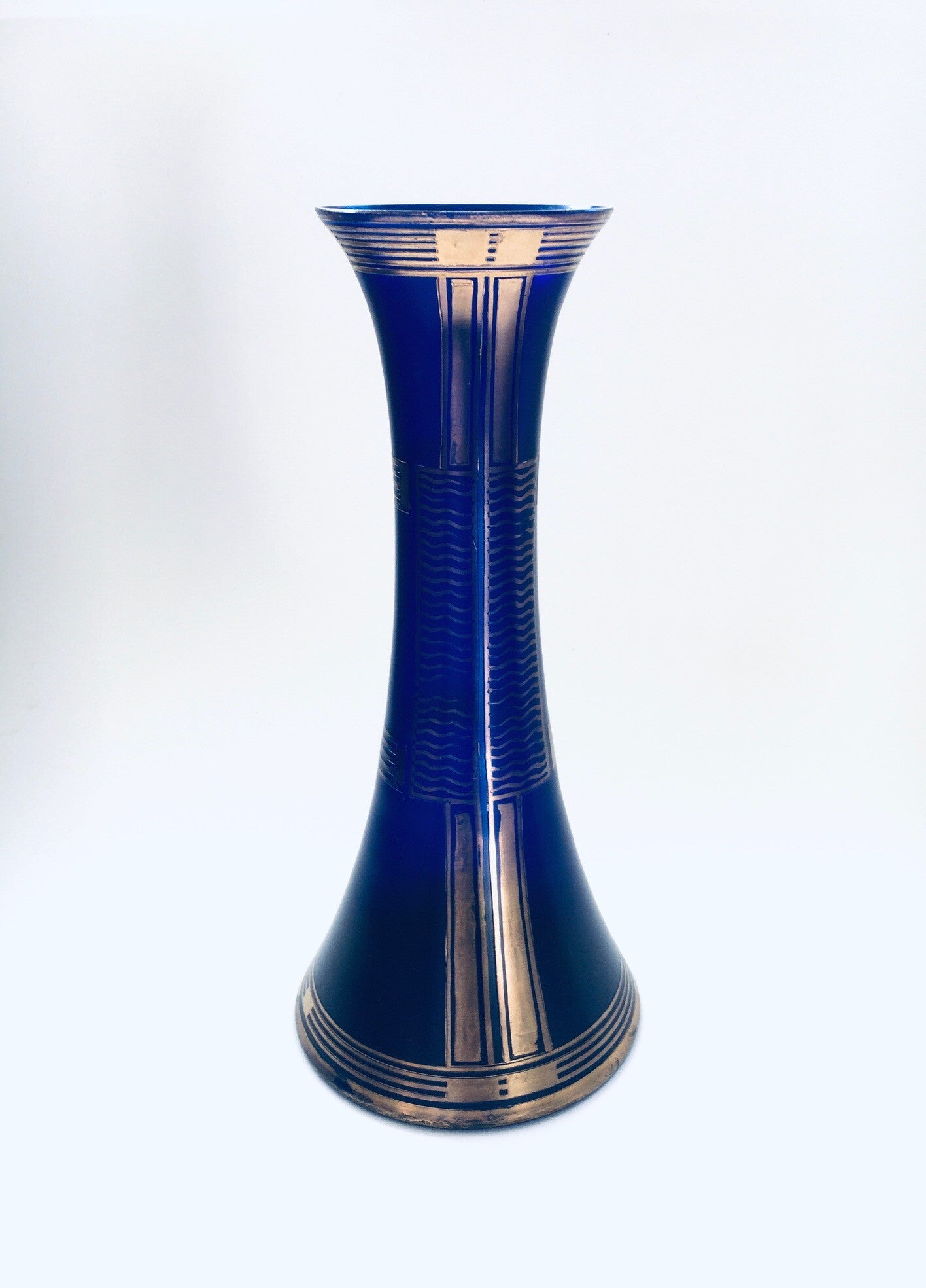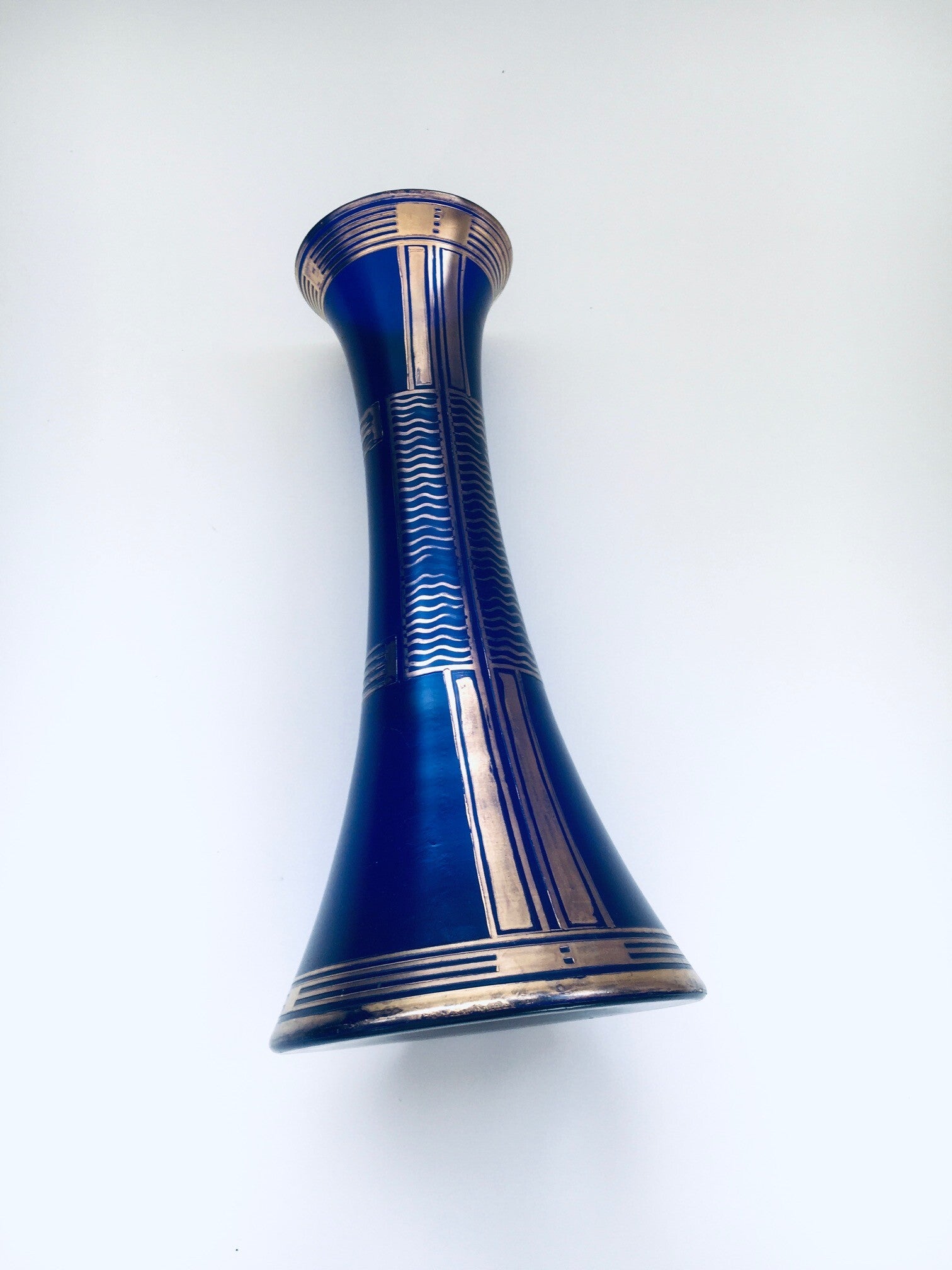 Art Deco Design Blue Glass Horn Vase with Gold Trim, Belgium 1920's