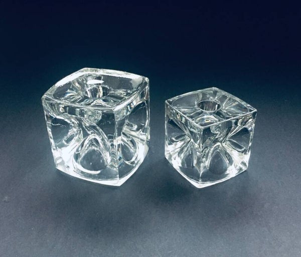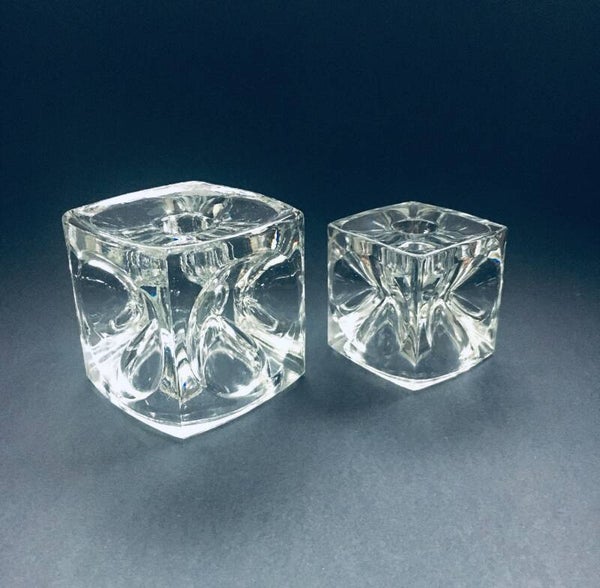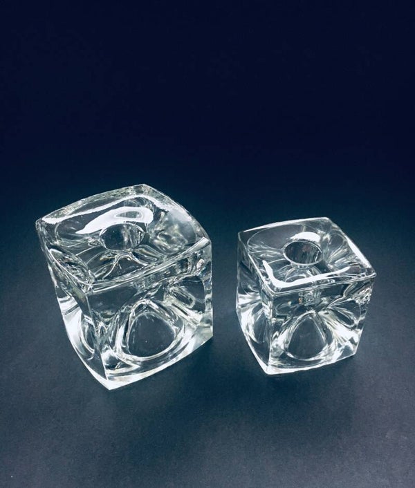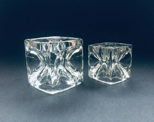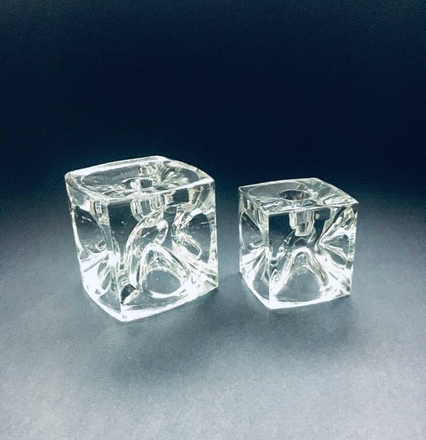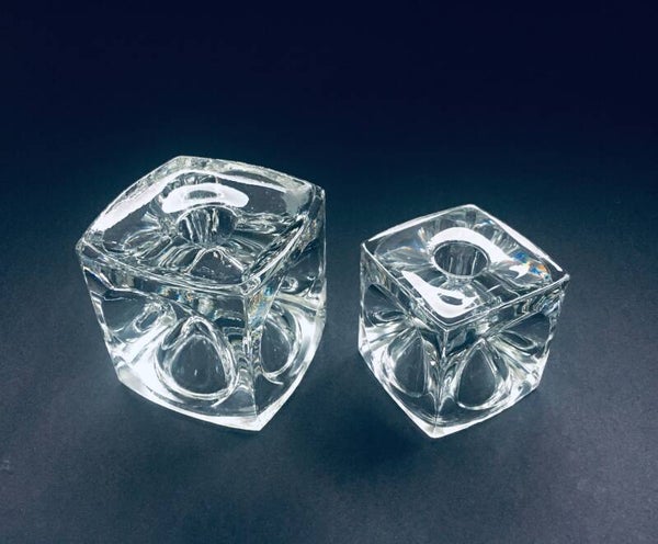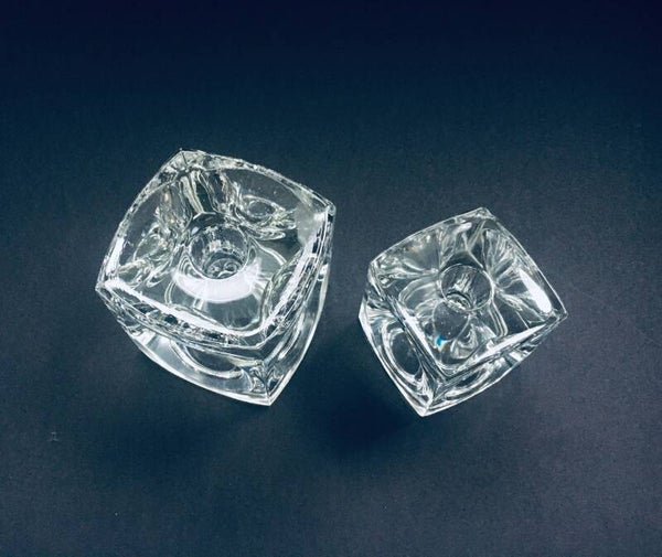 Vintage Midcentury Modern Design Bohemian Glass Cube Candle Holder set by Rudolf Jurnikl for Rudolfova Hut, Sklo Unie, made in Czech Republic 1960's / 1965. Clear Glass Ice Cube Optic Glass candle holders. Large and small model. Both are in very good condition. Measurements: Large: 9cm x 9cm x 9cm, Small: 7cm x 7cm x 7cm.