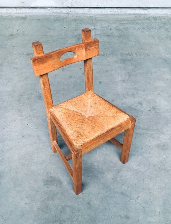 Vintage Brutalist Rustic Design Oak Dining Chair Set, made in Belgium 1960's. Solid oak constructed chairs with rush seats. These are all in very good, original condition. Each chair measures 45cm x 87cm x 45cm.