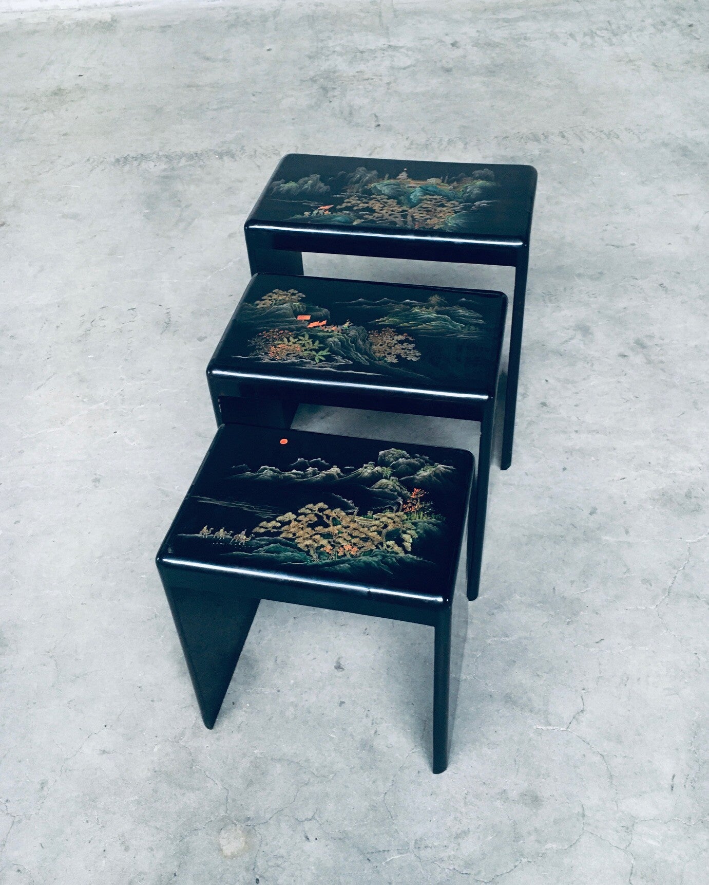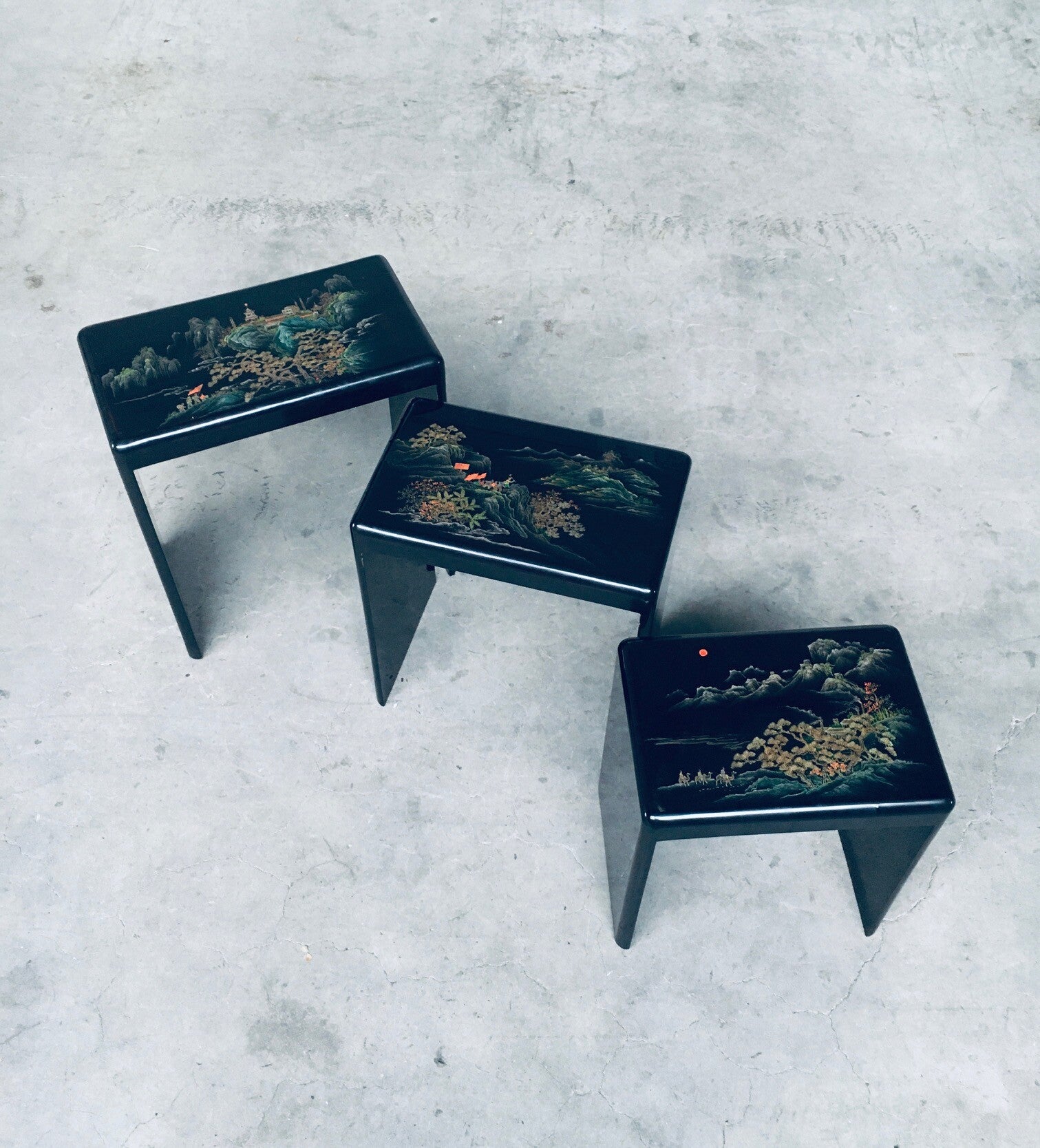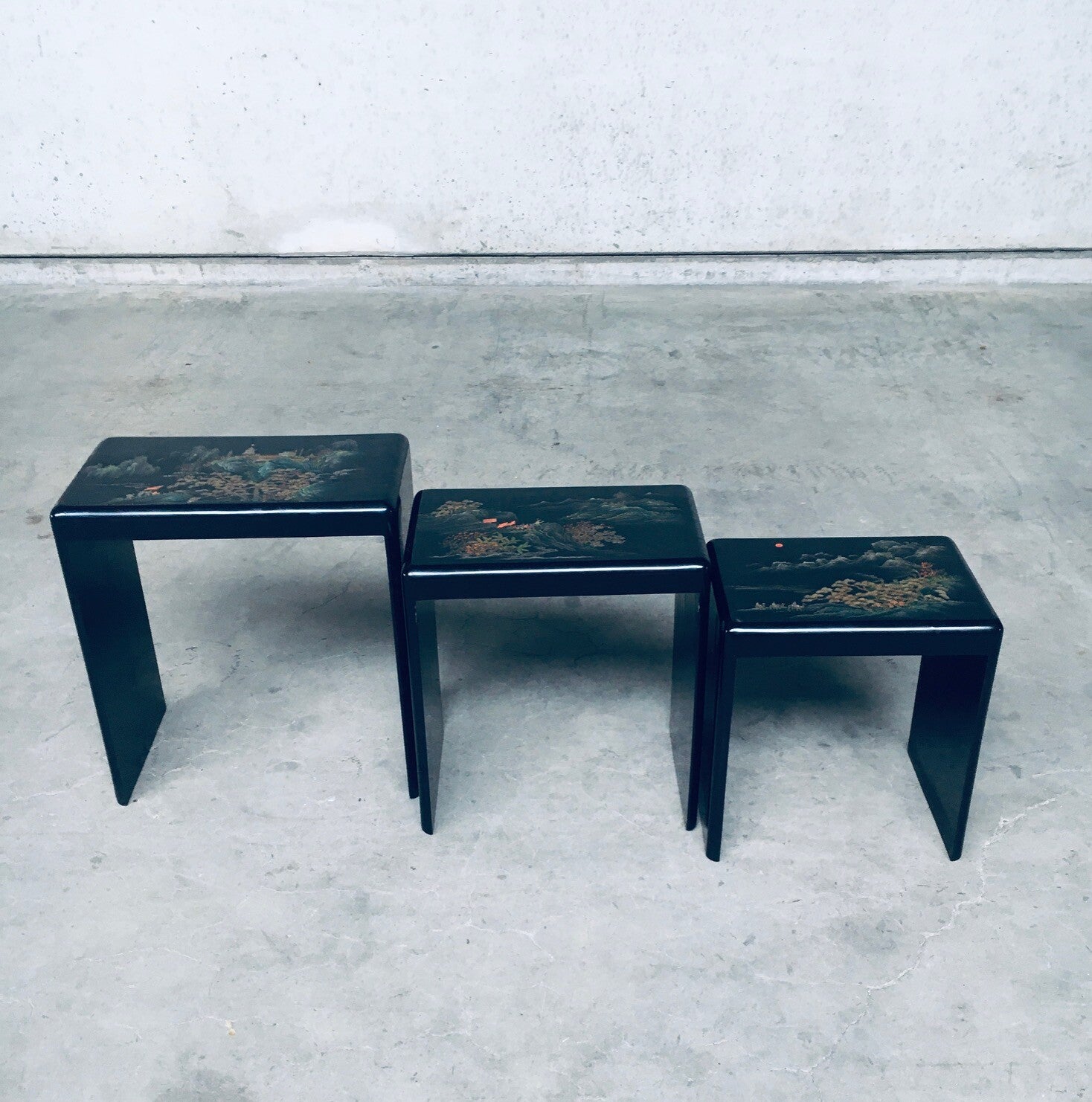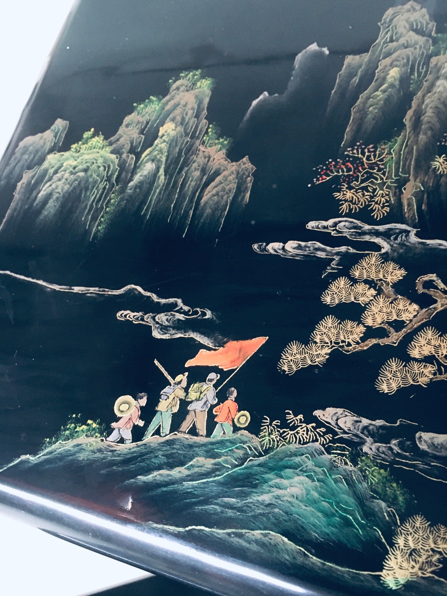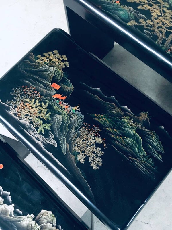 Vintage Rare Nesting Table Set, made in the People's Republic of China, 1950's. Black laquered wood constructed tables with colored drawings depicting Revolutionary images like a Red star, Red Flag, Grey green uniforms, workers astride, industry ... a period piece with rare imagery of the Mao Tse Tung era.