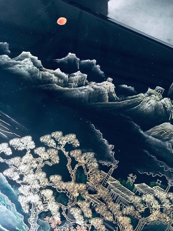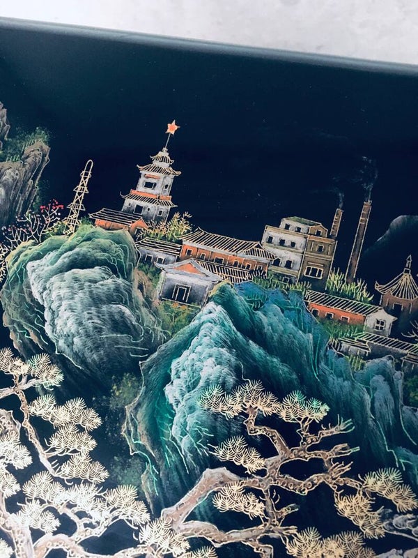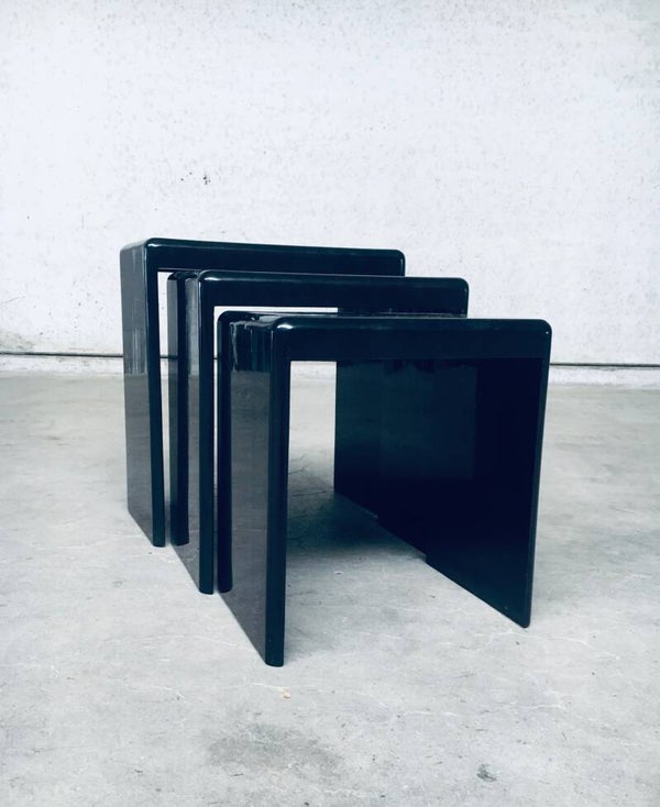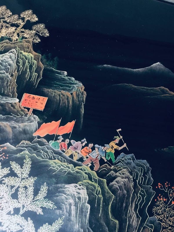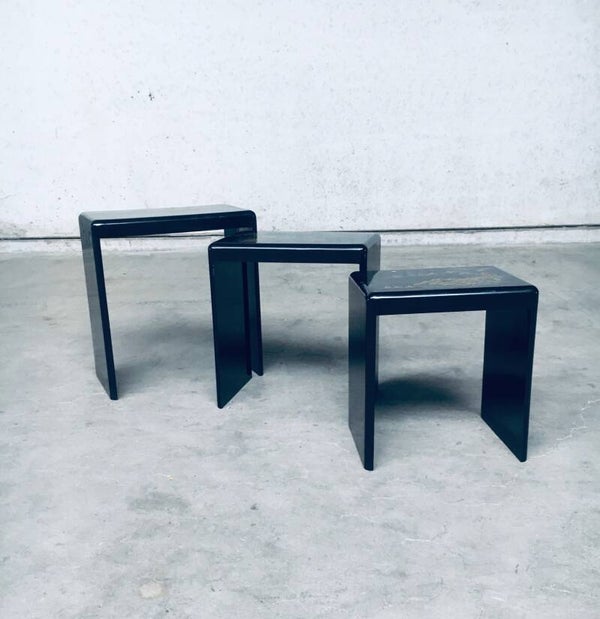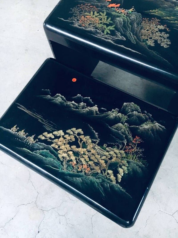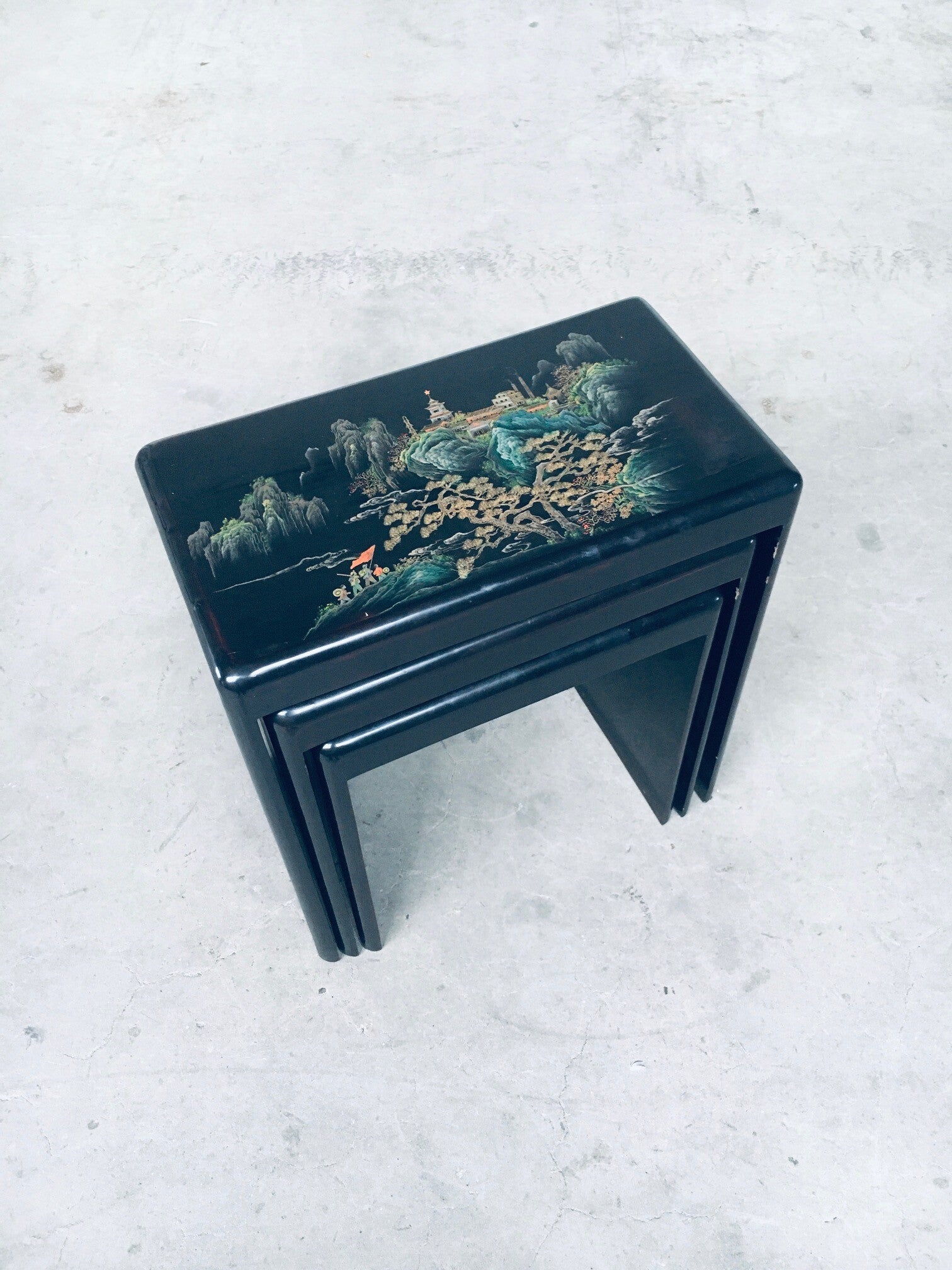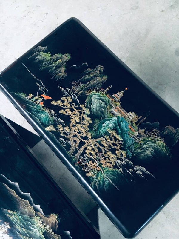 Vintage Rare Nesting Table Set, made in the People's Republic of China, 1950's. Black laquered wood constructed tables with colored drawings depicting Revolutionary images like a Red star, Red Flag, Grey green uniforms, workers astride, industry ... a period piece with rare imagery of the Mao Tse Tung era.