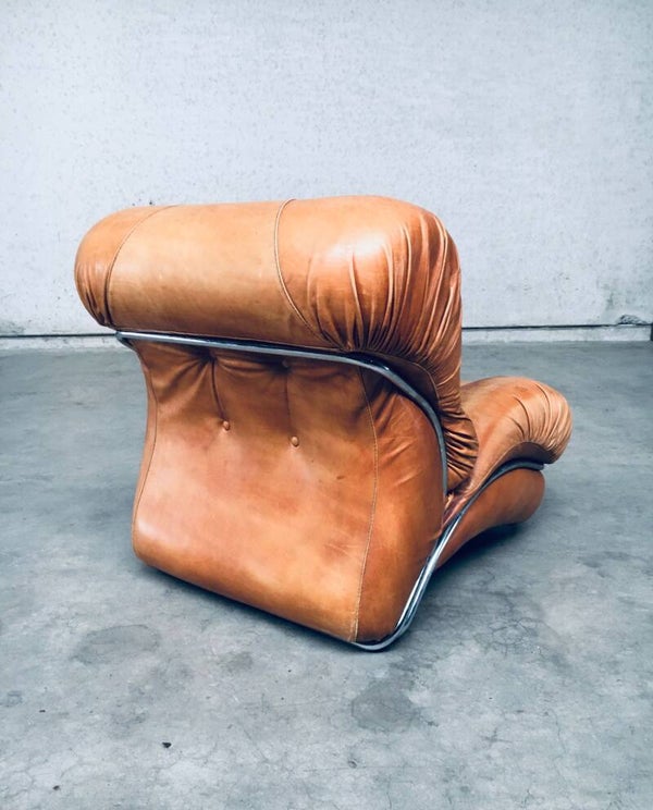 Vintage Midcentury Modern Italian Design 'COROLLA' Leather Sectional Sofa by I.P.E. Italy 1970's. Cognac leather on chrome metal frame with detachable arm rests on 2 sofa parts. 5 sectional parts; 4 chairs and 1 corner chair. Awesome patination on the entire sofa. But overall in good conditon, and ready for use. Very soft seating. All chairs are very patinated by their use. On one there has been repairs for torn leather. See pictures for condition. 1 Sofa element measures 76cm x 84cm x 94cm. The corner element measures 138cm x 84cm x 100cm.