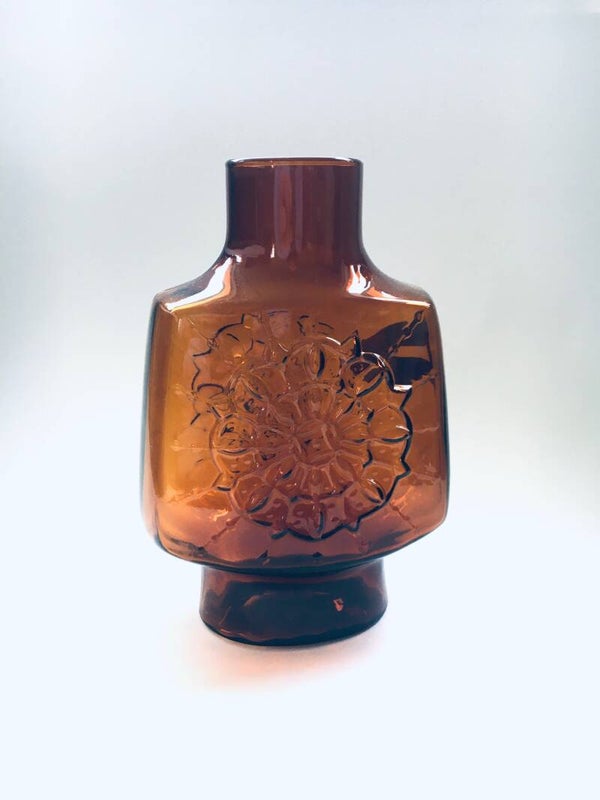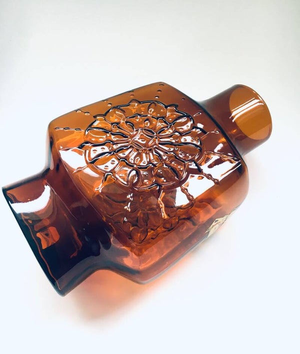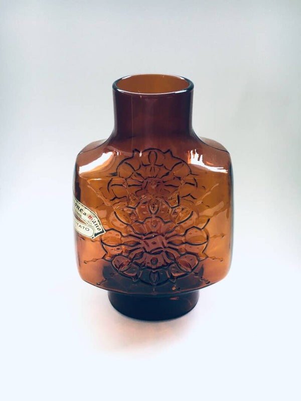 Vintage Midcentury Modern Design Empoli Amber Glass Lower Model 'STAR BURST' Vase. Made in Toscana, Italy 1960's. Lavorazione a mano, fabbricato in Toscana, Italia - Mod. Depositato. Marked on original labels. Mold blown Art Glass Vase with Star Sun Burst Relief motif. In perfect condition. Measures 25cm x 17cm x 11cm.