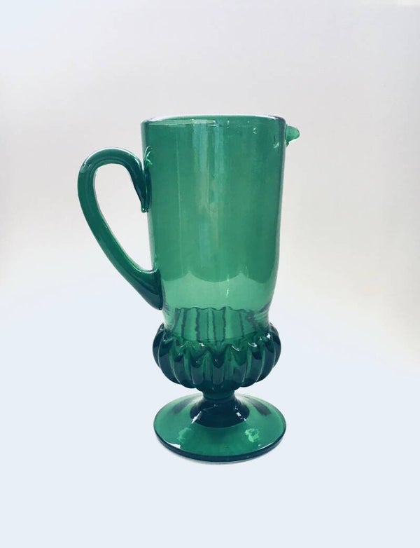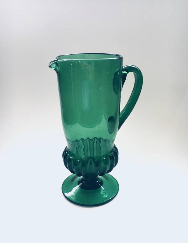 Vintage Handblown Green Glass Pitcher Decanter, made in France 1940's / 50's. Beautiful hand made shaped forest green glass pitcher vase. In very good condition. Measures 25,5cm x 18cm x 11cm.