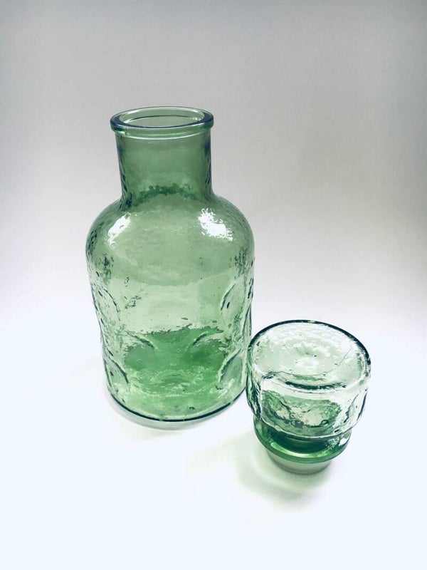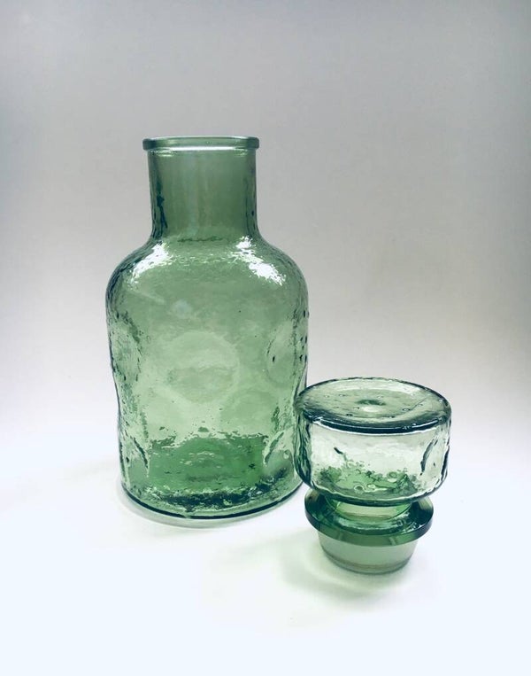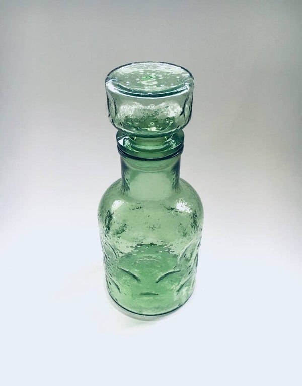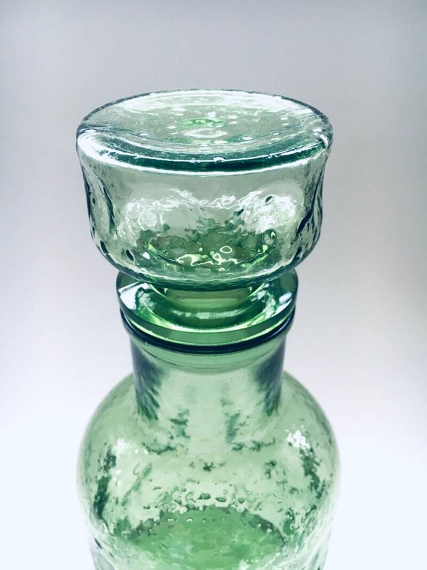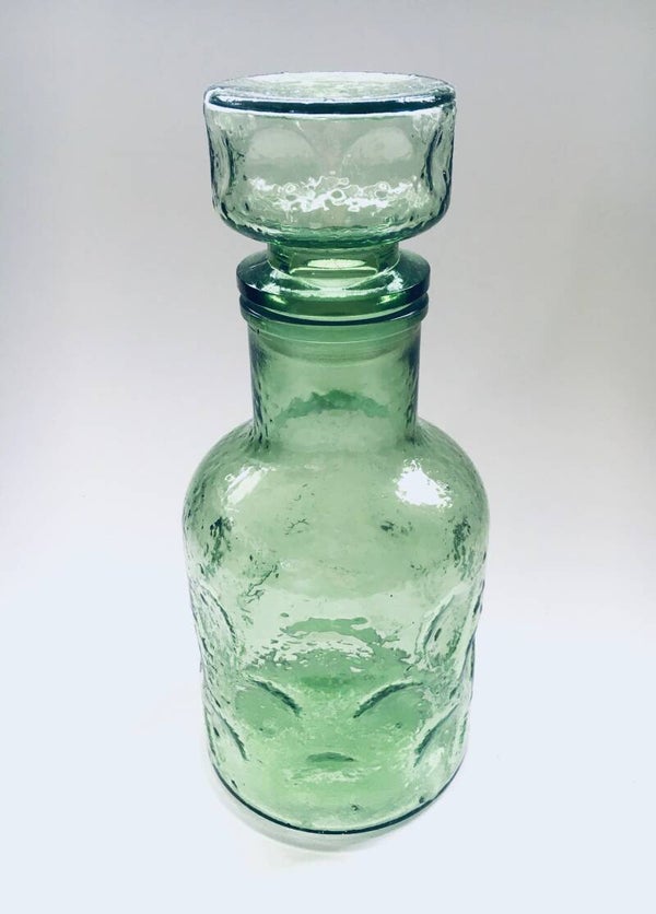 Vintage Midcentury Design Empoli Pinched Pale Green Glass Decanter Bottle with Stopper, made in Italy 1960's. Pale green pressed glass with dotted relief and pinched pattern. In very good condition. Measures (including stopper) 24,5cm x 11cm x 11cm.