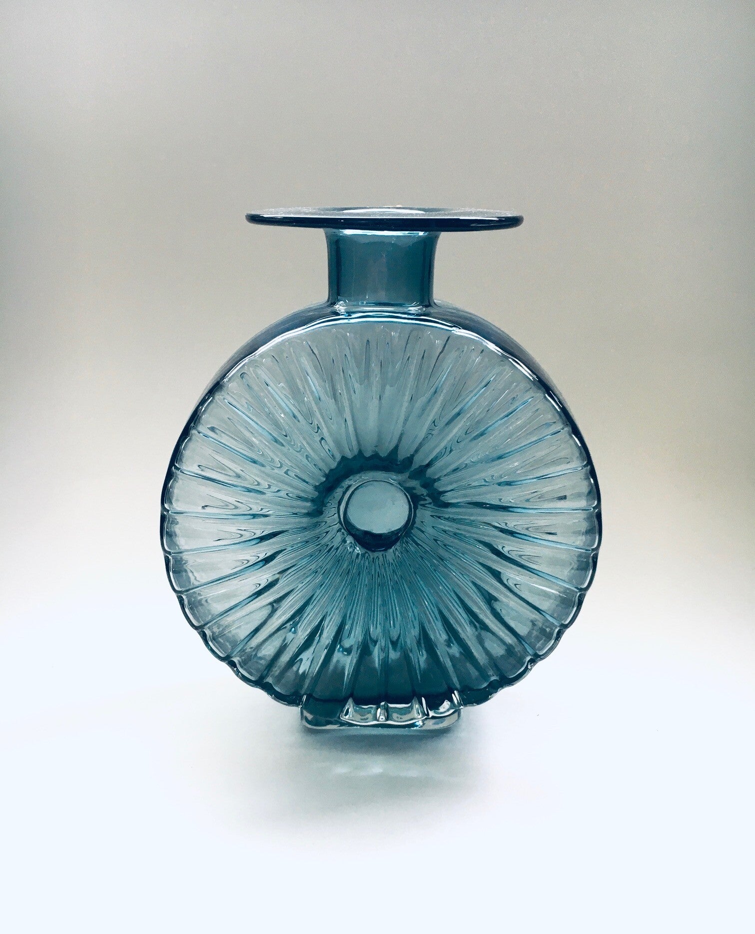 Vintage Midcentury Modern Scandinavian Design 'AURINKOPULLO' SUN Bottle Vase by Helena Tynell for Riihimaen Lasi, made in Finland 1960's. Designed in 1964. Has it's original FINNCRISTALL label. Prussian blue pressed glass decanter bottle vase. In very good condition. Measures 22cm x 17,5cm x 10,5cm.