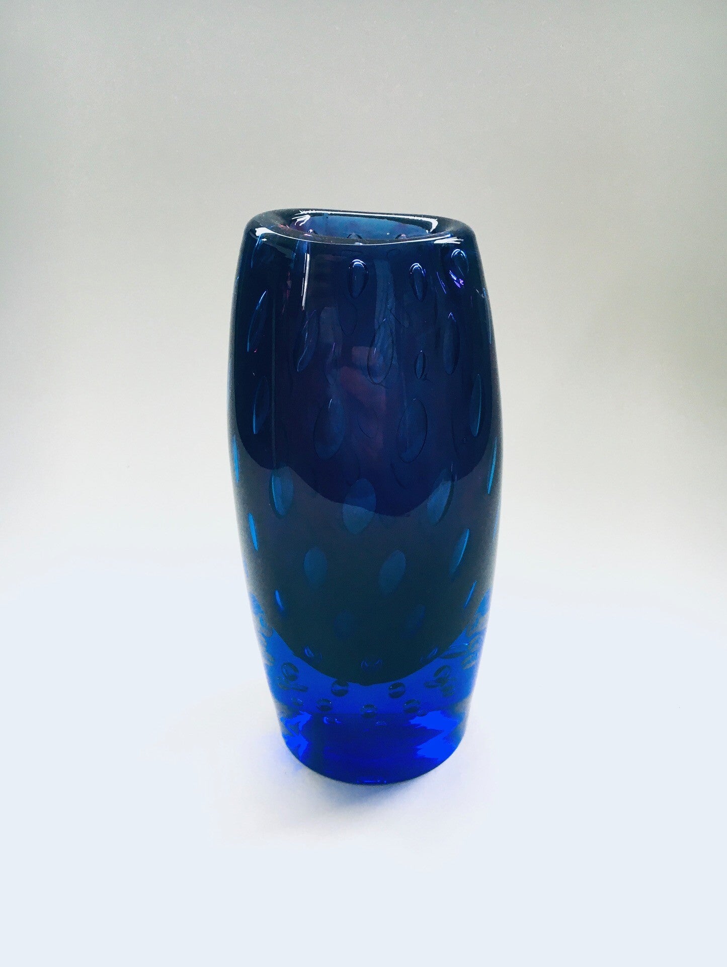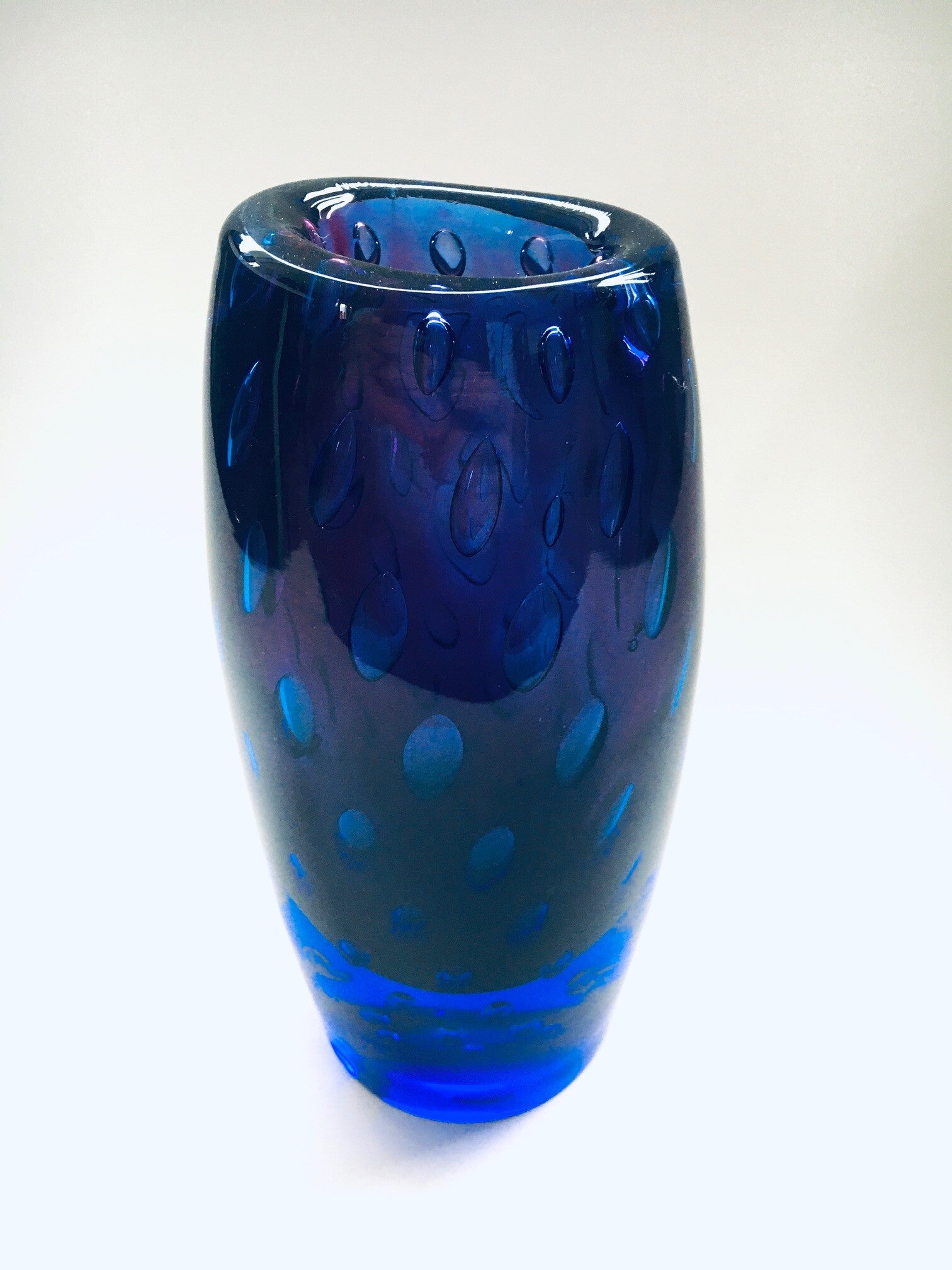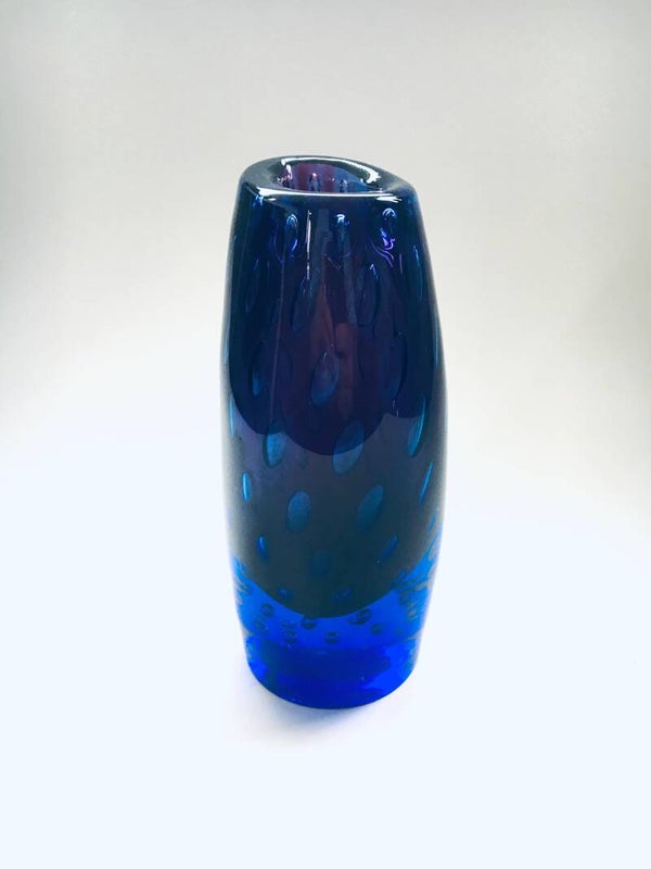 Modern Art Glass Bullicante Vase in Deep Blue and Purple Colors. Degrading bubbles inside the glass, from the bottom up to the top, from small to large bubbles. Handblown Art Glass piece. No maker or artist markings. Heavy glass piece in very good condition. Measures 19cm x 9cm x 8cm.