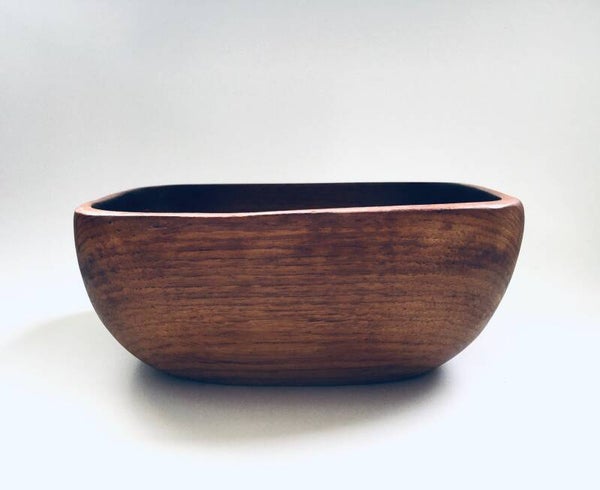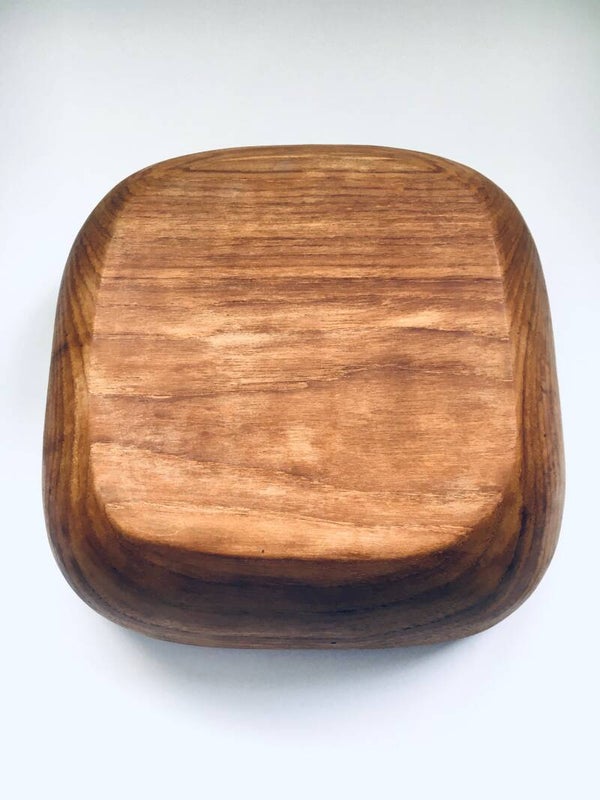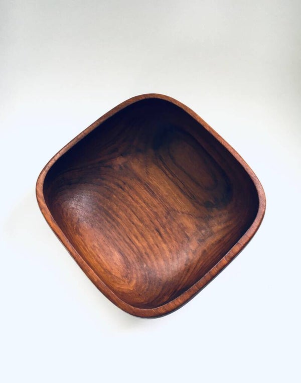 Vintage Midcentury Scandinavian Design Teak Wooden Salad Bowl, made in Denmark 1960's. Square rounded shaped teak wood bowl, made out of a solid piece of wood. In very good condition. Measures 10,5cm x 25cm x 25,5cm. (Spoons not included - seperate for sale)