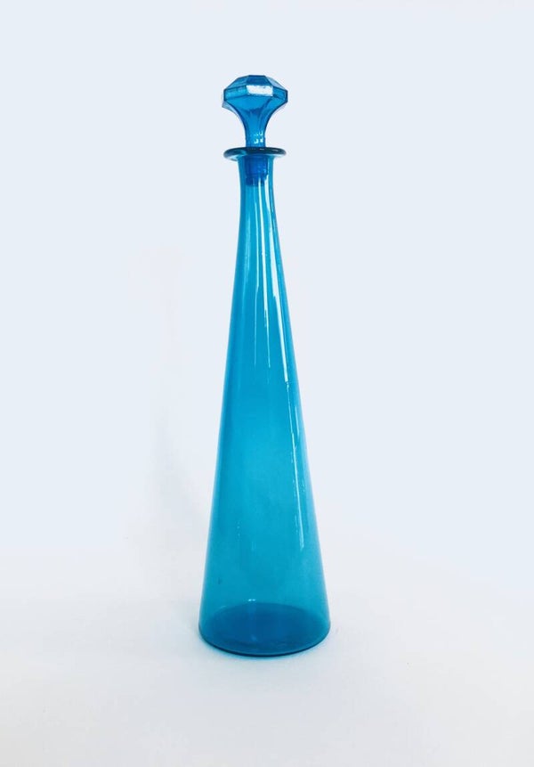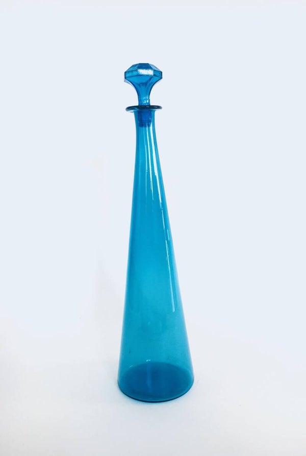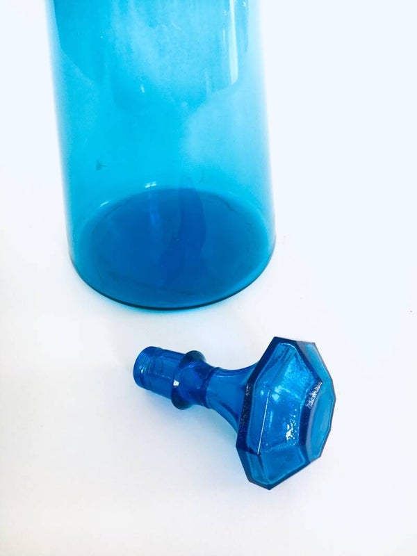 Midcentury XL Empoli Glass Blue Decanter Bottle w Stopper, Italy 1960's