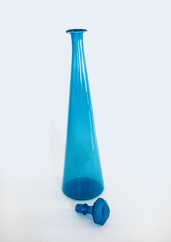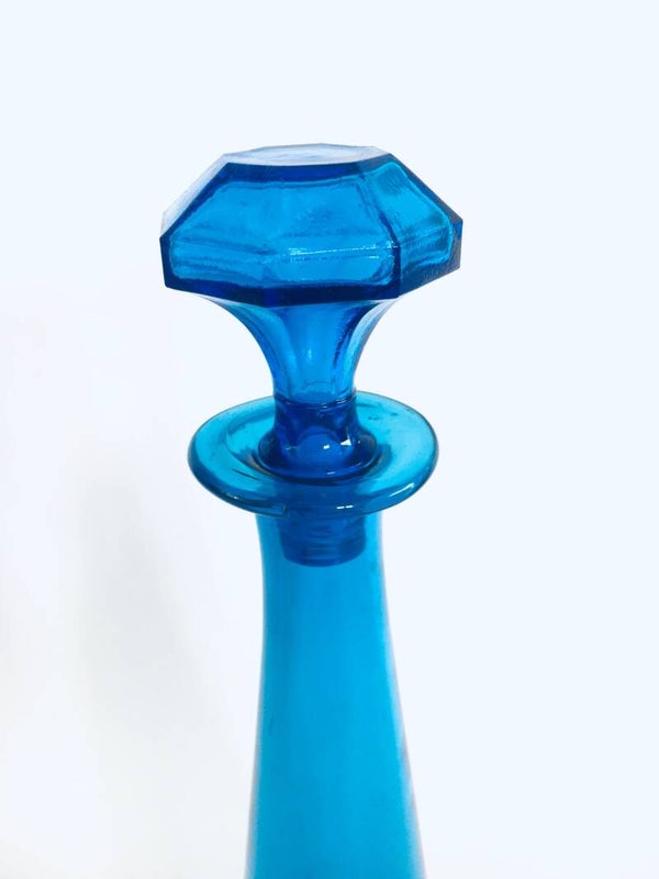 Vintage Midcentury Modern Italian Design Empoli Glass Blue Decanter Bottle with Stopper, made in Italy 1960's. Pressed blue glass triangular decanter with diamond shaped stopper. In very good condition. Measures (including stopper) 57cm x 14,5cm x 14,5cm.