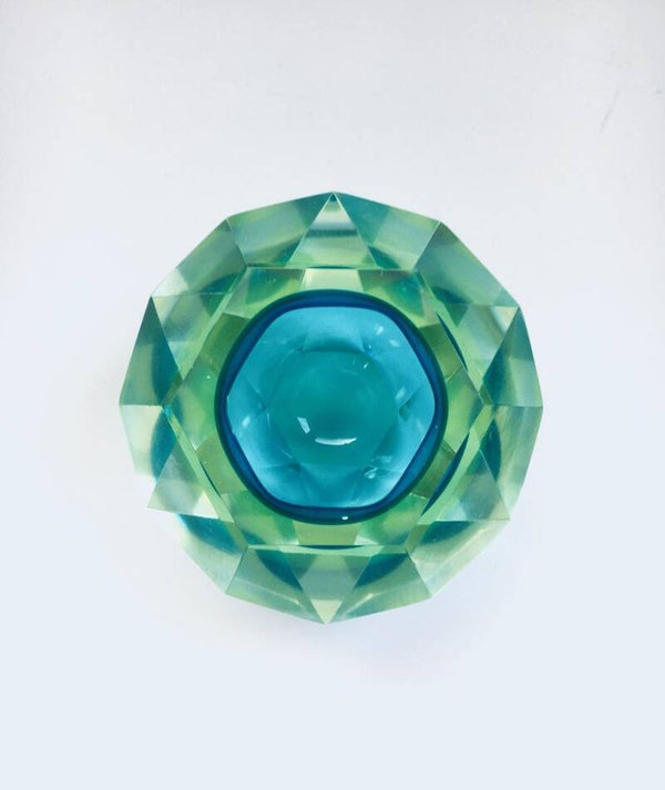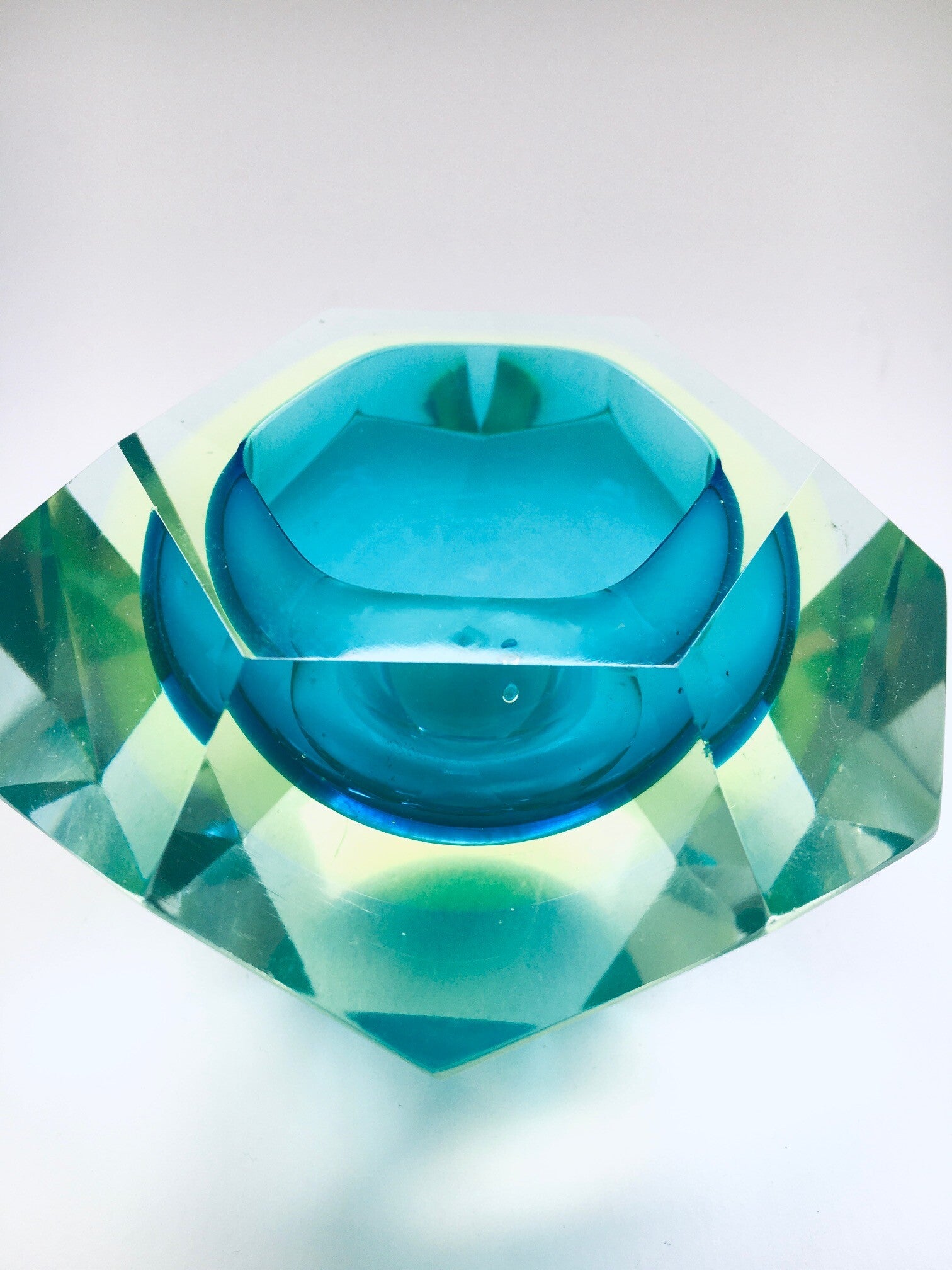 Vintage Midcentury Modern Italian Art Glass Facet Bowl in Sommerso by Mandruzzato, made in Murano Italy 1960's. Facet cut turquoise and yellow-green inside clear glass. Diamond shaped facet cut heavy glass bowl. In very good condition. Measures 7cm x 12cm x 12cm.