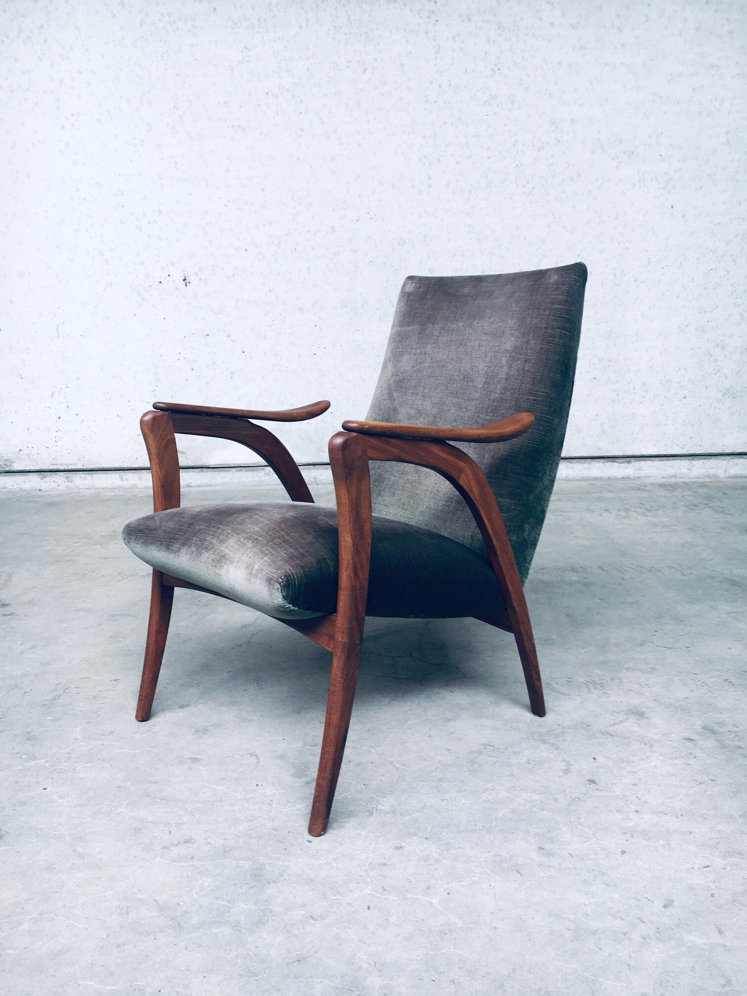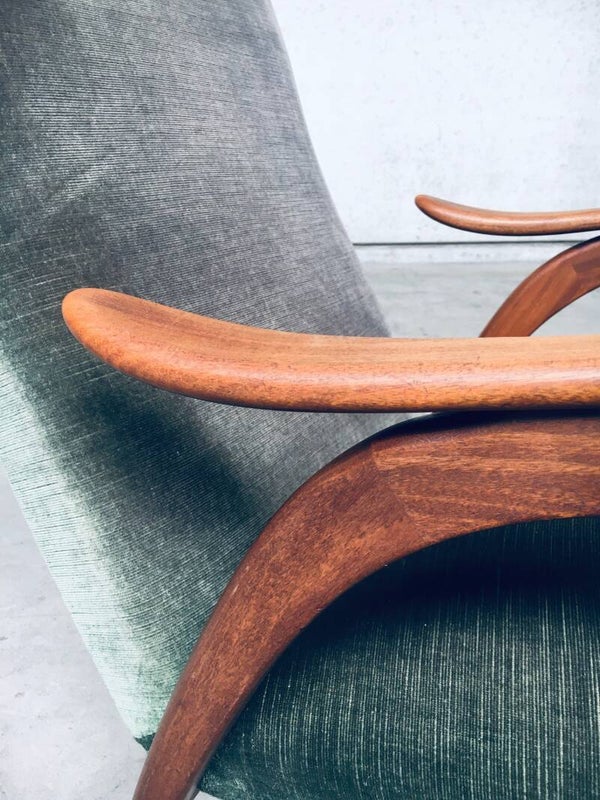Vintage Midcentury Modern Dutch Design Armchair, made in the Netherlands 1950's. In the style of Wébe or De Ster Gelderland. Hardwood frame with floating armrests and kaki green velvet fabric. All original and in very good condition. Measures 84cm x 62cm x 76cm.