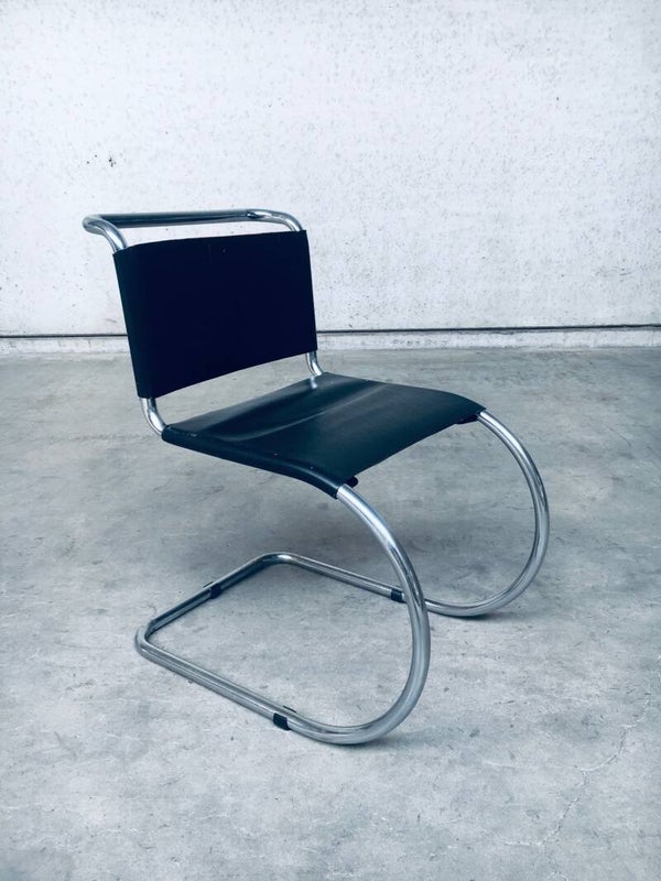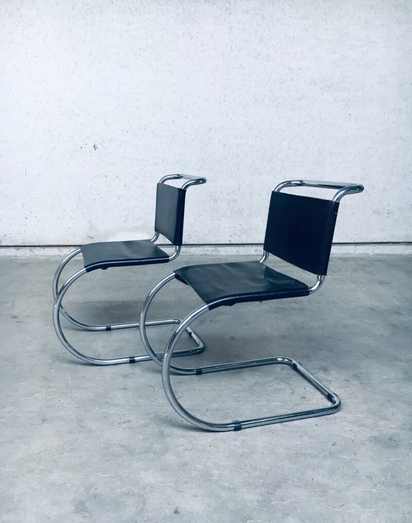 This 1927 design icon features chrome-plated tubular steel with cantilever seating from the mind of Ludwig Mies van der Rohe. Mies incorporated a new material and a new technology in the use of the cantilever principle. Mies van der Rohe began his career in architecture in Berlin, in the mid-1920s, later he began to design furniture, pieces that he conceived and created for particular interiors. In 1927, he met Lilly Reich, a Bauhaus alumnus who collaborated with Mies on his first versions of a cantilevered chair with a tubular steel frame. The cantilevered chair had a curved frame that exploited the aesthetic, as well as the structural possibilities of this material.