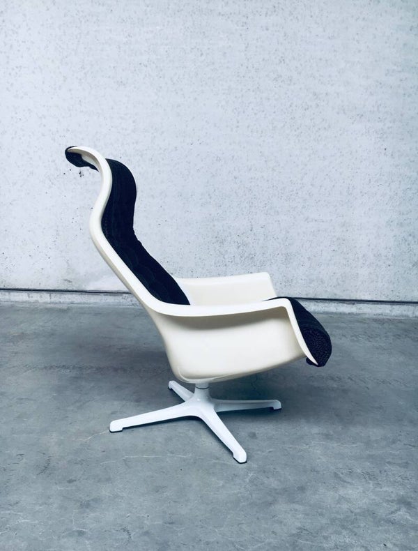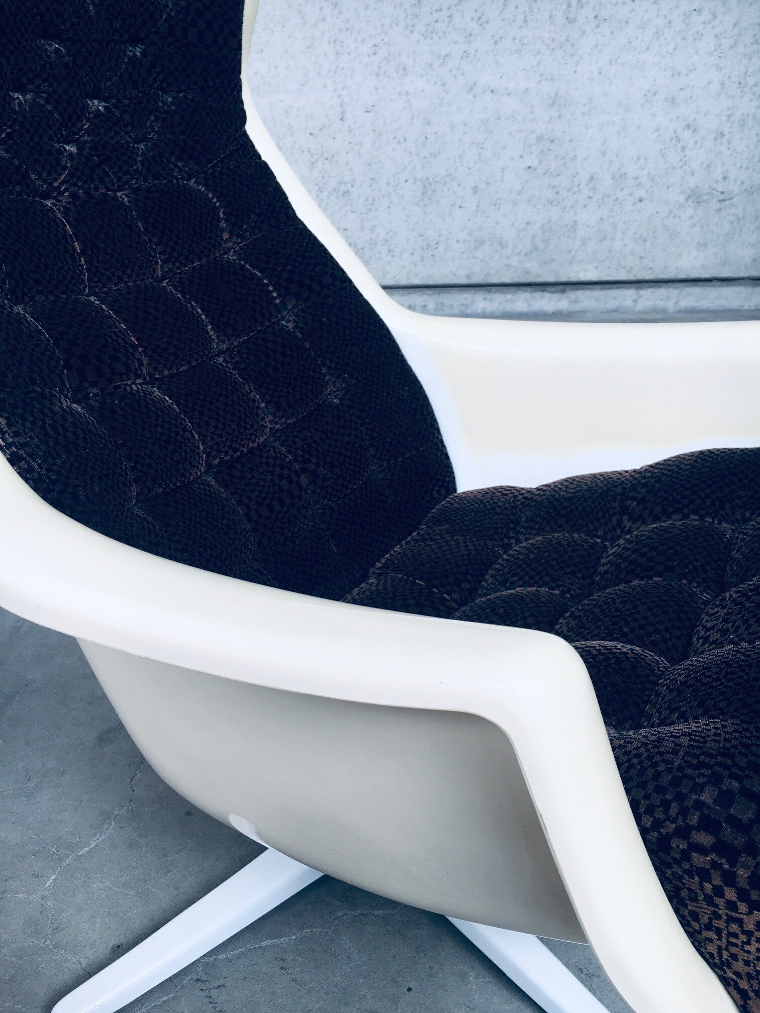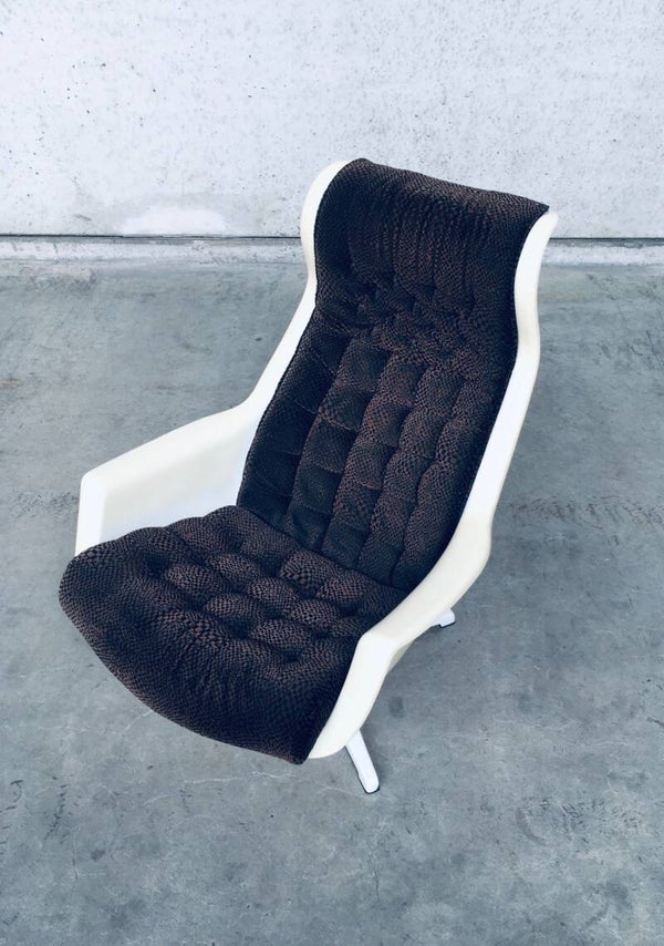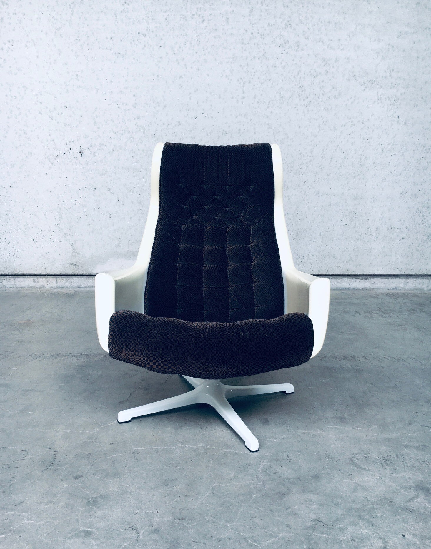 Vintage Midcentury Modern Scandinavian Design 'GALAXY' Lounge Chair by Alf Svensson & Yngvar Sandström for Dux, made in Denmark 1960's. Space Age Swivel lounge armchair in cream plastic with brown patterend fabric seat and back. All original, marked on the inside of the fabric. In very good condition. Measures 93cm x 70cm x 80cm.