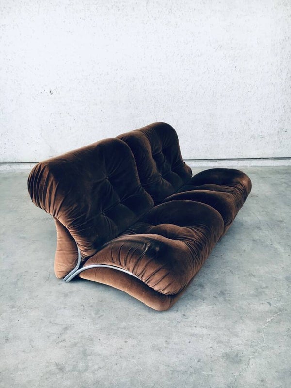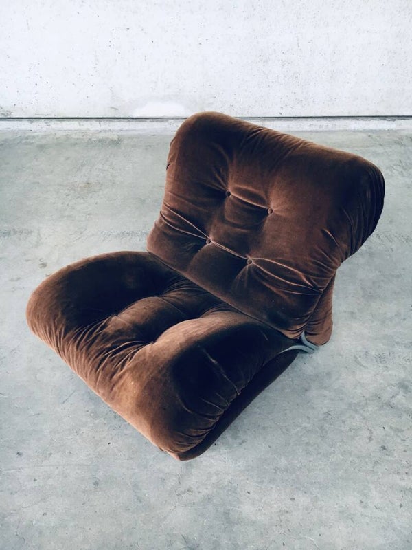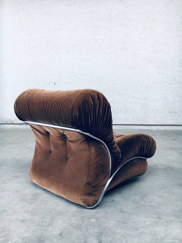 Vintage Midcentury Modern Italian Design Modular Sofa Armchair Lounge Chair Fauteuil set of 2 by IPE, made in Italy 1970's. 2 Armchairs which can be place together as a 2 seat sofa or can be used as single armchairs, with or without the armrest. The armrest can be removed or put on either side of the chair. These are both all original in brown velvet fabric with chrome metal frame which surrounds the sofa chair. They are both in used condition. With some minor staining. One is missing one press button in the back rest part. Each chair measures 82cm x 80cm x 100cm.