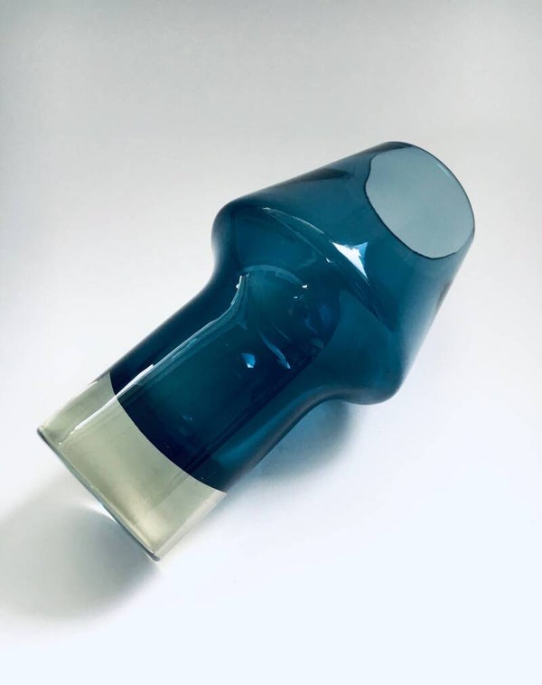 Midcentury Modern Scandinavian Design STROMBOLI Blue Glass Vase by Aimo Okkolin for Riihimaen Lasi Oy Riihimaki, Finland 1960's