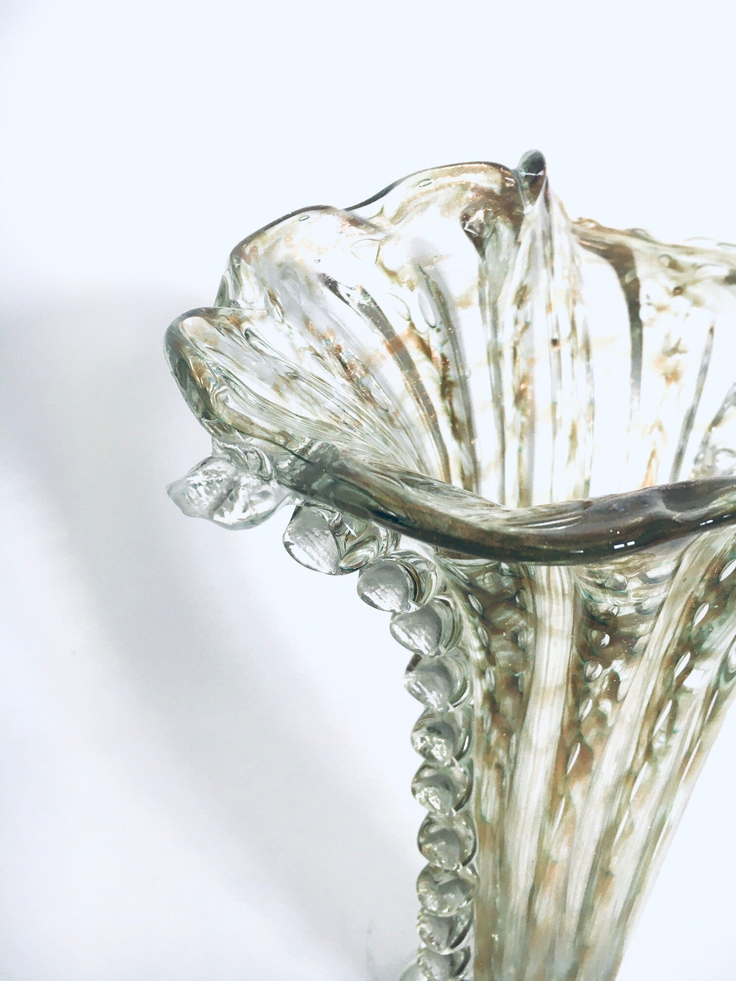 Bullicante Clear and Gold Foil Murano Glass Fan Flower Vase by Barovier & Toso, Italy 1940's