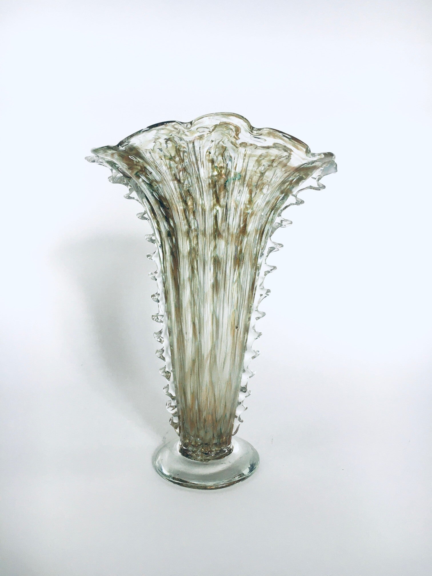 Vintage Impressive Bullicante Clear and Gold Foil Murano Glass FAN Flower Vase by Barovier & Toso, Murano Italy 1940's / 50's. Handmade handblown art glass piece. This piece is in good overal condition. It does have some chips at the 2 outer top foils and on the top edge. But it remains an impressive and displayable art glass vase. Measures 38cm x 27cm x 16cm.