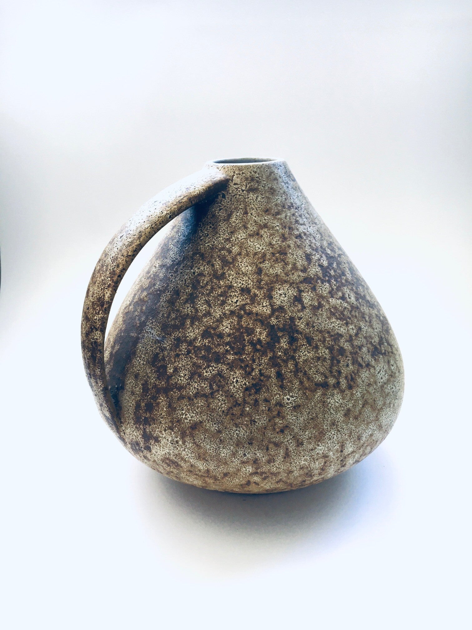 Vintage Midcentury Modern Art Studio Pottery Decanter Jug Vase with handle, made in West Germany 1960's. Beautiful beige and brown thick glazed outside with white glazed inside. In very good condition. Measures 26cm x 28cm x 27cm.