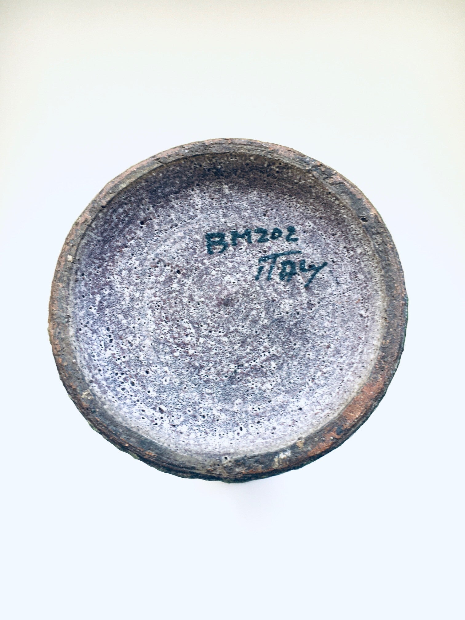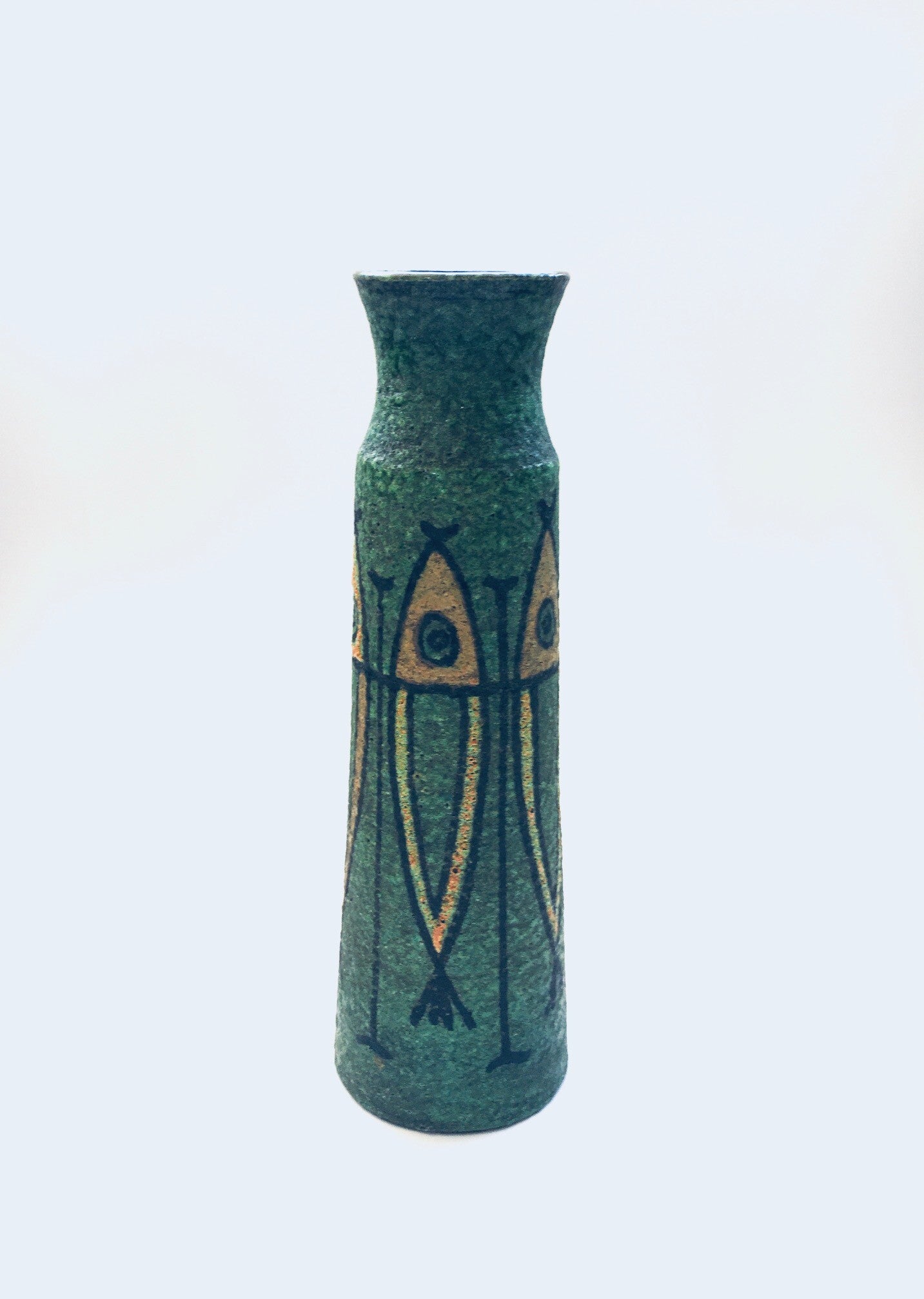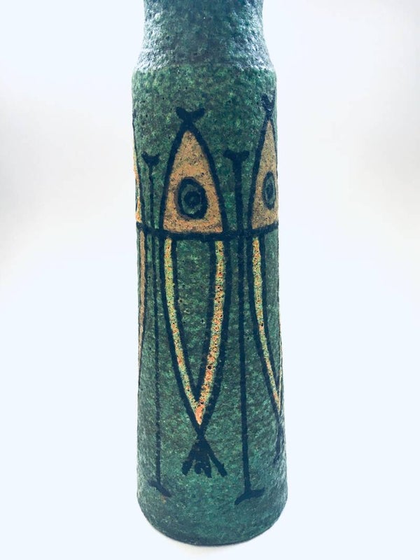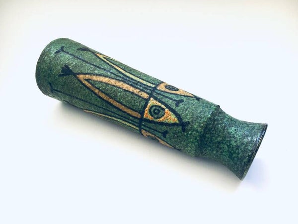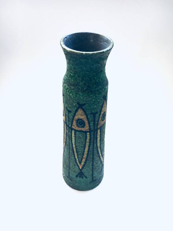 Vintage Midcentury Studio Art Pottery Roller Vase with Fish Pattern by Aldo Londi for Bitossi Ceramiche, made in Italy 1960's. Roll shape, rotating decoration of 5 stylized fish in yellow and black enamel on a grainy green background. Marked on the bottom BM202, Italy. In very good condition. Measures 30cm x 9,5cm x 9,5cm.