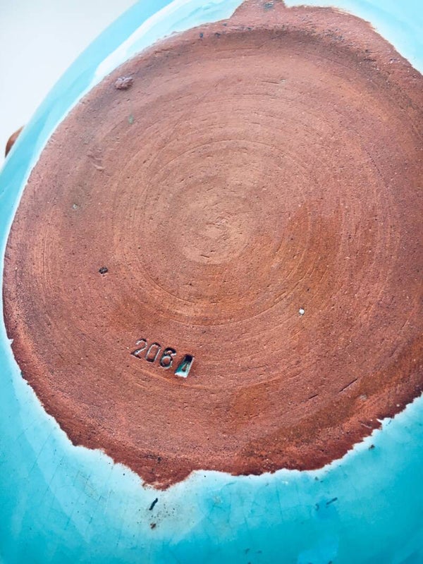 Vintage Midcentury Studio Art Pottery Candy Bowl with Rope handle by Alexandre De Wemmel, made in Belgium 1950's. Candy or small fruit bowl with rope turned handle in orange clay. Turquoise and brown glazes which are typical of Alexandre De Wemmel his ouvres. In very good condition. Measures 16,5cm x 29cm x 25cm.