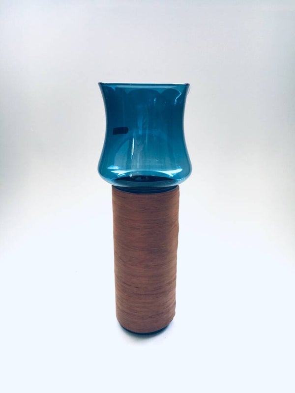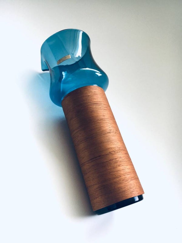 Vintage Midcentury Modern Scandinavian Design Blue Glass Decanter by Pukeberg, made in Sweden 1960's. Prussian blue glass with teak wood surround. Marked with original sticker. In very good condition. Measures 28cm x 10cm x 10cm.