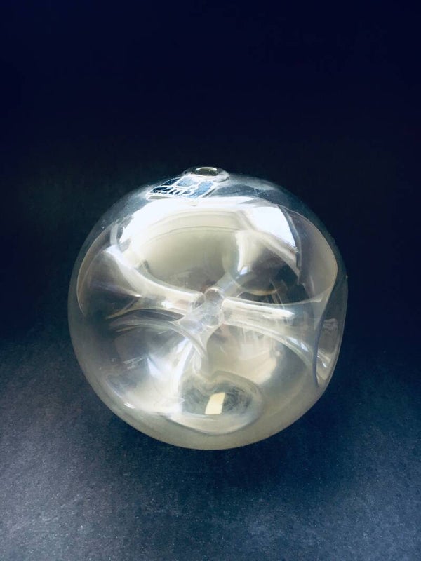 Vintage Blown Glass Huilier en verre souflé by MB création, made in France 1970's. Oil decanter ball in handblown thin glass. A very cool Art piece of handblown glass with 4 inwards pressed trumpet shapes. In very good condition, with original labels. Measures 13cm x 11,5cm x 11,5cm.