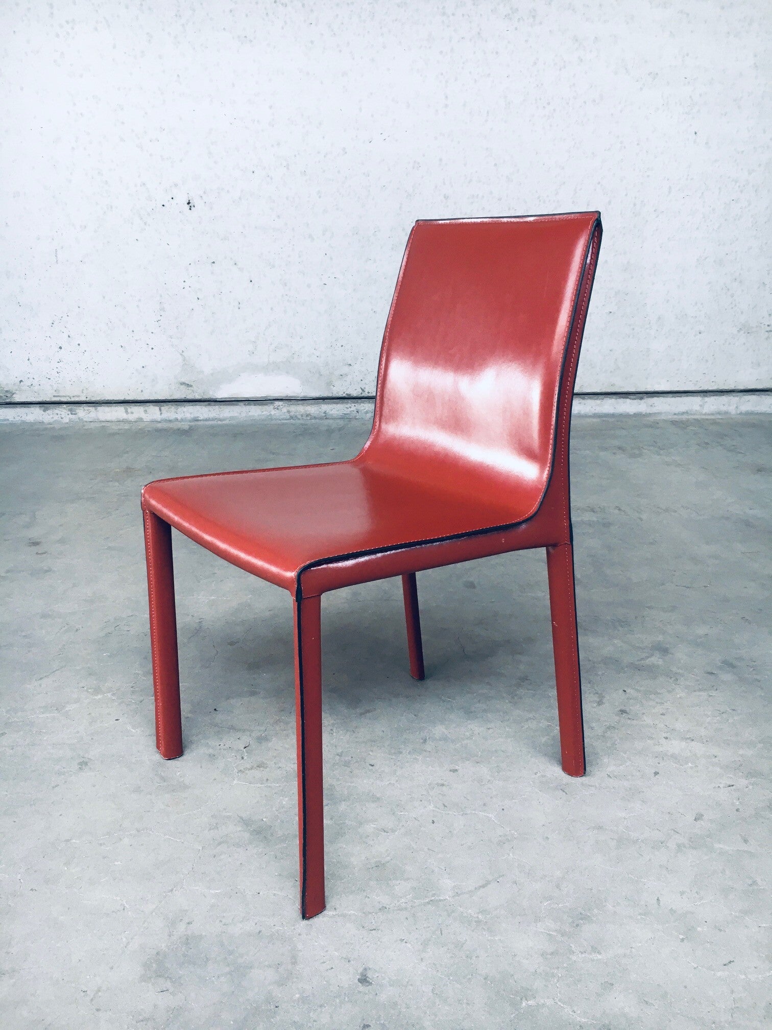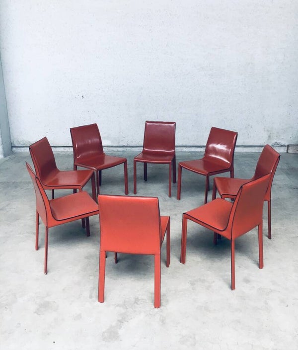Vintage Italian Modern Design all Leather Dining Chair set, made in Italy 1980's. Set of 8 all leather covered dining chairs in a burnt orange red. In the style of Cassina CAB chairs. Chairs come in good to very good condition. Some have some small damages at the legs or the seat area from their use. One chair has a small tear at the top of it's back rest (see picture). Each chair measures 86cm x 47cm x 50cm.