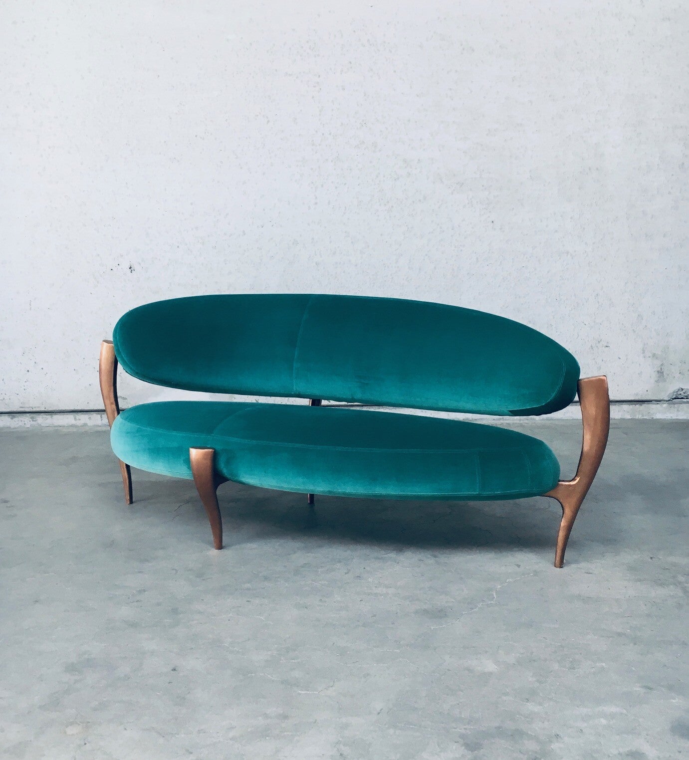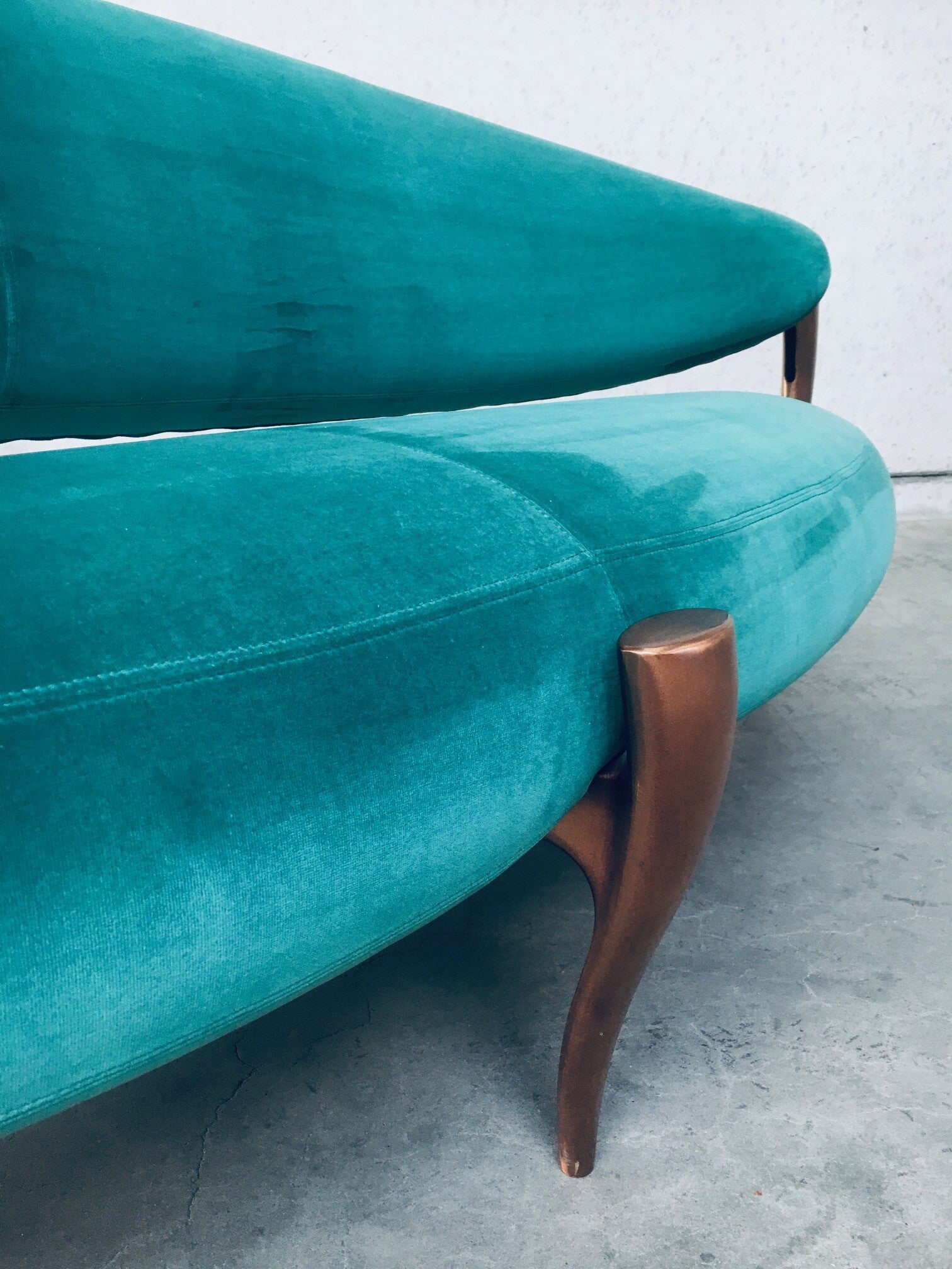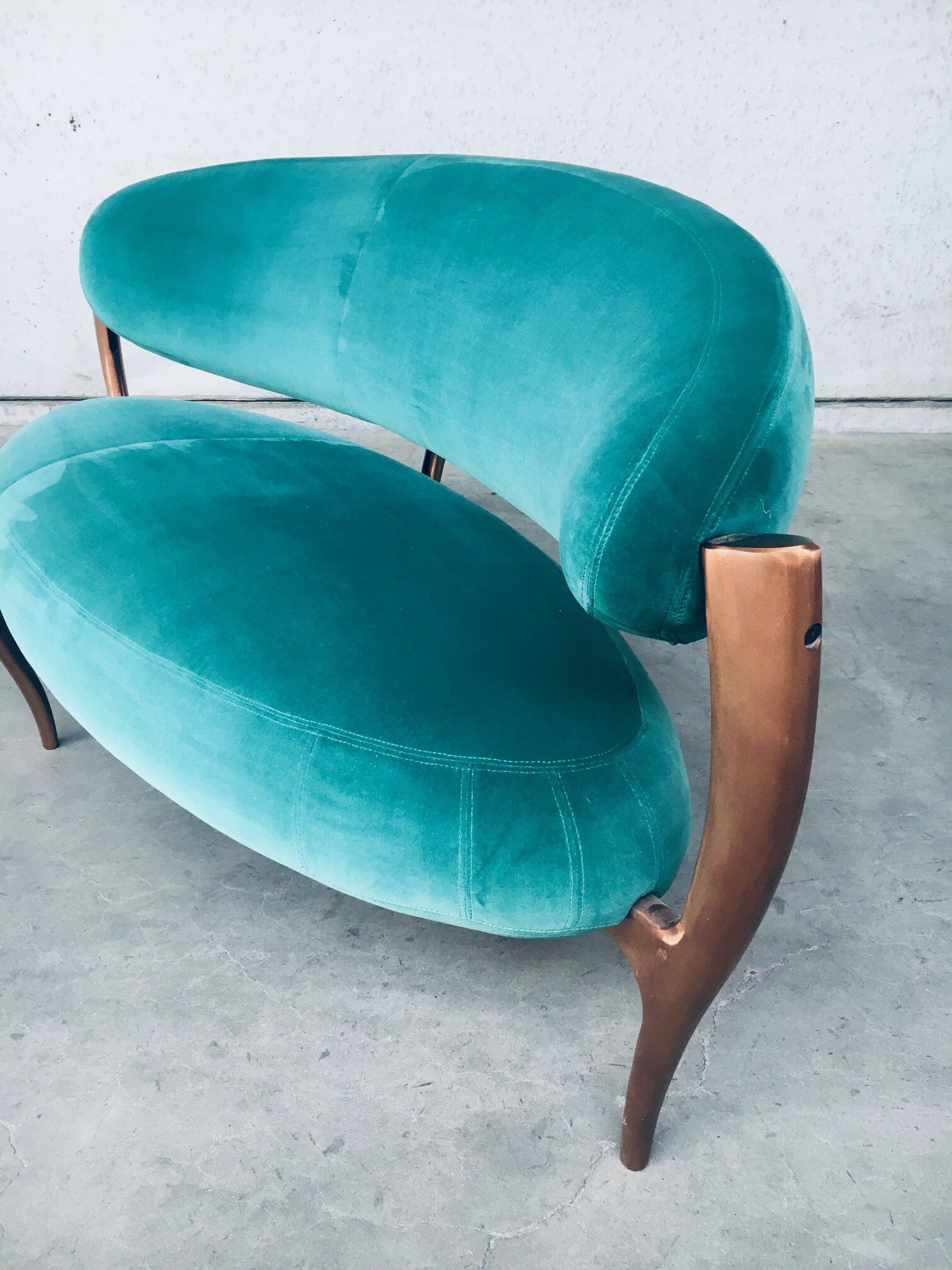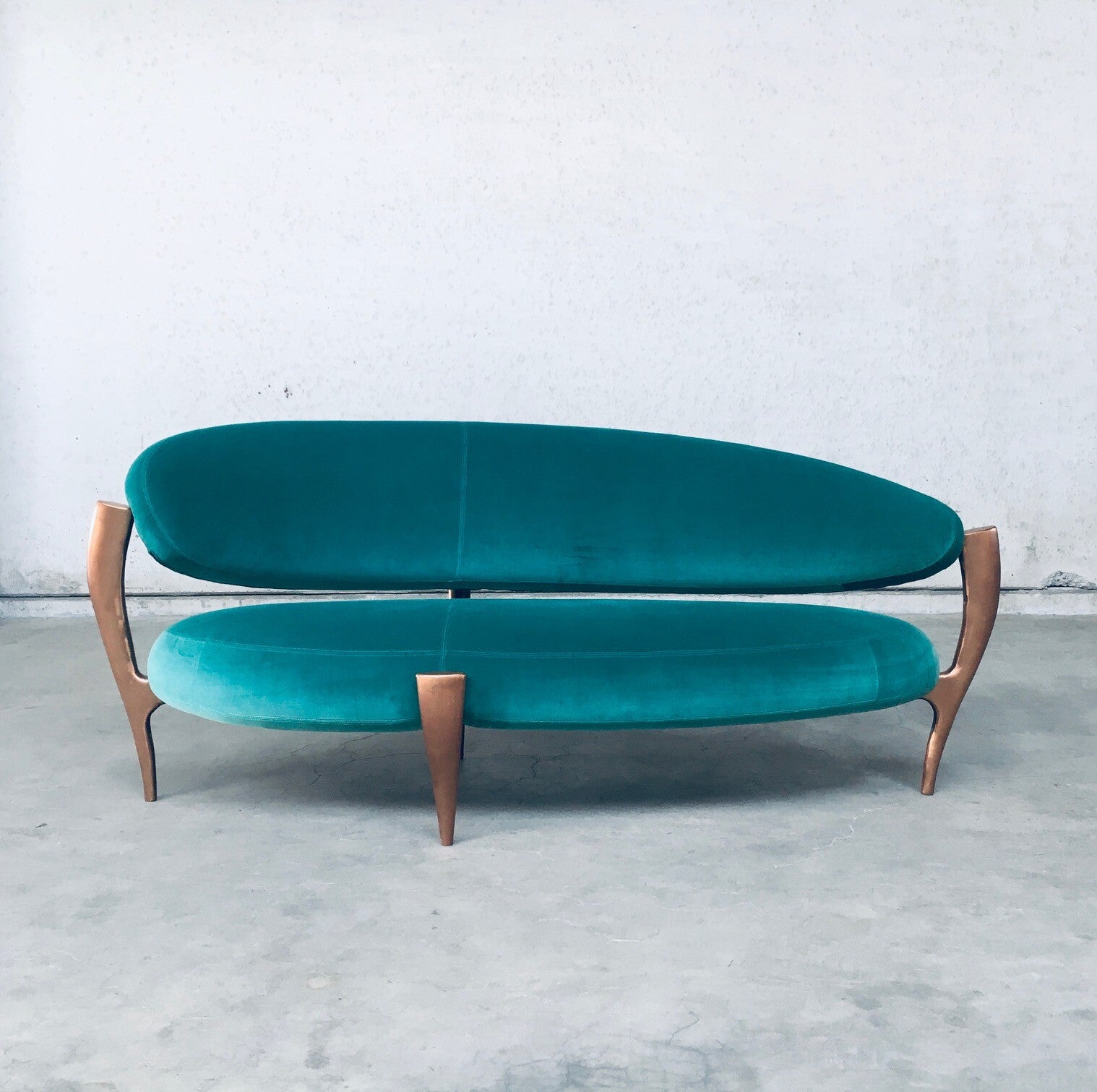 Rare Postmodern Modern Italian Design Floating Free Form Curved 3 seat Sofa with Sculptural base. Made in Italy 1990's. Made with the Highest quality materials. Velvet turquoise sea green fabric on handmade solid copper metal feet base. Beautiful organic shapes with floating curved design. This is a very rare sofa in this combination of materials. In the style of Vladimir Kagan floating sofa. Comes in very good original condition. Hardly ever used. Measures 83cm x 200cm x 90cm.