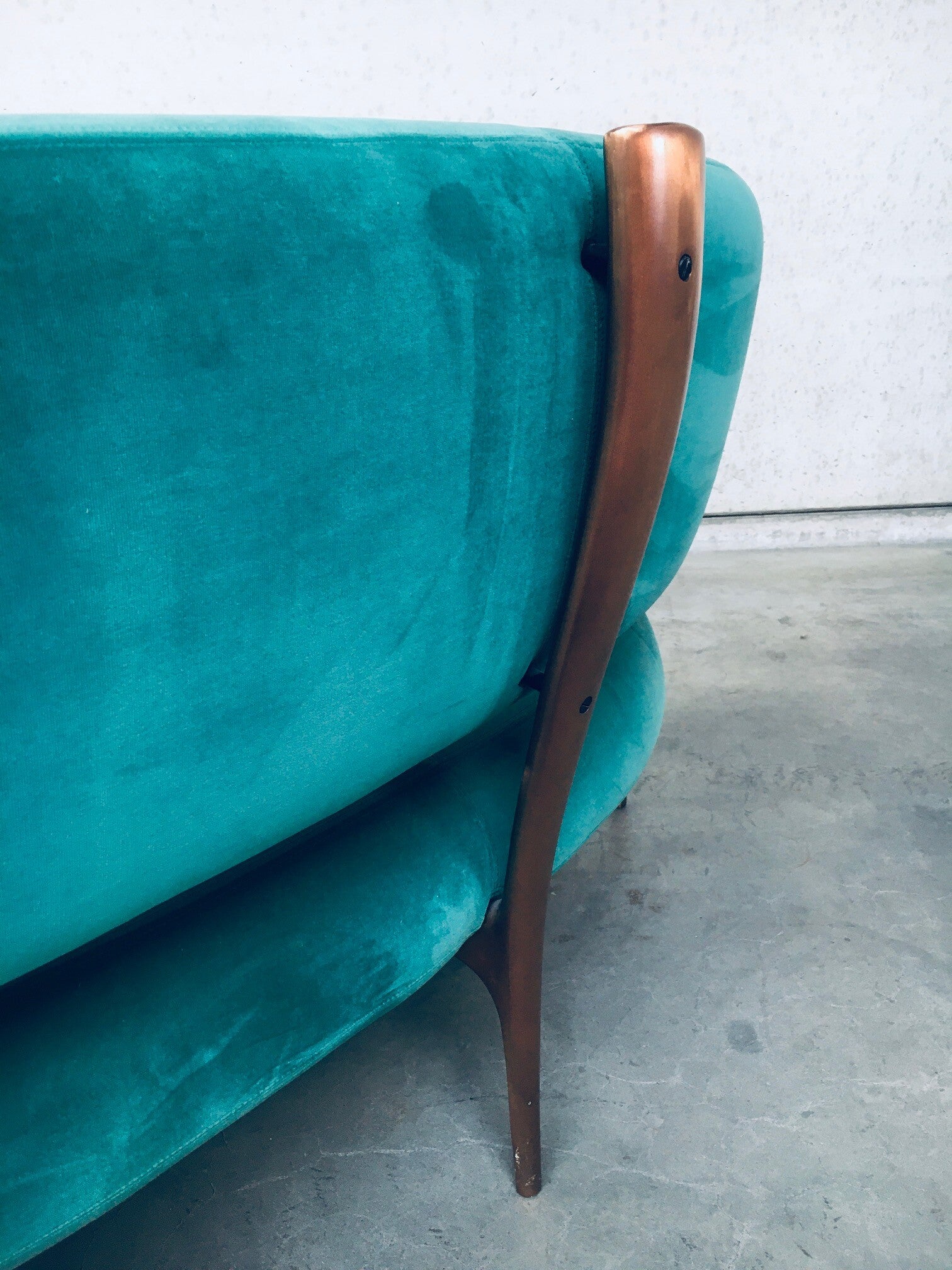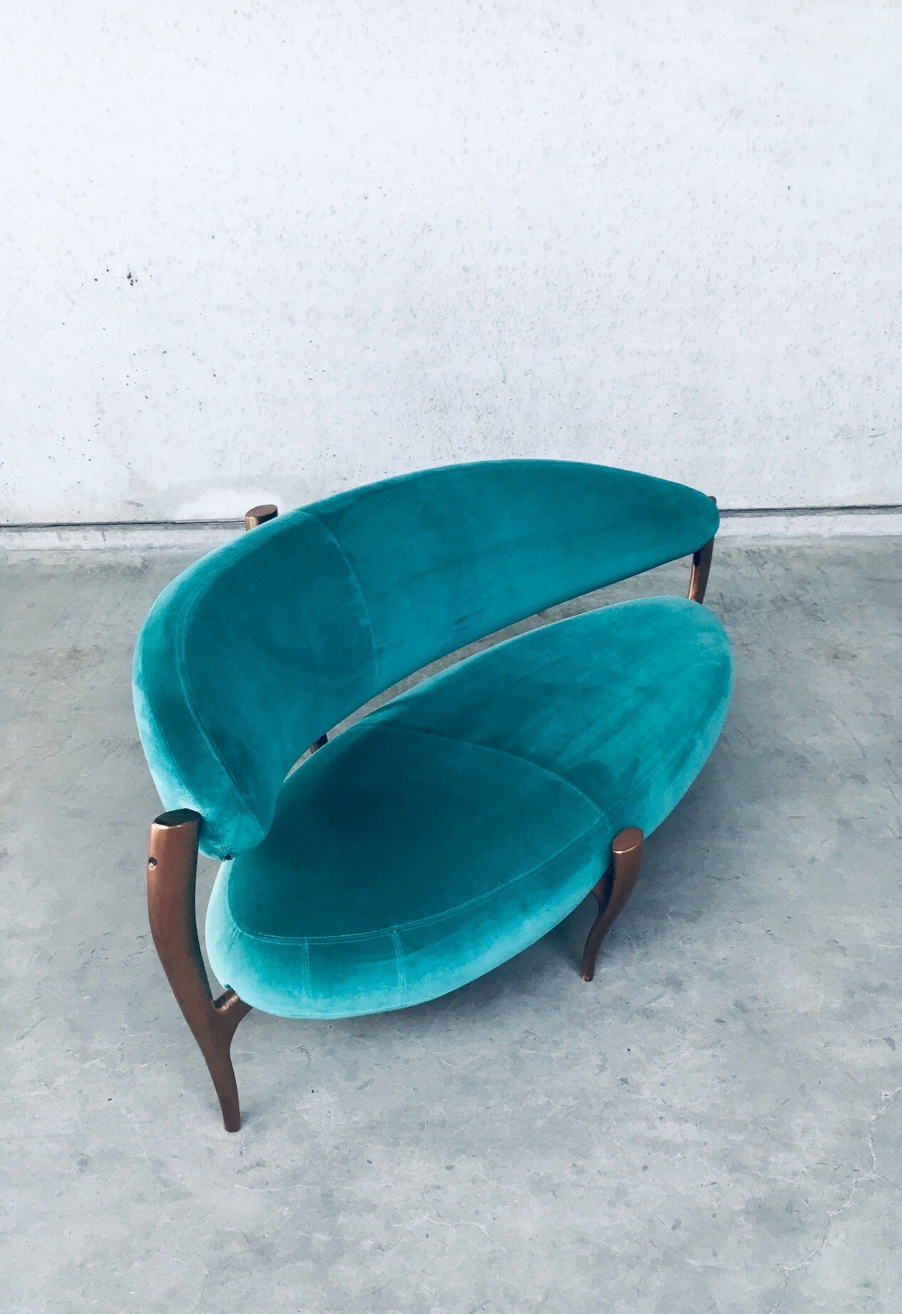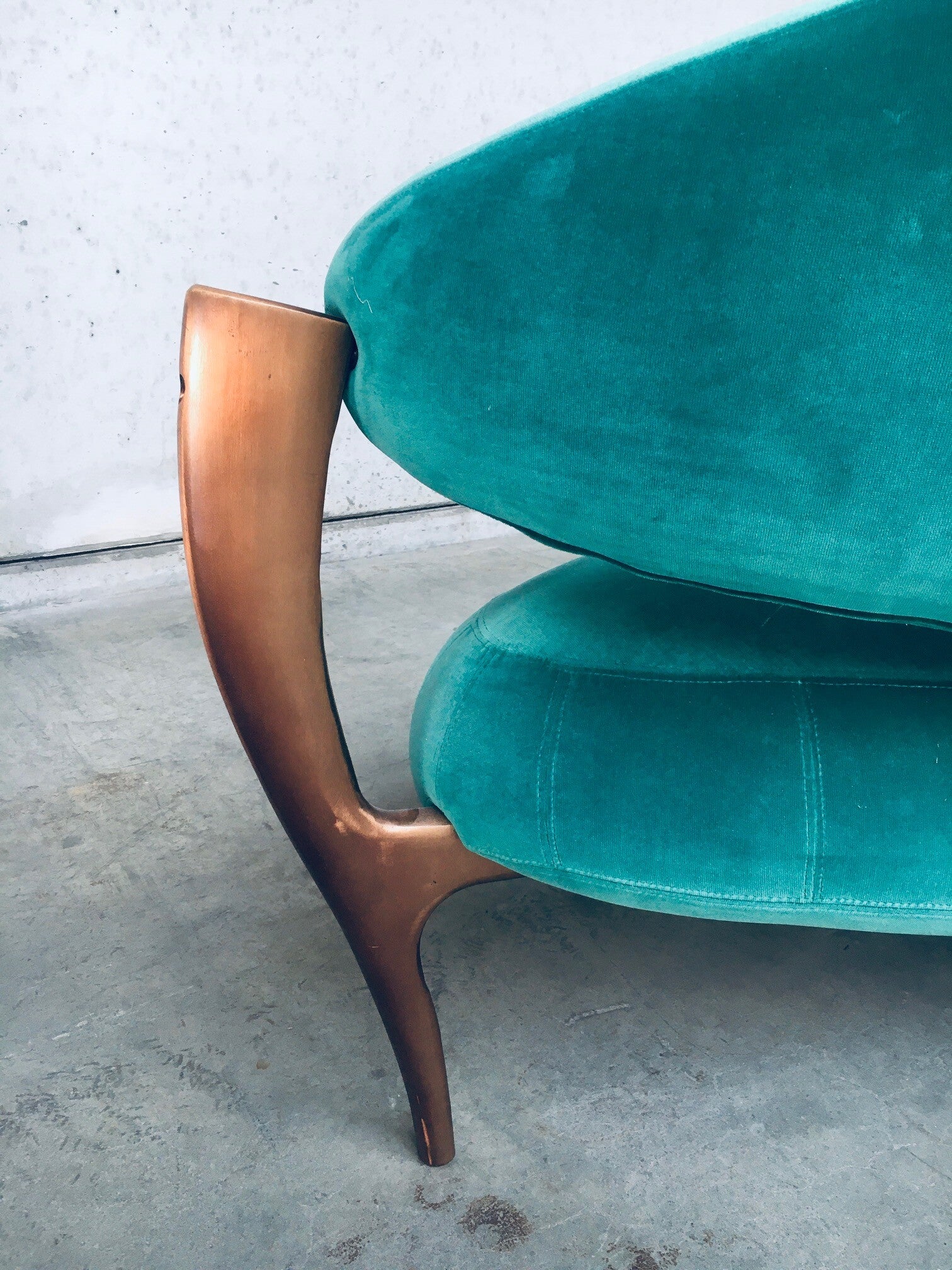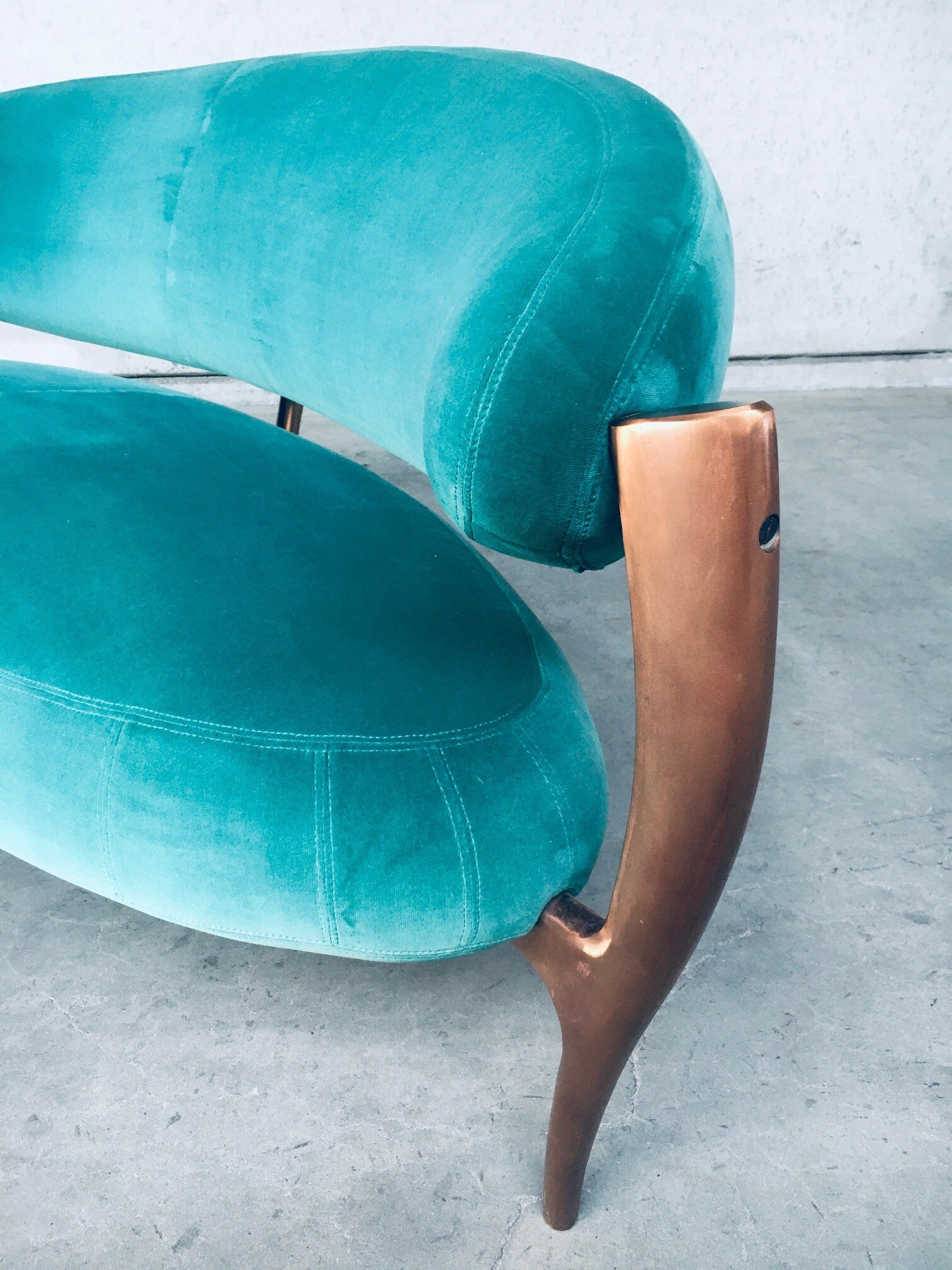 Rare Postmodern Modern Italian Design Floating Free Form Curved 3 seat Sofa with Sculptural base. Made in Italy 1990's. Made with the Highest quality materials. Velvet turquoise sea green fabric on handmade solid copper metal feet base. Beautiful organic shapes with floating curved design. This is a very rare sofa in this combination of materials. In the style of Vladimir Kagan floating sofa. Comes in very good original condition. Hardly ever used. Measures 83cm x 200cm x 90cm.