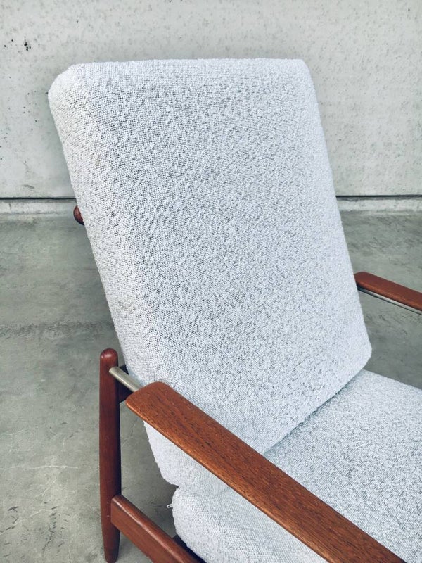 Vintage Midcentury Modern Scandinavian Design Armchair Fauteuil, made in Denmark 1960's. Teak and metal frame with boucle reupholstered original cushions. Teak floating armrests on metal tube frame. Rare combination in use of materials. Beautiful designed arm chair. Measures 94cm x 66cm x 90cm.