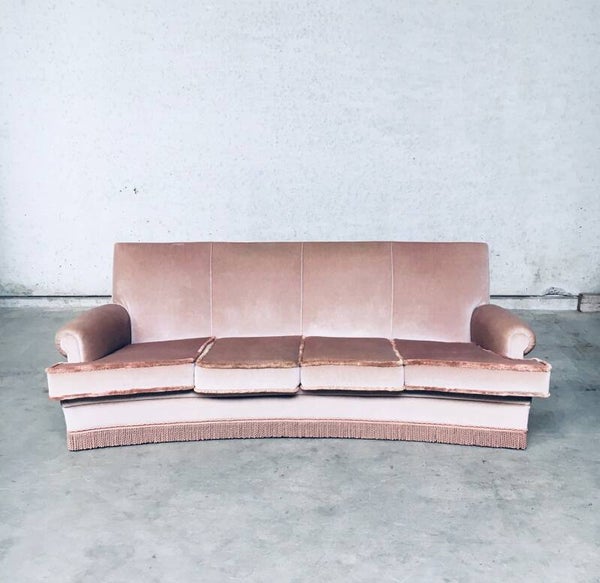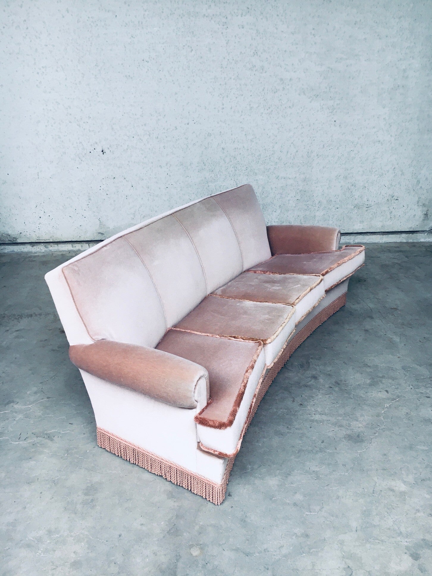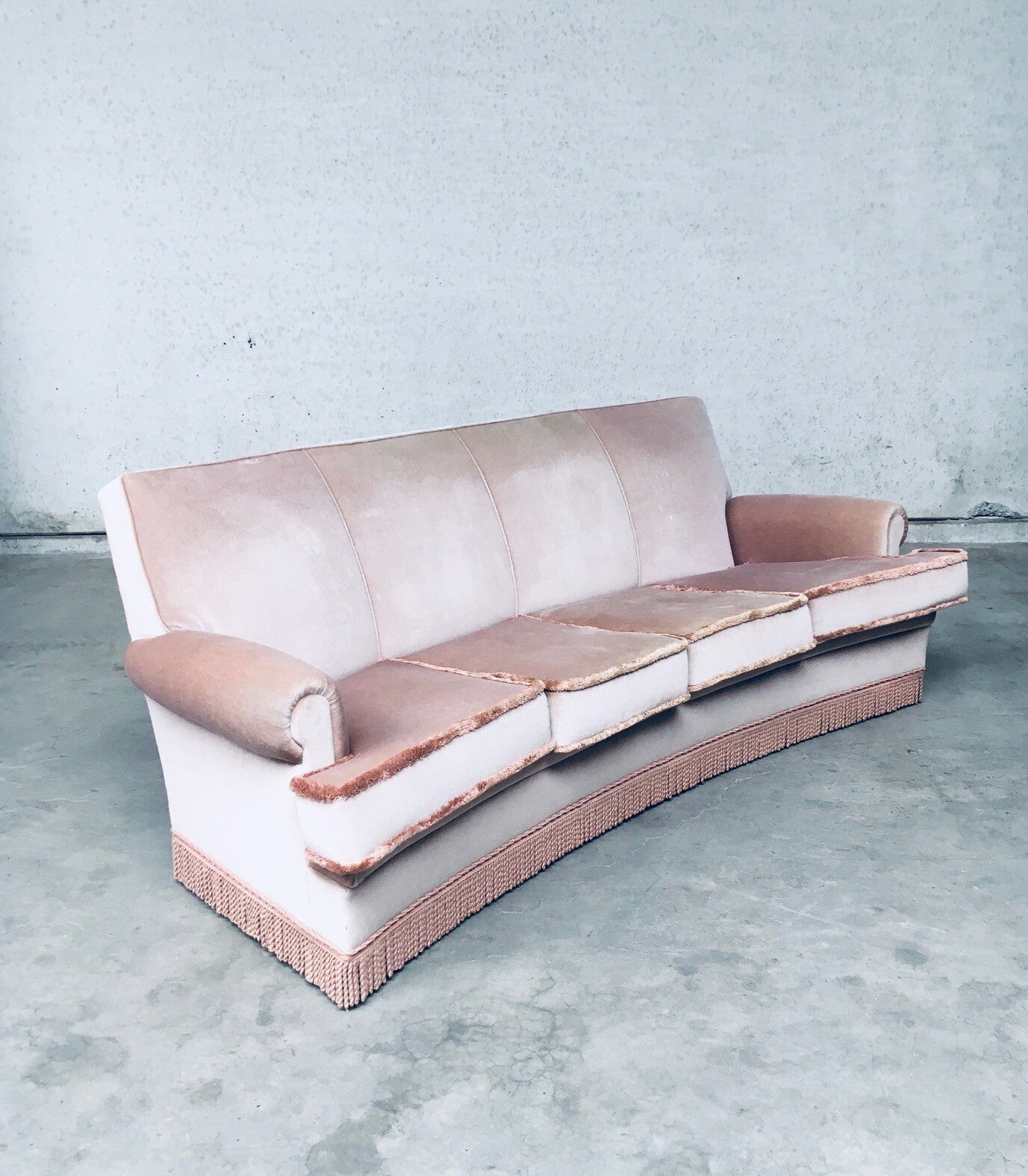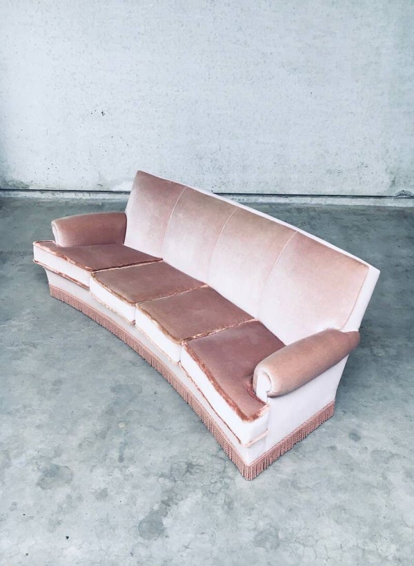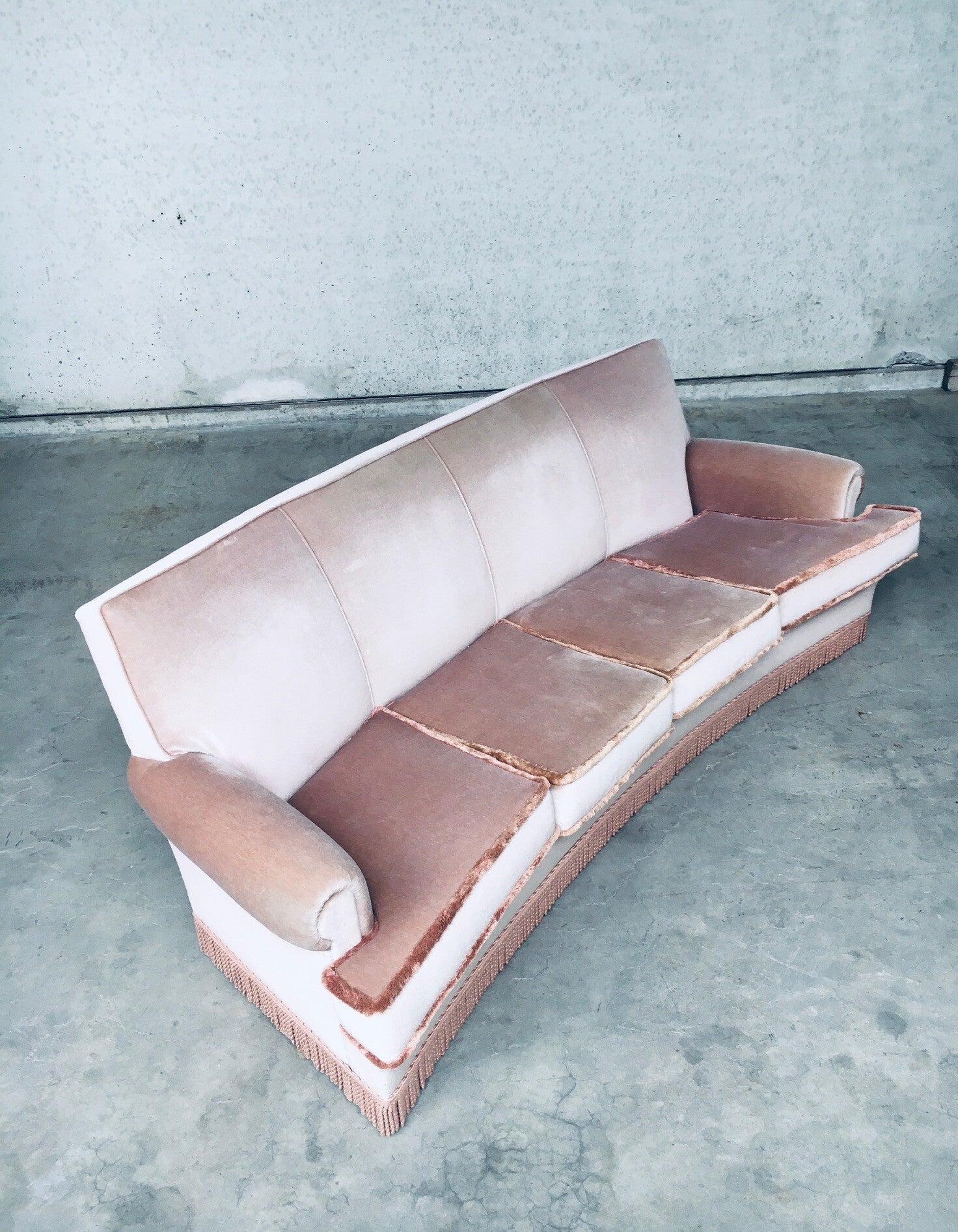 Vintage Midcentuy Design Pink Velvet Curved 4 Seat Sofa with Fringe, made in Belgium 1950's. Large model sofa in soft pink color. In very good, hardly ever used condition. Measures 92cm x 240cm x 100cm.