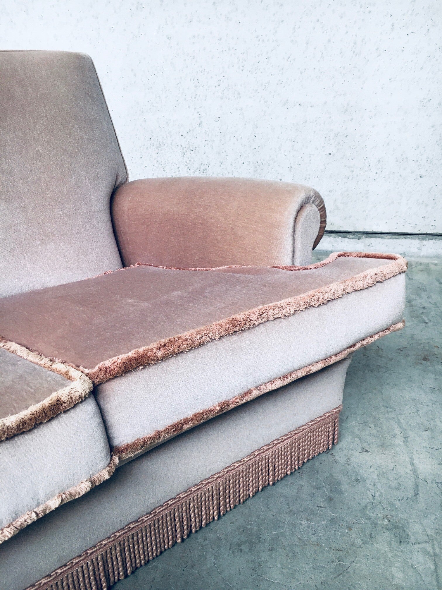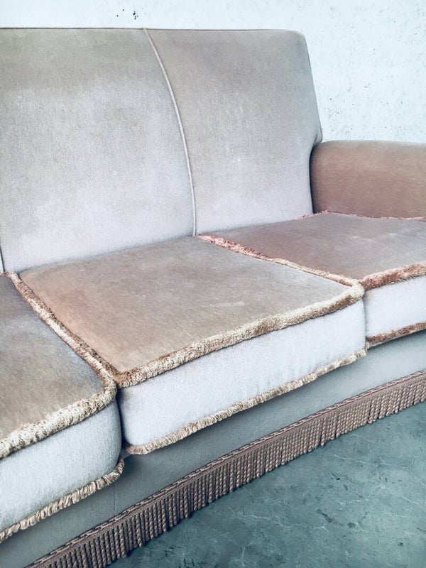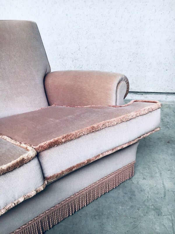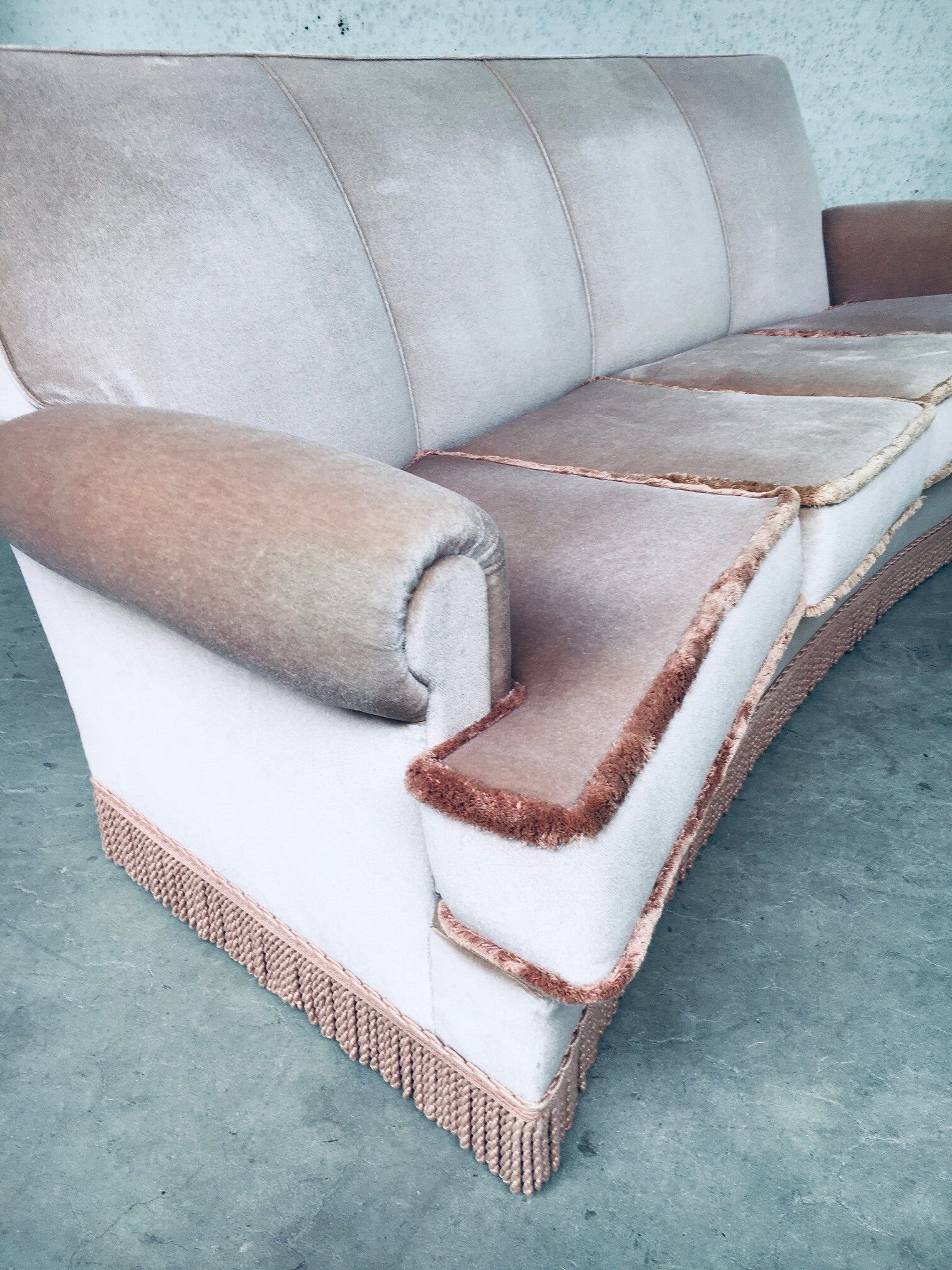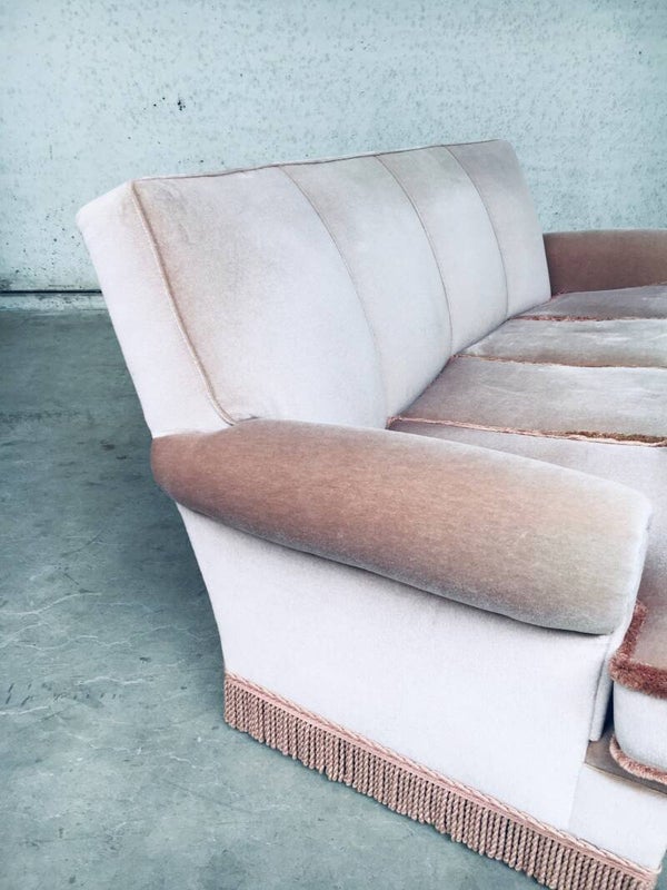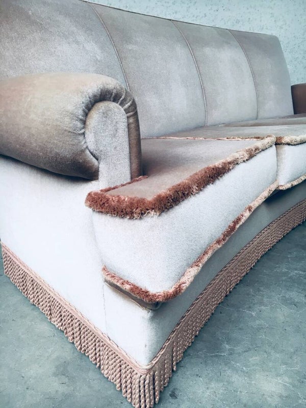 Vintage Midcentuy Design Pink Velvet Curved 4 Seat Sofa with Fringe, made in Belgium 1950's. Large model sofa in soft pink color. In very good, hardly ever used condition. Measures 92cm x 240cm x 100cm.