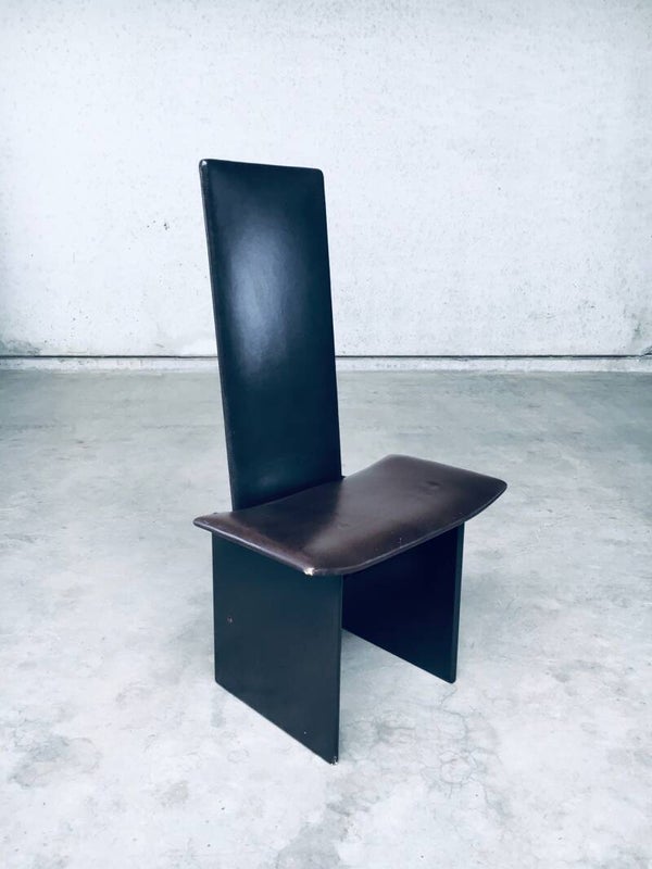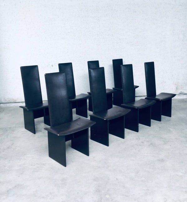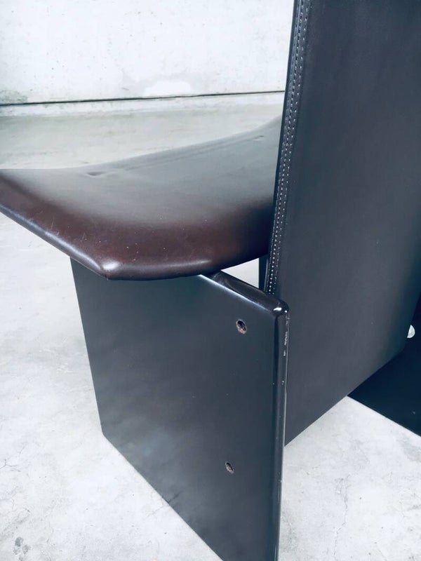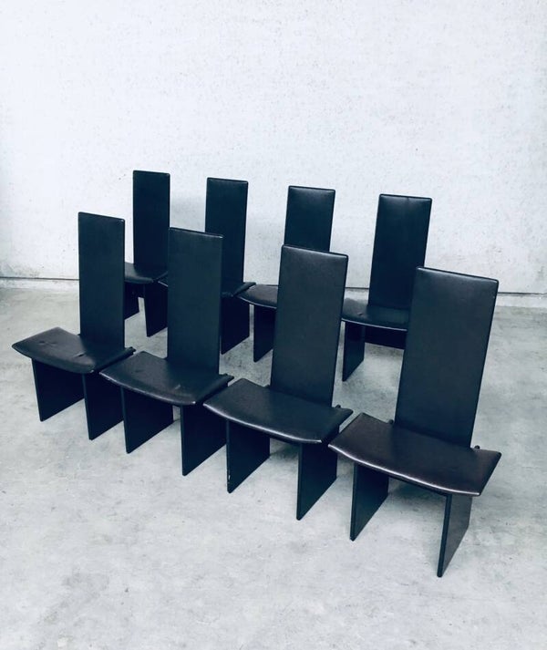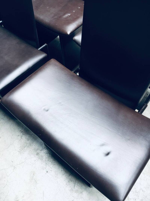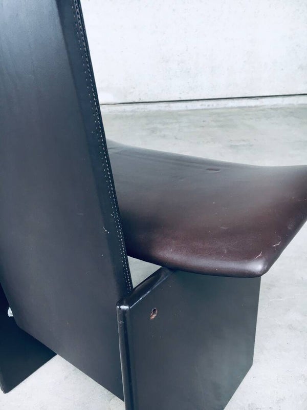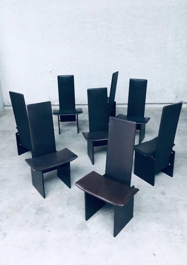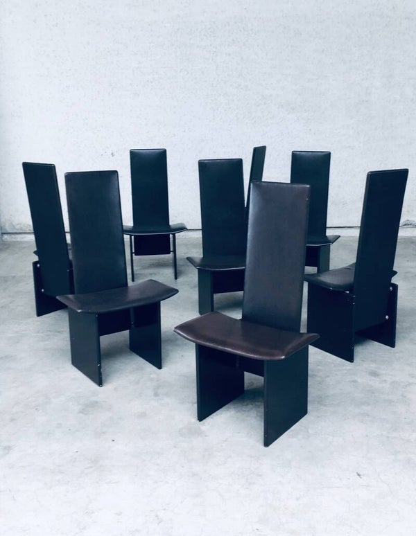 Vintage Postmodern Design 'RENNIE' Dining Chair set of 8 by Kazuhide Takahama for Simon Gavina, made in Italy 1980's. Architectural design dining chairs in dark brown. The seat and back are in dark chocolate brown leather and the feet are in the same dark brown laquered wood. All chairs are in well used condition with marks and patina of their use. Scuffs on the laquered wood, corrosion on the metal construction parts and the leather has indentations from being stacked on top of each other on all chairs (see pictures). On some chairs the leather has stains or loss of color. They are in overall good and solid original condition. Each chair measures 111cm x 61cm x 43cm.