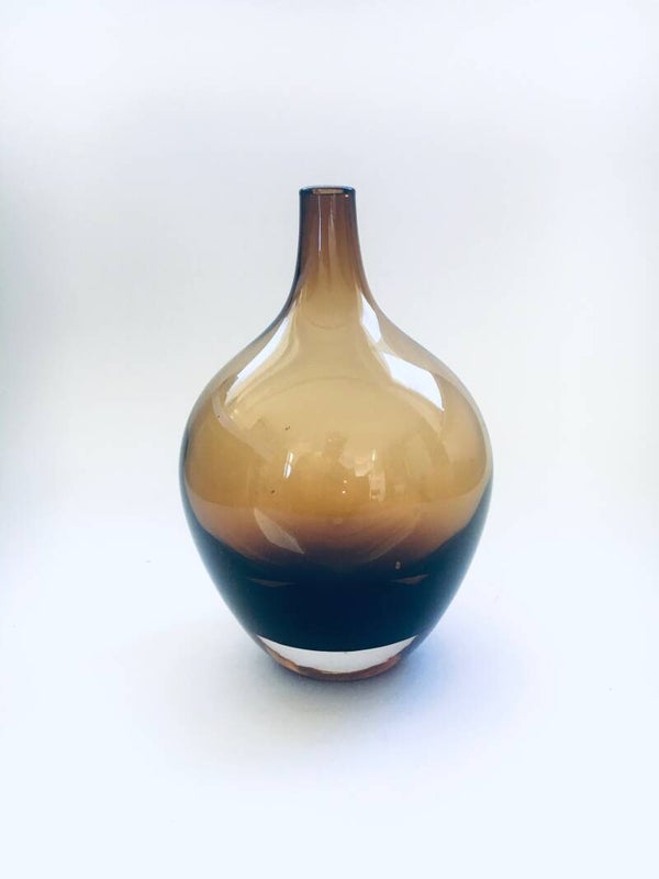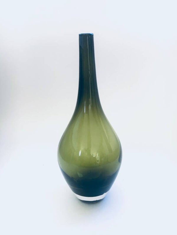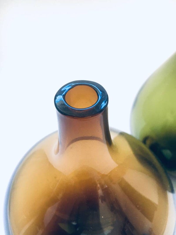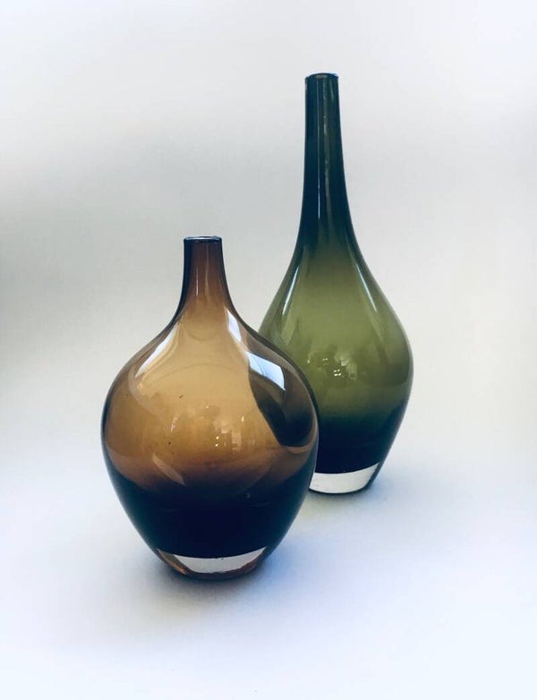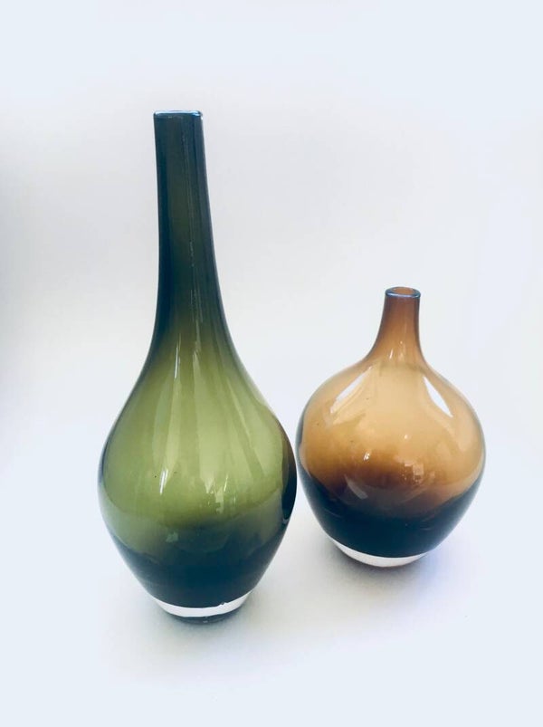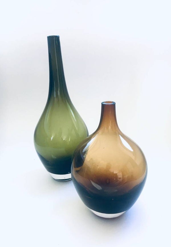 Vintage Midcentury Modern Scandinavian Design Hand Blown Droplet Vase set of 2. Made in the 1960's. No maker markings. Thick handblown glass vases, one in a forest moss green color, one in a brown amber color. Both are in very good condition. Measurements: Green: 31cm x 12cm x 12cm - Amber: 20cm x 13cm x 13cm.