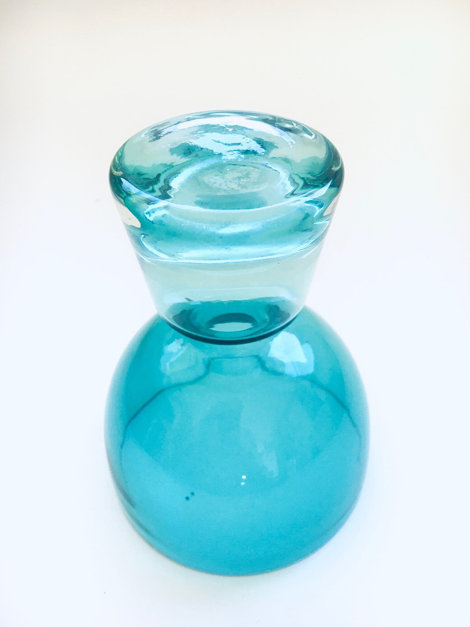 Vintage Midcentury Scandinavian Design Turquoise Glass CUP Model small Vase, made in Finland 1960's. Handblown hand made. In good condition, at one place some nibbles at the top inner rim. Measures 14,5cm x 11cm x 11cm.