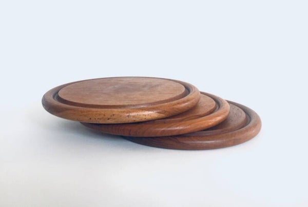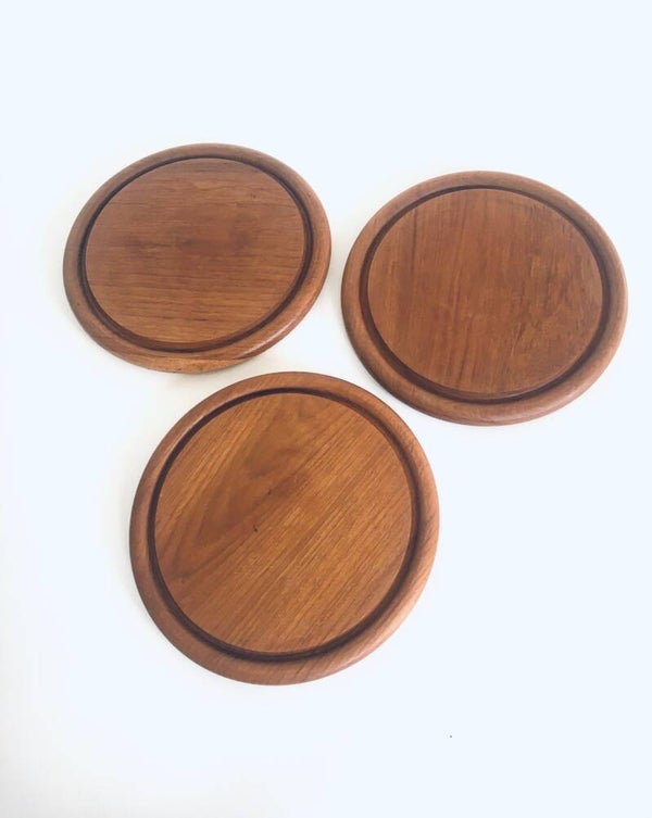 Vintage Midcentury Modern Scandinavian Design Solid Teak Cutting Plate set. Made in Denmark, 1960's. Solid teak wood turned cutting or serving plate. S size set of 3 plates. All are in very good condition. Each measures 2cm x 25,5cm x 25,5cm.