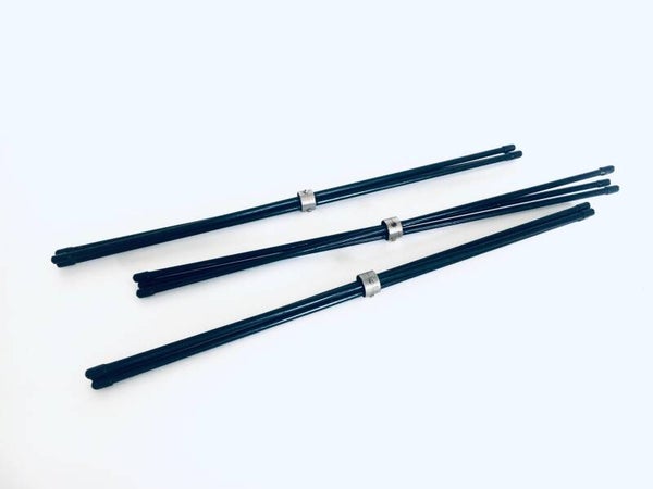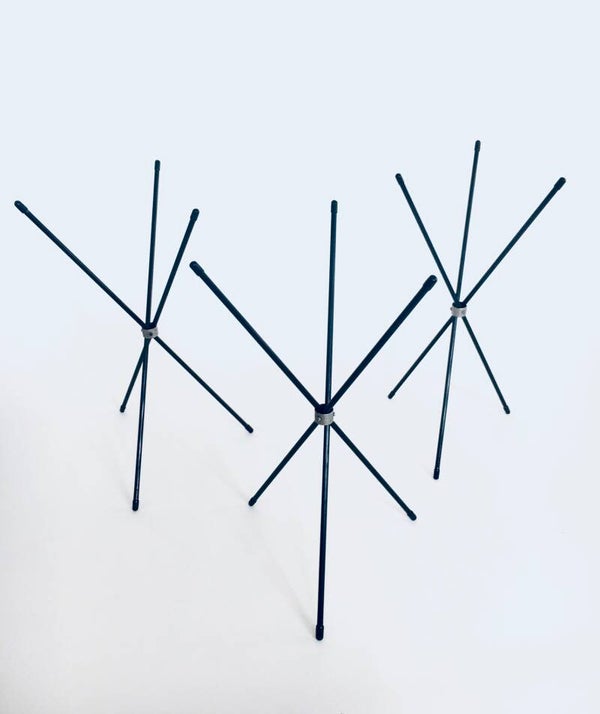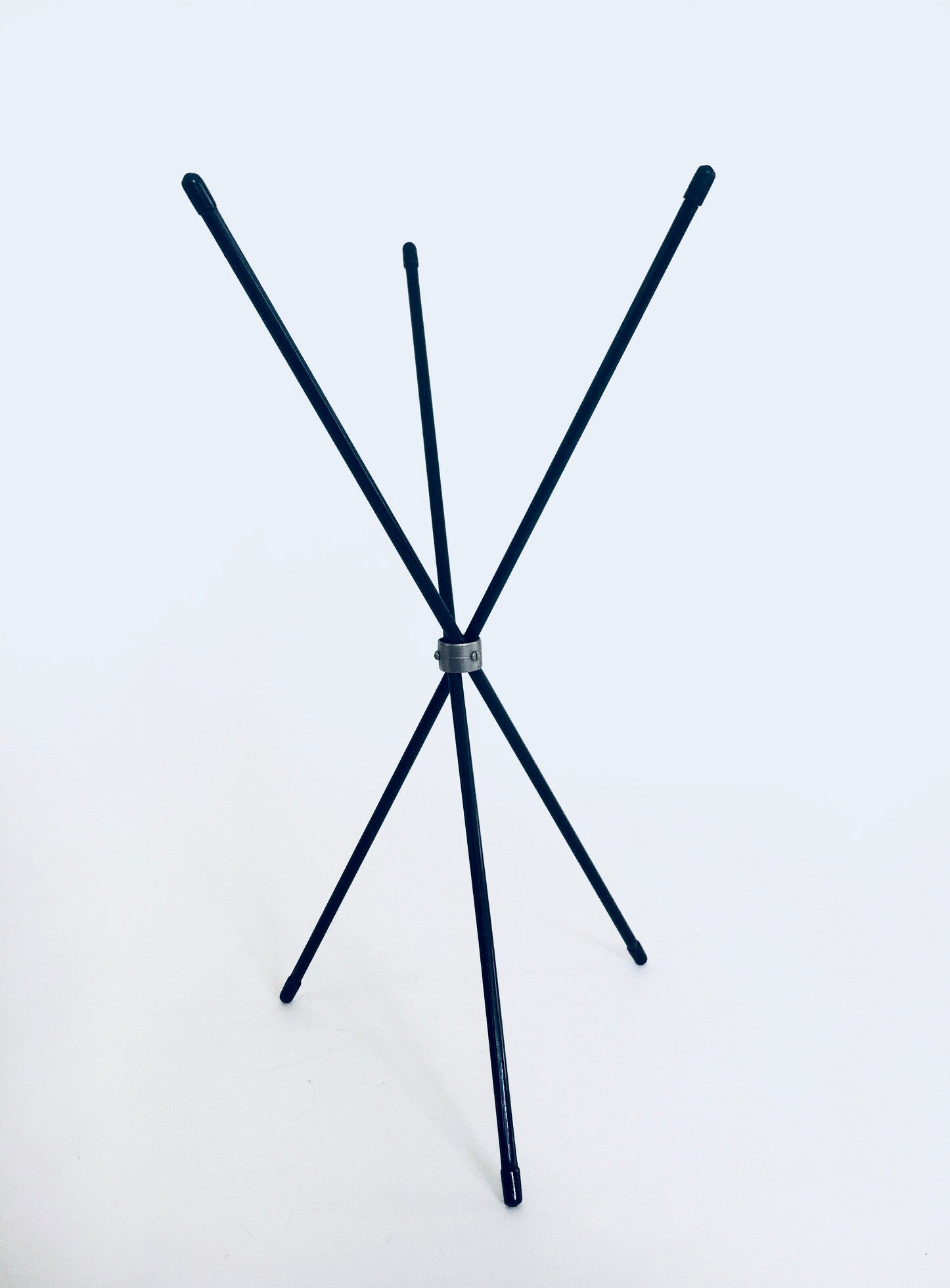 Vintage Midcentury Tripod Display Stand Set of 3. Made in France, 1950's. Metal colored plastic coverd sticks with rubber tips, held together with a metal ring. Can be used to display plates (as in the pictures with the teak plate). Or as stands on your dining table to fit food plates. Set of 3 in all balck. All are in good condition. Each measures (when set open) 42,5cm x 24cm x 24cm.