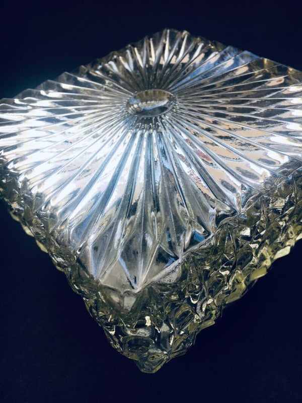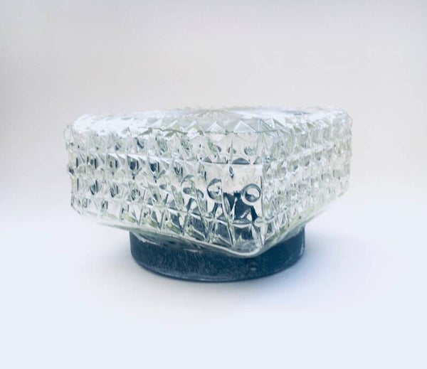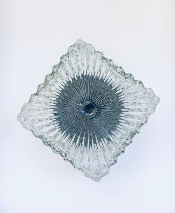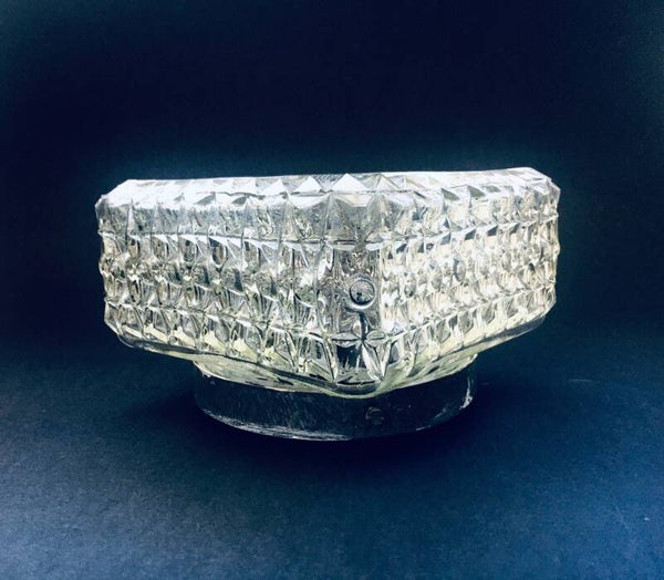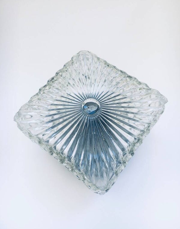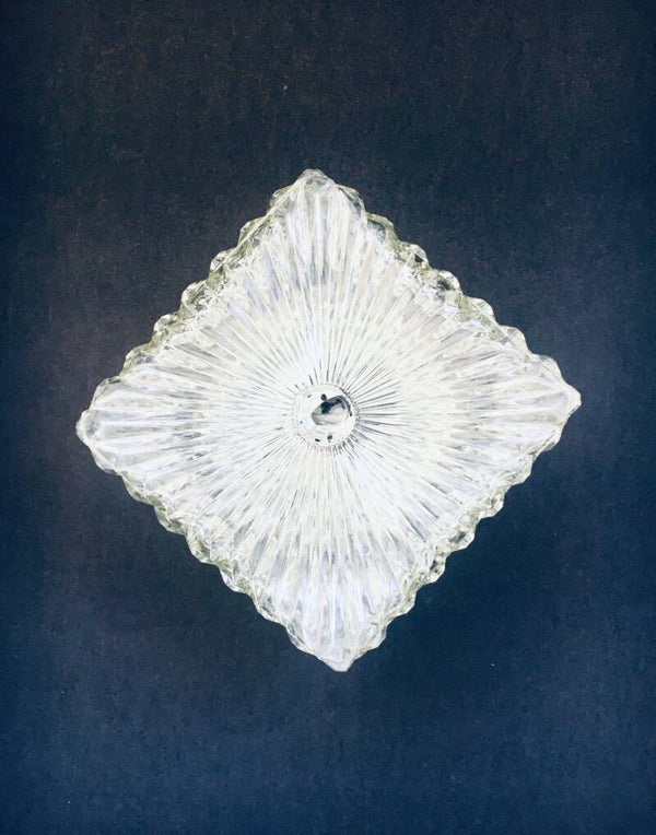 Vintage Midcentury Modern Design Square Sunburst Glass Sconce Wall Lamp. Made in West Germany, 1960's. Clear pressed glass with a Sunburst motif on top and Ice crystal motif on the side. In very good condition. Measures 11cm x 16,5cm x 16,5cm.