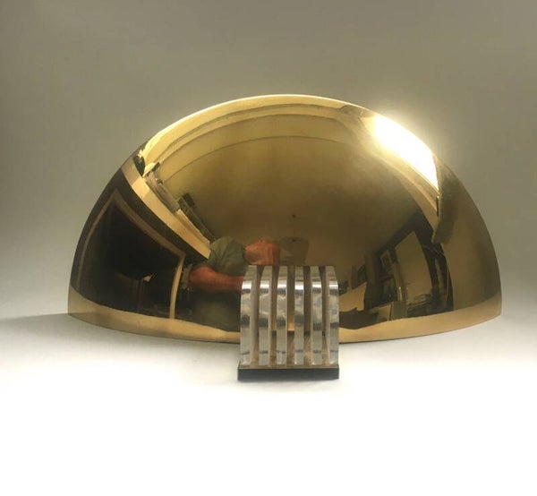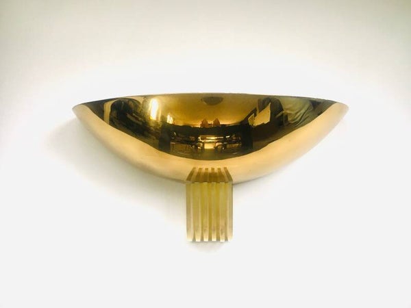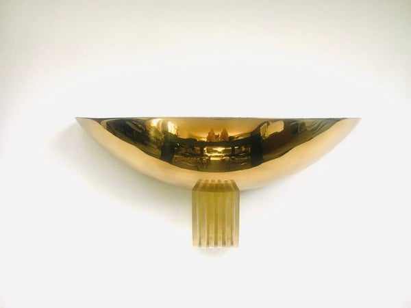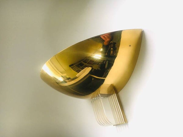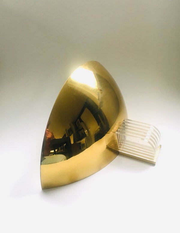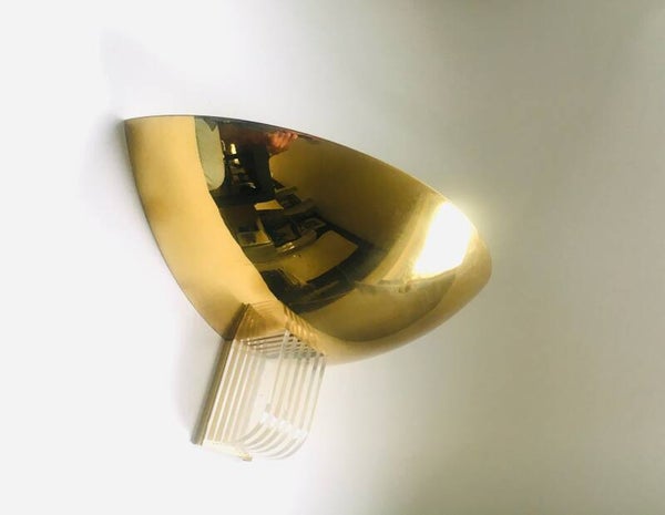 Vintage Modernist Memphis Style Design Gold Hald Moon Sconce wall lamp by Arredamento Collection, made in Italy 1980's. Large model gold metal half moon shape with 5 clear perspex fins. In good condition. Measures 19,5cm x 40,5cm x 20,5cm.