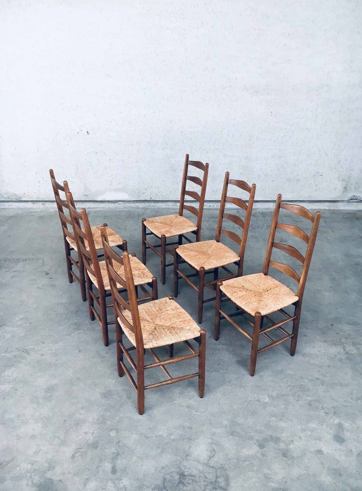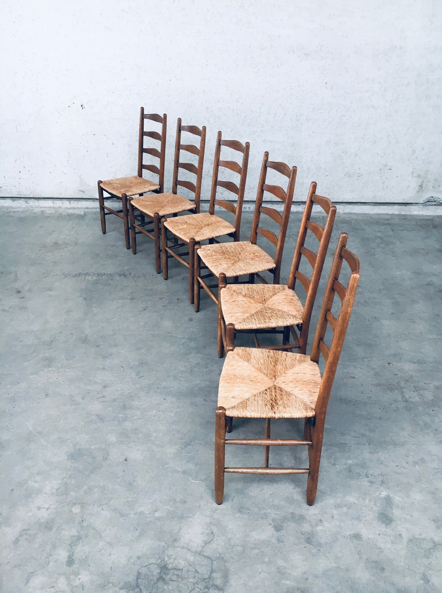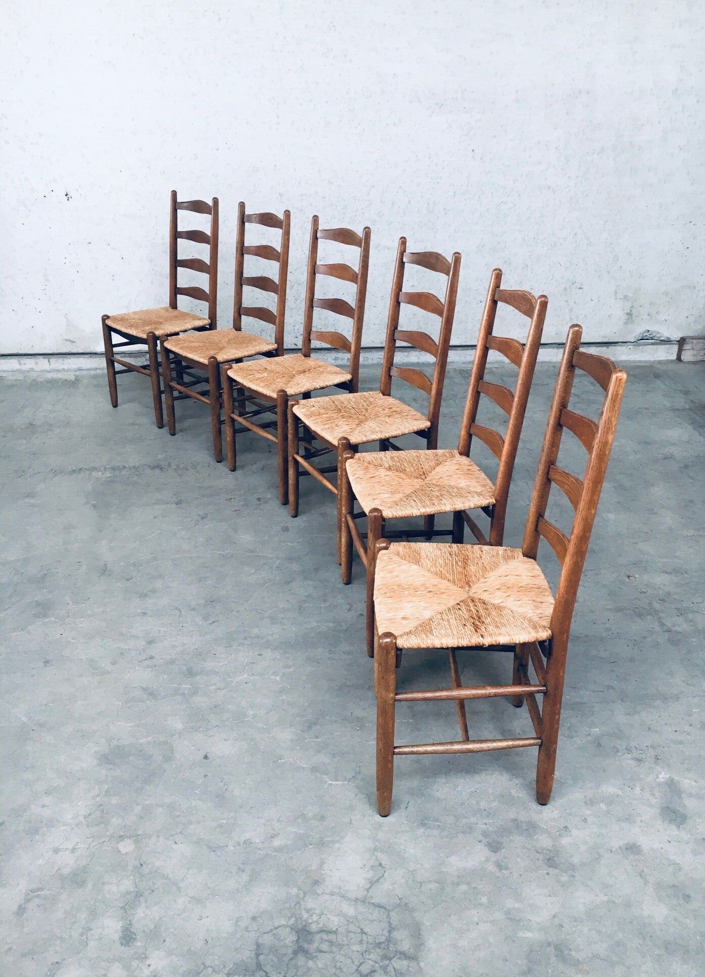 Vintage Rustic Handcrafted Oak & Rush Ladder Back Dining Chair set of 6. Made in Belgium, late 1940's, early 1950's. Solid oak constructed chair with woven rush seat. Ladder back model with several spindles in the bottom base for strenght. All chairs are in very good, original condition. Each chair measures 105cm x 46cm x 45cm.