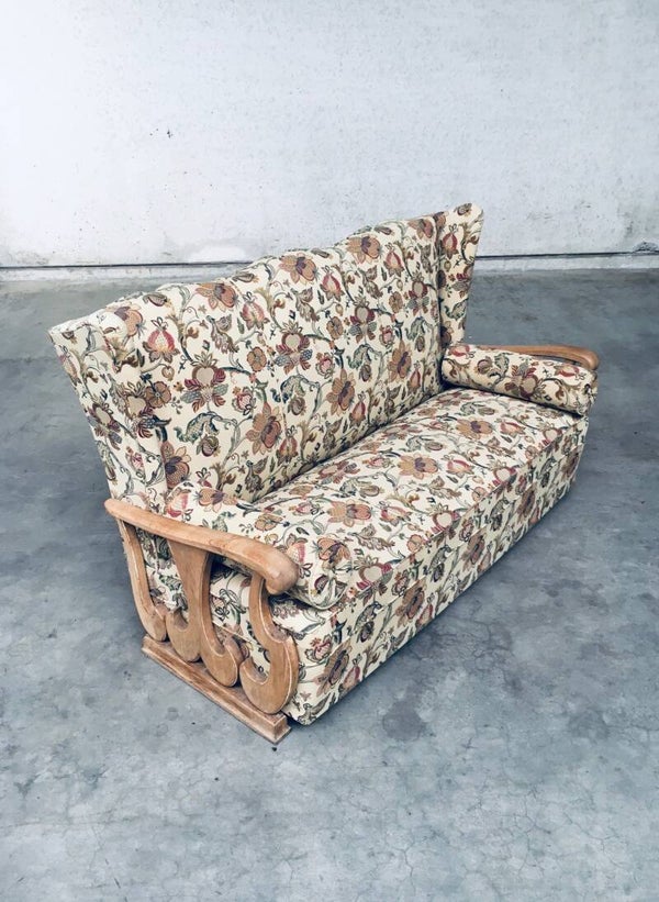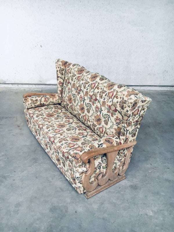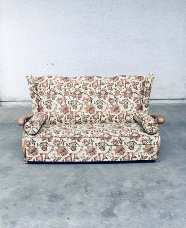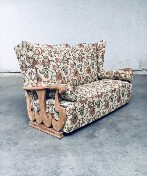 Original early 1900's Design High Wing Back 3 Seat Sofa. Made in France, 1920's - 1930's. High wing back sofa with oak sculptural carved arm rests and recently reupholstered flower print fabric. This comes from the first owner who lived in a small castle mansion and had this reupholstered soms 5 to 10 years ago. In very good condition. Measures 107cm x 173cm x 80cm.