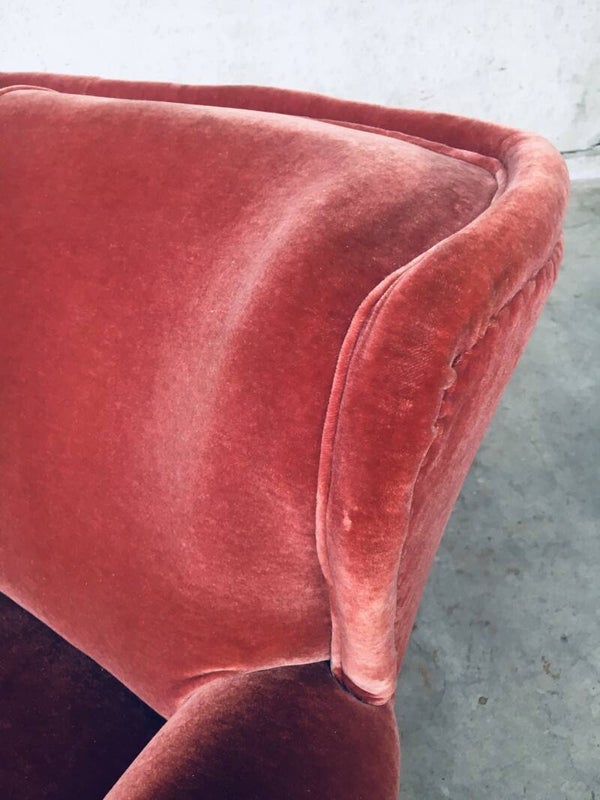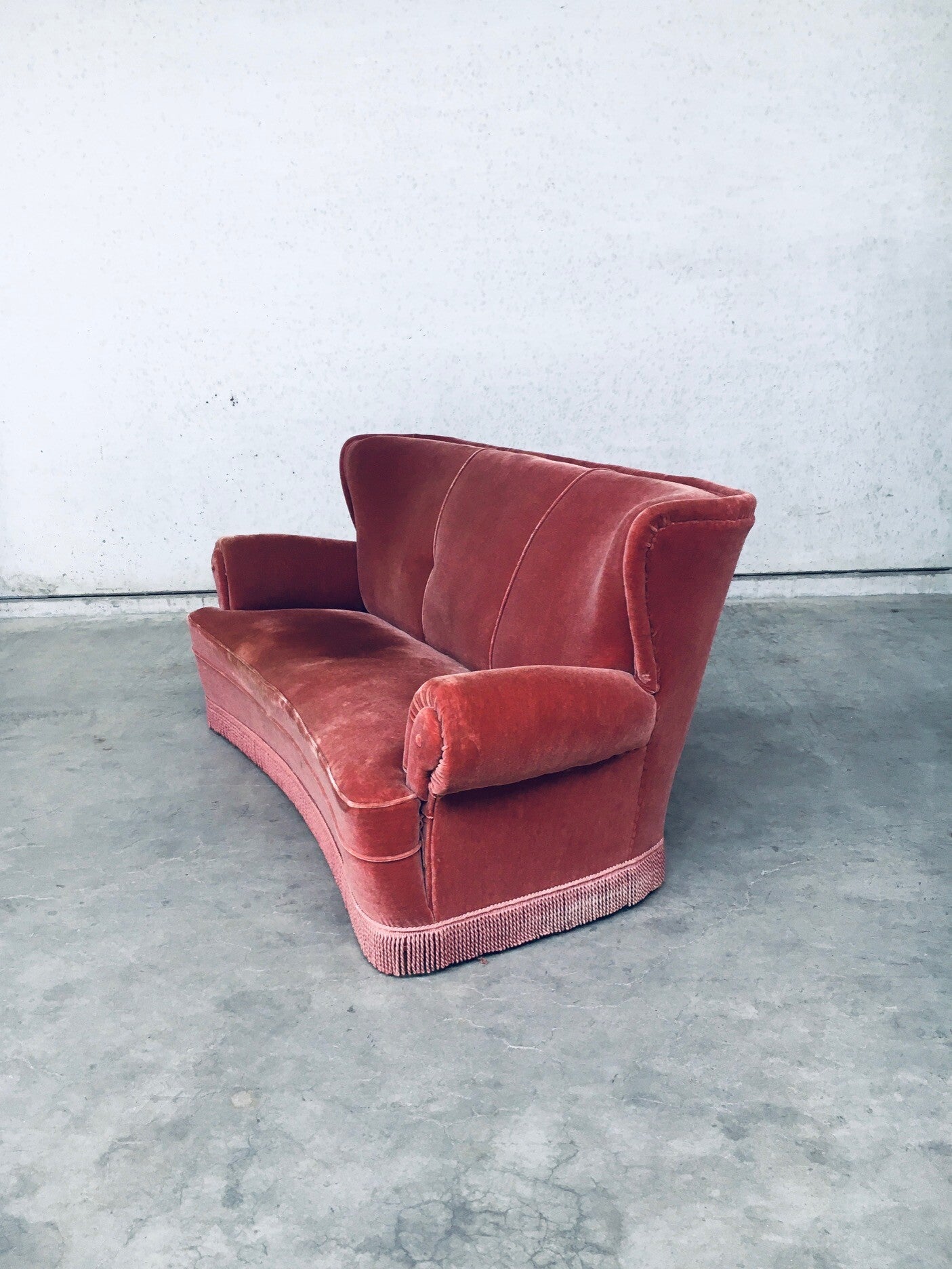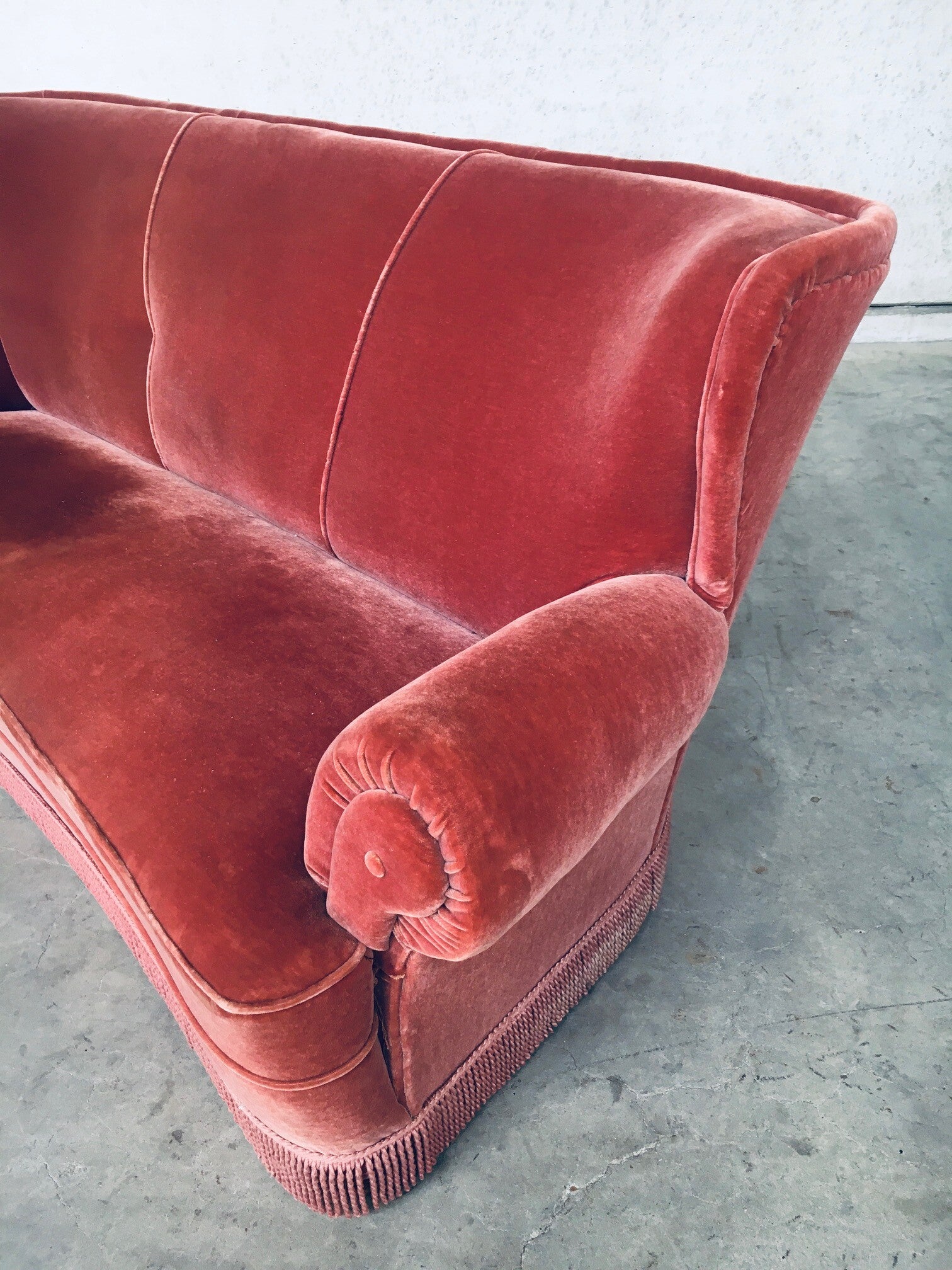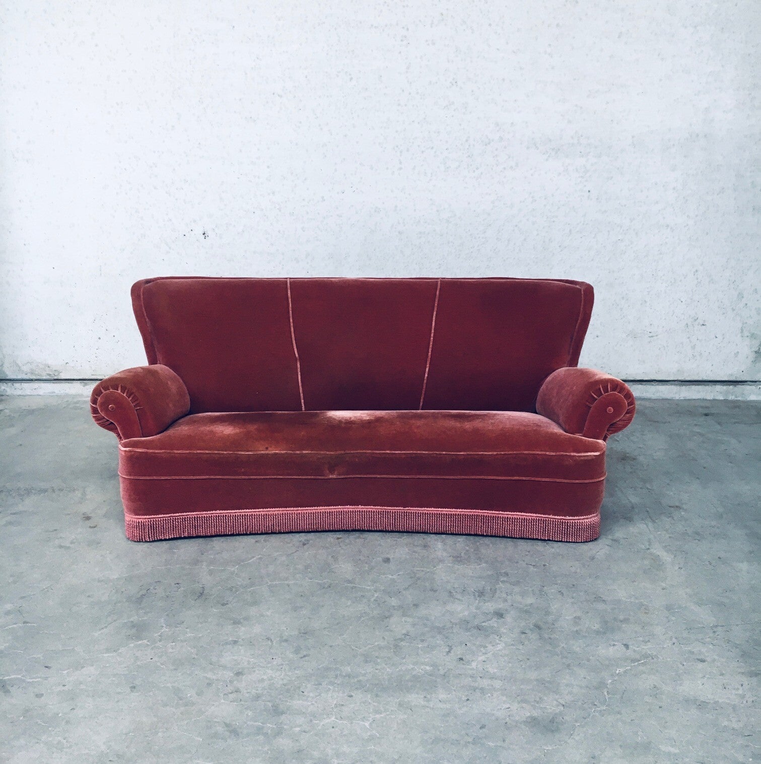 Vintage Art Deco Design Pink Velvet 3 Seat Sofa with Fringe. Made in Italy, 1930's / 40's. Curved large lucious pink velvet three seat sofa with fringed bottom. Spring cushion seating on oak wooden frame. All original very good condition, with minor wear from it's use during all the years. Measures 91cm x 205cm x 92cm.