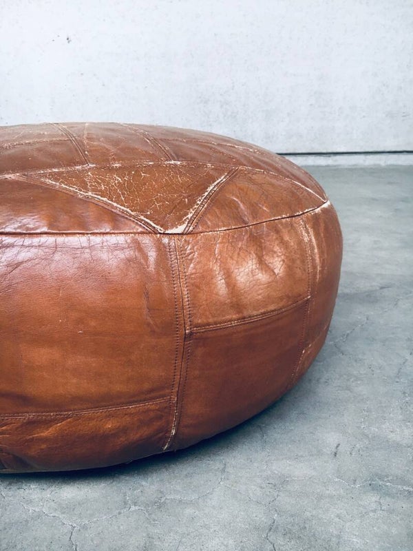 Midcentury XL Leather Patchwork Pouf, 1970's Morocco