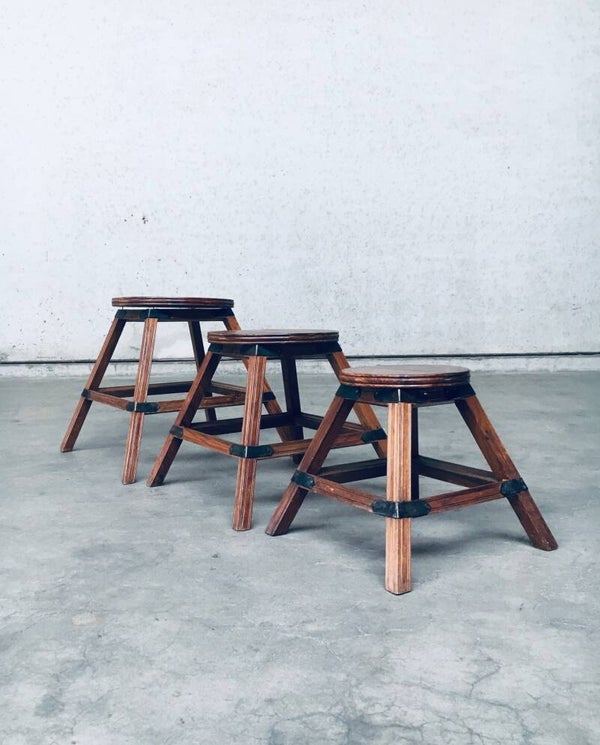 Vintage Handcrafted Wabi Sabi Style Design Nesting Table set of 3. Made in France, 1940's / 50's. Handmade nesting side or plant table set of 3. Oak wood constructed tables with metal reinforcing brackets and plates. The three stools all fit nicely inside each other. They all are nicely patinated from their use and age. They measure: Large: 47cm x 54cm x 54cm, Medium: 39cm x 46cm x 46cm, Small: 33cm x 38cm x 38cm.