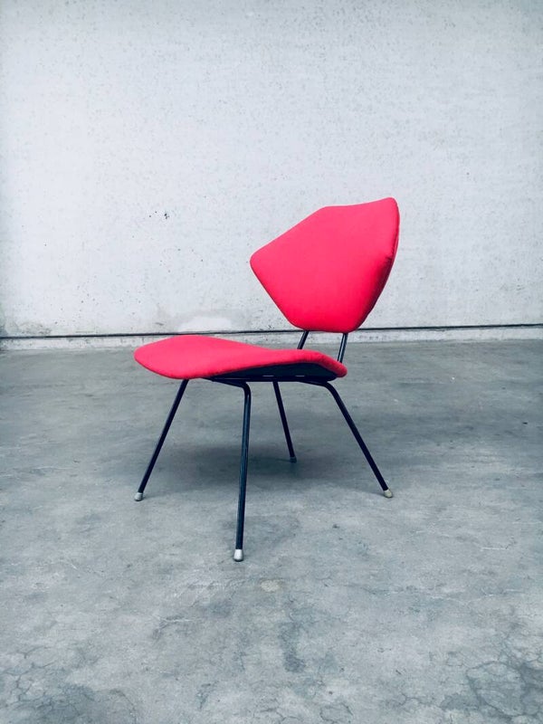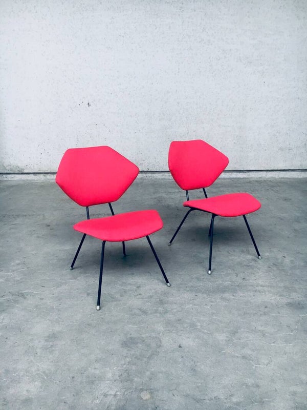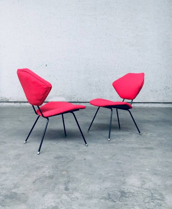 Vintage Midcentury Modern Design Low Chair set of 2 in the style of Augusto Bozzi. Made in Italy, 1950's. Black metal frame with recently reupholstered backrest and seat in red fabric. Nice low lounge side chairs which can be placed in the sitting area aside your sofa. They both are in very good condition. Each measures 75cm x 52cm x 60cm.