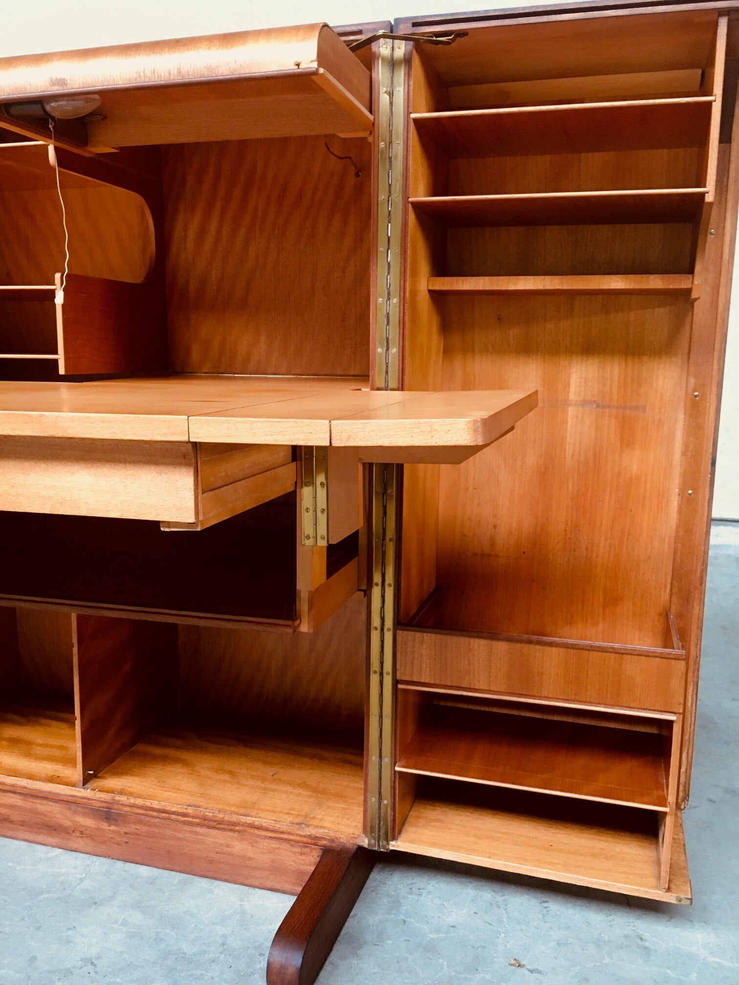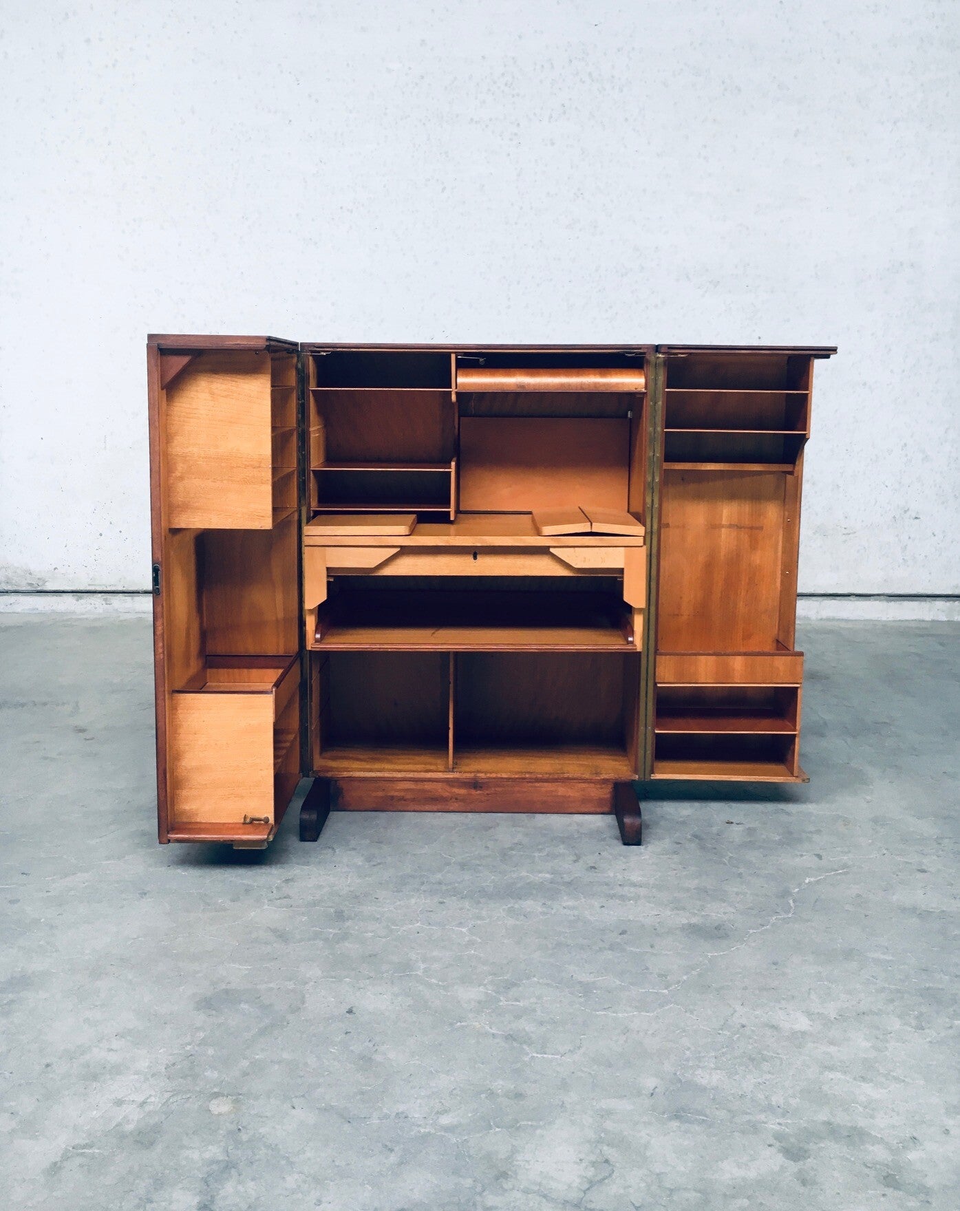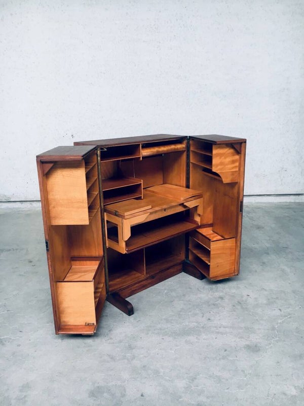 Vintage Midcentury Swiss Design Magic Box Desk by Mummenthaler & Meier. The 'MAGIC BOX' desk or secretaire was designed by Mummenthaler and Meier in Switzerland in the 1950's / 60's. The piece closes completely and can be key-locked (key not included). When opened it has a large maple wood writing top, lit from above by a retractable built-in light operated by pulling a cord. The desk features small retractable shelves, a large drawer, surfaces, and storage compartments. A couple of the small wooden shelves are missiing. Overall good condition. With normal wear for it's age and use. Measures openend: 167 x 75 x 112,5 cm (WxDxH), closed: 82,5cm x 54cm x 112,5cm. (WxDxH).