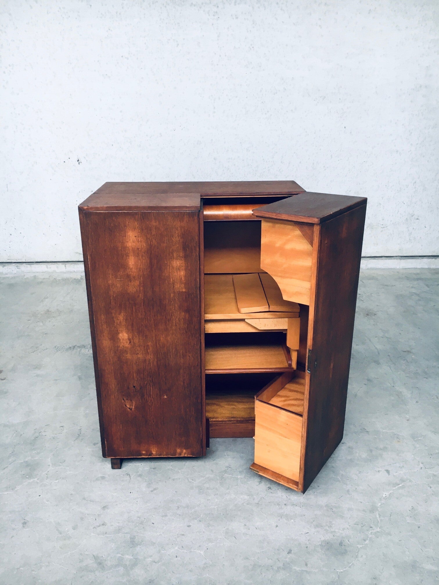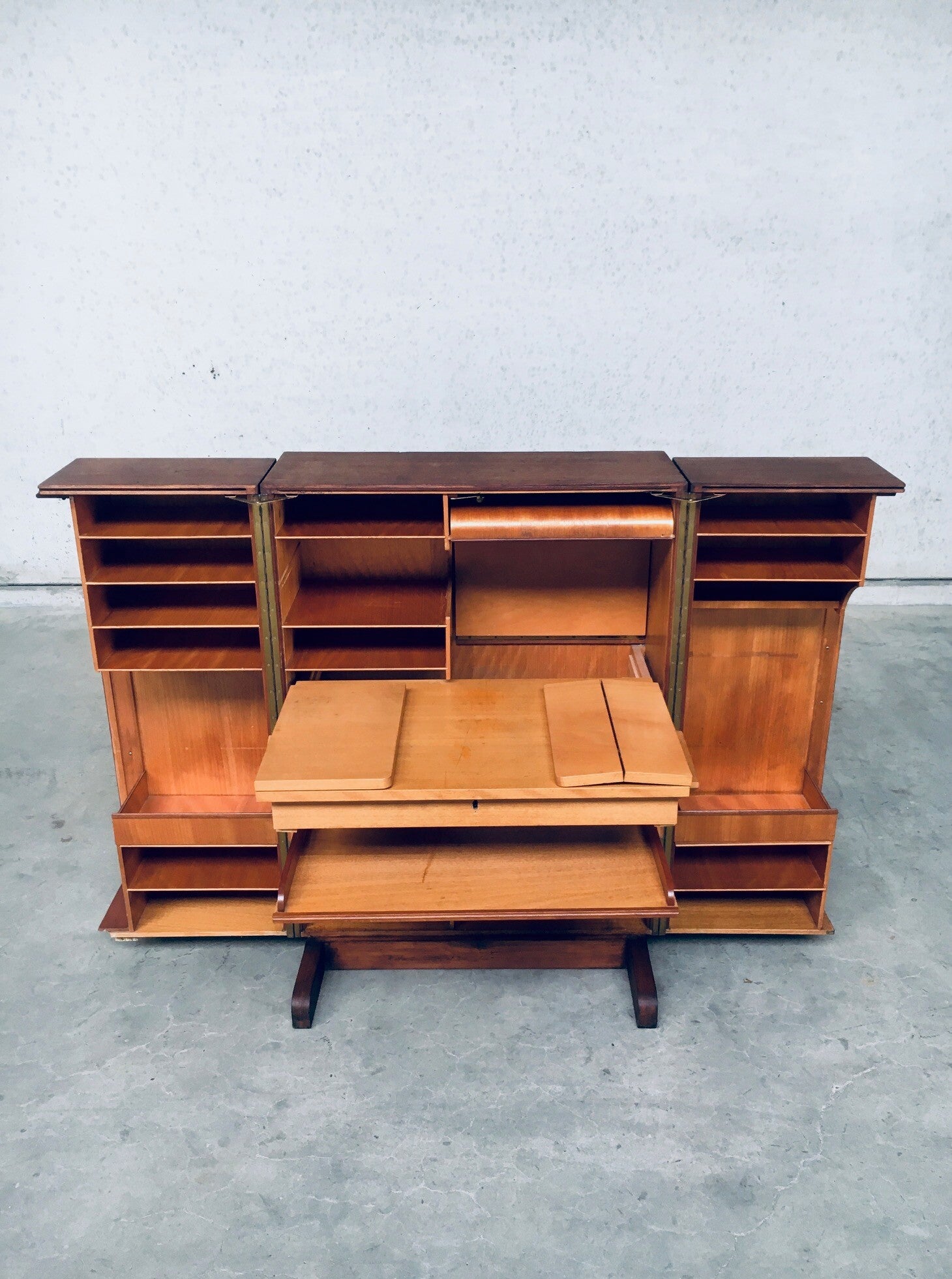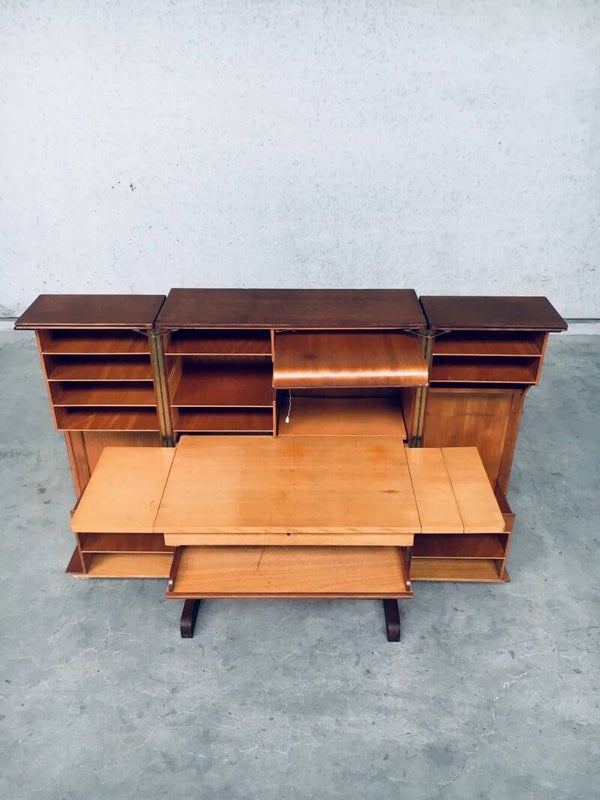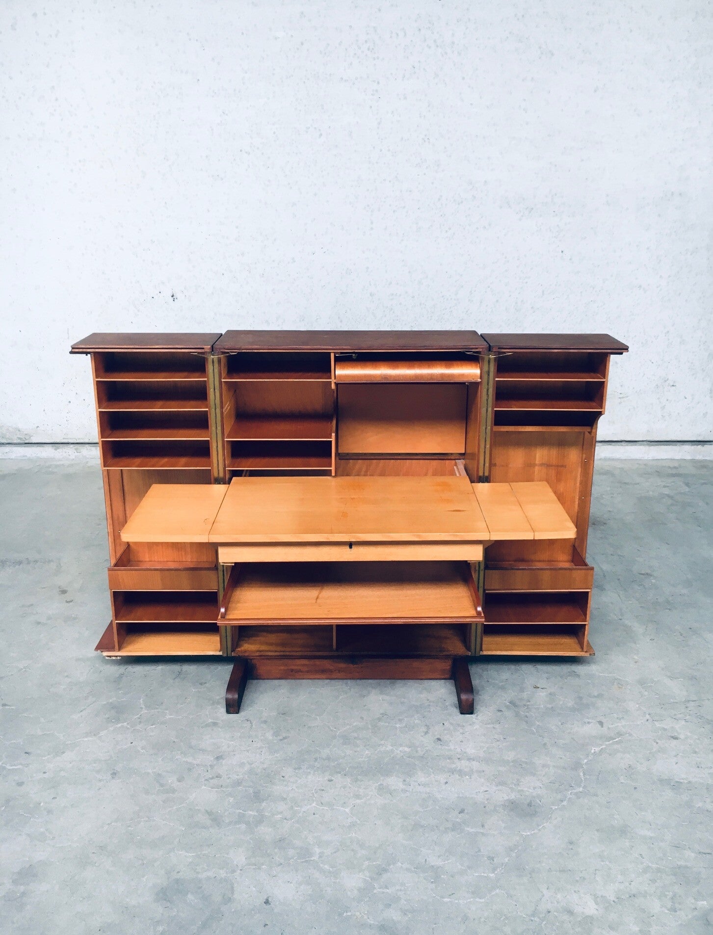 Vintage Midcentury Swiss Design Magic Box Desk by Mummenthaler & Meier. The 'MAGIC BOX' desk or secretaire was designed by Mummenthaler and Meier in Switzerland in the 1950's / 60's. The piece closes completely and can be key-locked (key not included). When opened it has a large maple wood writing top, lit from above by a retractable built-in light operated by pulling a cord. The desk features small retractable shelves, a large drawer, surfaces, and storage compartments. A couple of the small wooden shelves are missiing. Overall good condition. With normal wear for it's age and use. Measures openend: 167 x 75 x 112,5 cm (WxDxH), closed: 82,5cm x 54cm x 112,5cm. (WxDxH).